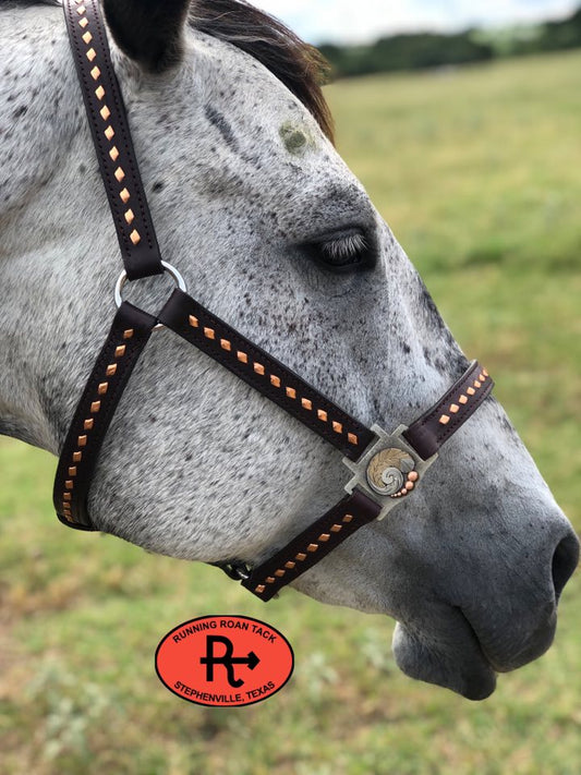 Copper Buckstitch Leather Halter with German Silver Feather Hardware