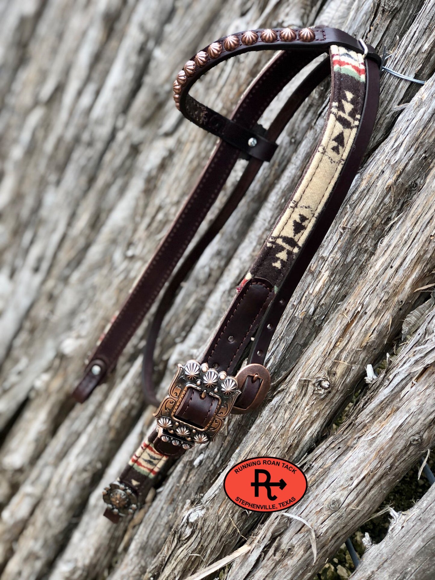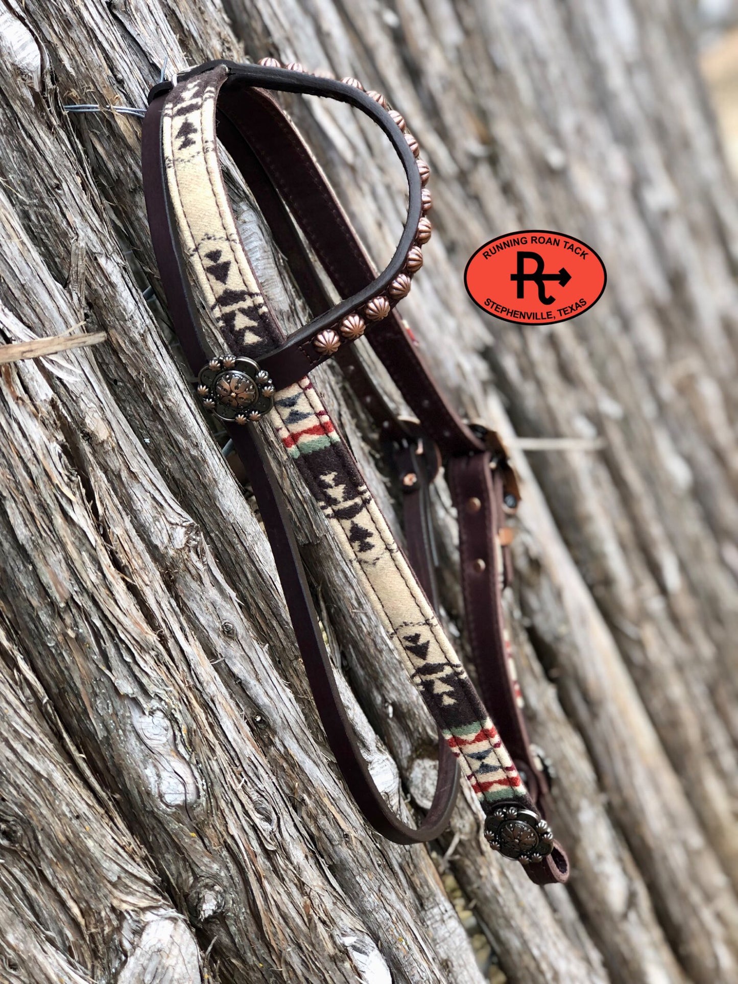 A headstall for the Pendleton® Wool enthusiast! Lined with durable bridle leather and overlaid with genuine Pendleton® Wool. Finished off with Horseshoe Brand Southwest buckle and Mission conchos. Sliding single ear with throatlatch for stability. This headstall adjusts from 39"-43".