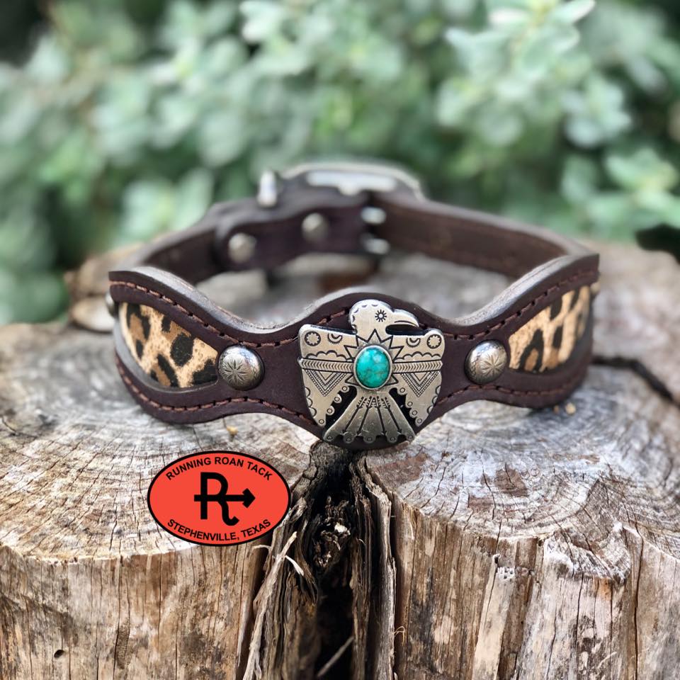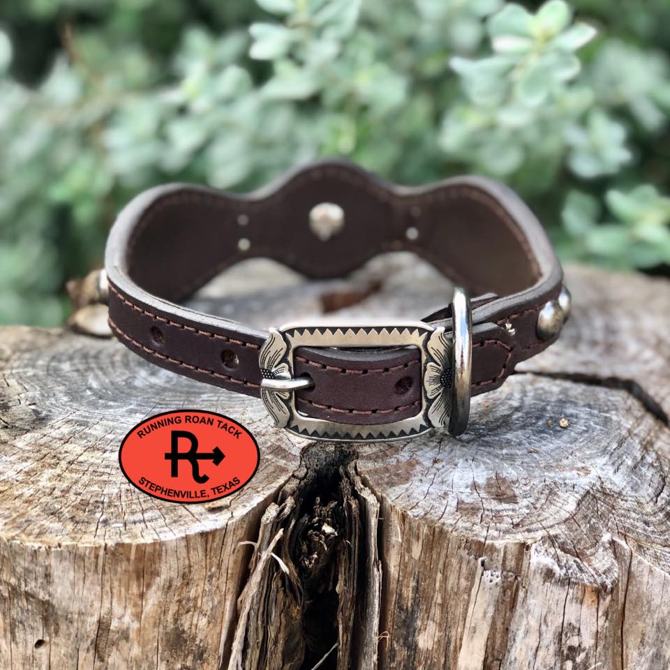 Inlaid dog collar that adjusts from 14"-17" with existing holes. 1-3/4" wide at the widest point. Handmade by Running Roan Tack from chocolate bridle leather. Collar is ornamental only, not suitable for tie out.