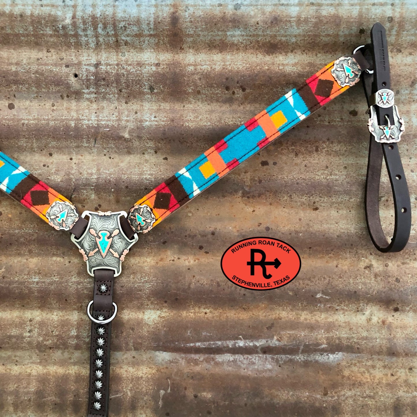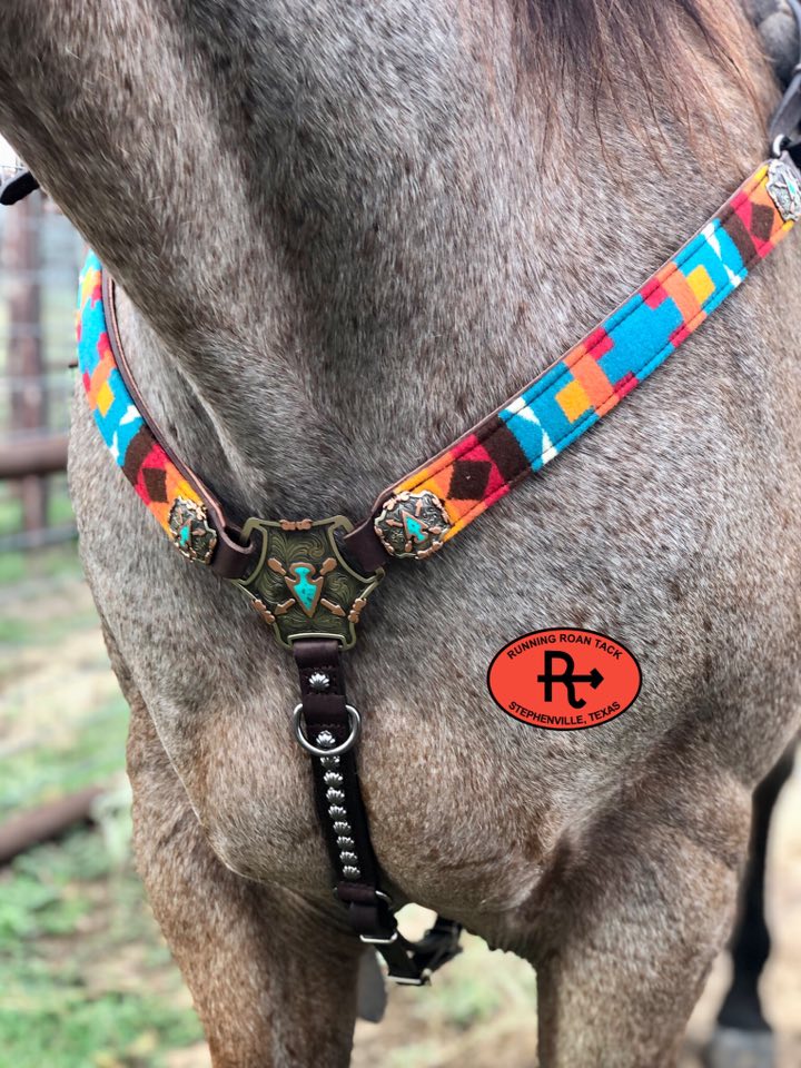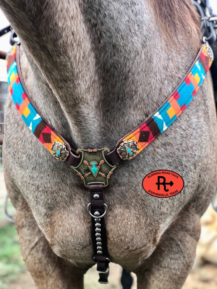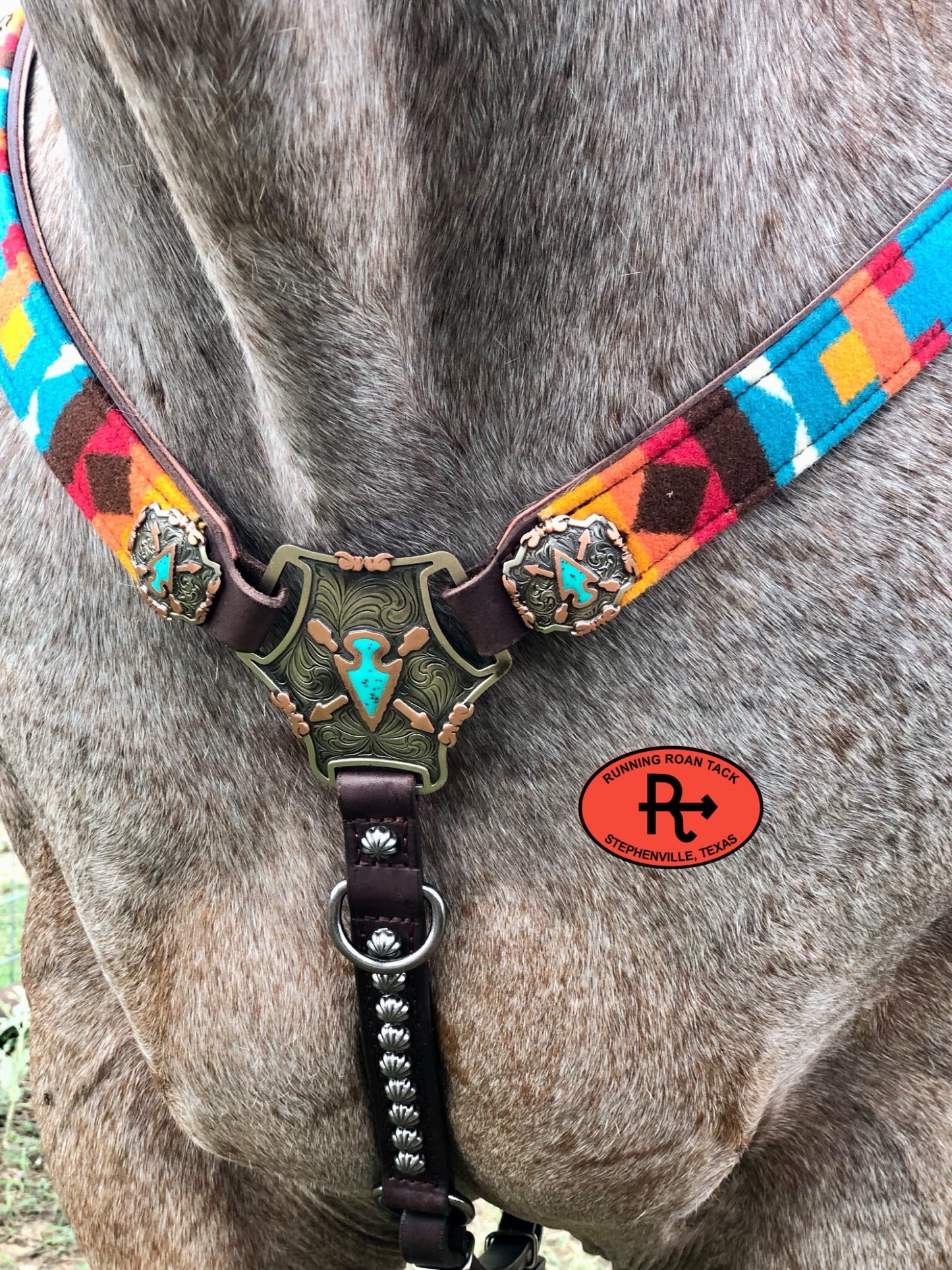 Beautiful breast collar with genuine Condensed Turquoise Pendleton® Wool. Features matching, upgraded german silver martingale plate, conchos and buckles. The edges of the overlaid Pendleton® wool is finished neatly, so it will not fray. The buckles are riveted to the tugs for safety. Adjustable cinch tug. This breast collar is made with our signature dark chocolate bridle leather and is lined with durable, sweat resistant burgundy latigo leather. Handmade from scratch in our workshop in rural Stephenville, TX.