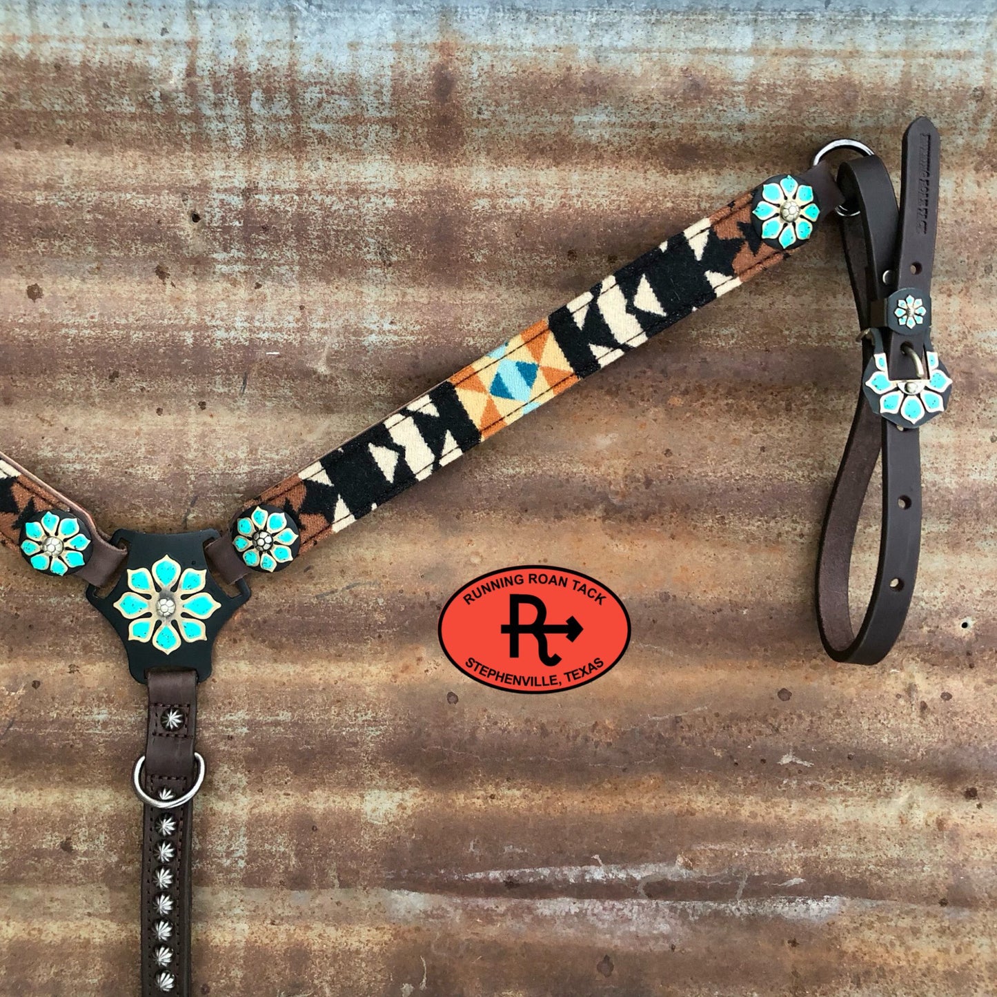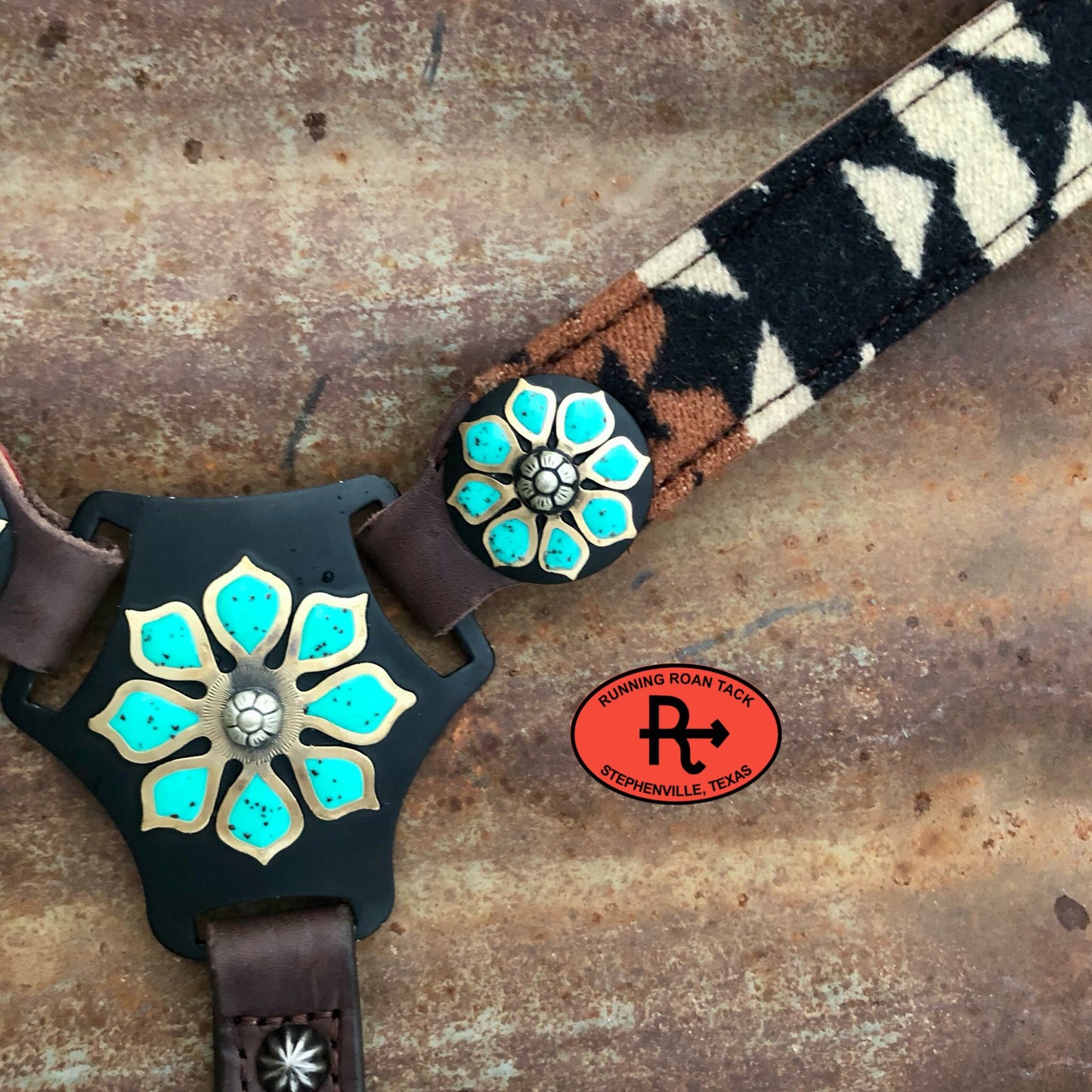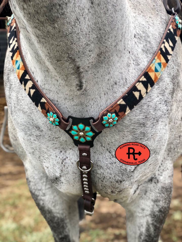 Beautiful breast collar with genuine Overall Black Pendleton® Wool. Features matching, upgraded German silver martingale plate, conchos and buckles. The edges of the overlaid Pendleton® wool is finished neatly, so it will not fray. The buckles are riveted to the tugs for safety. Adjustable cinch tug. This breast collar is made with our signature dark chocolate bridle leather and is lined with durable, sweat resistant burgundy latigo leather. Handmade from scratch in our workshop in rural Stephenville, TX.