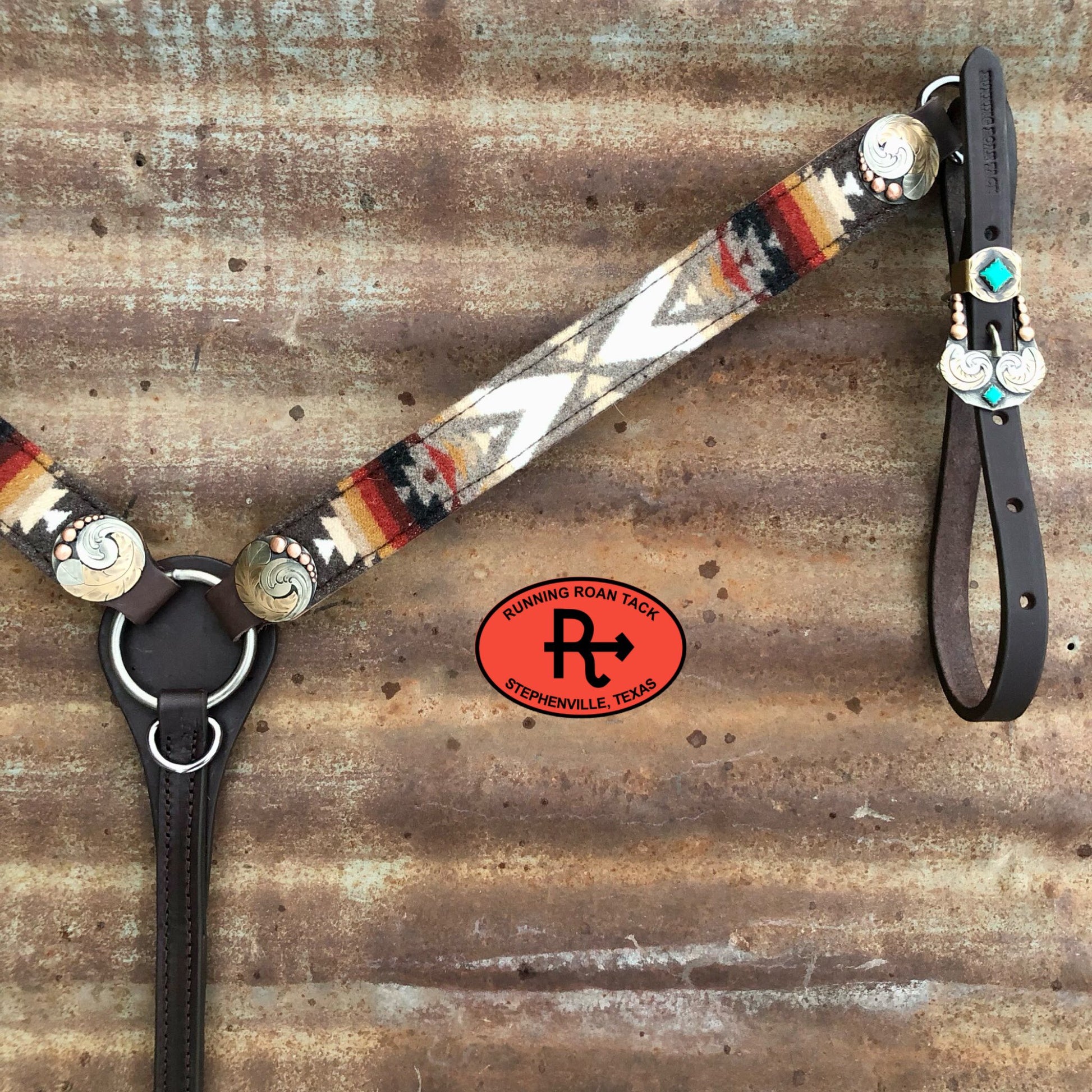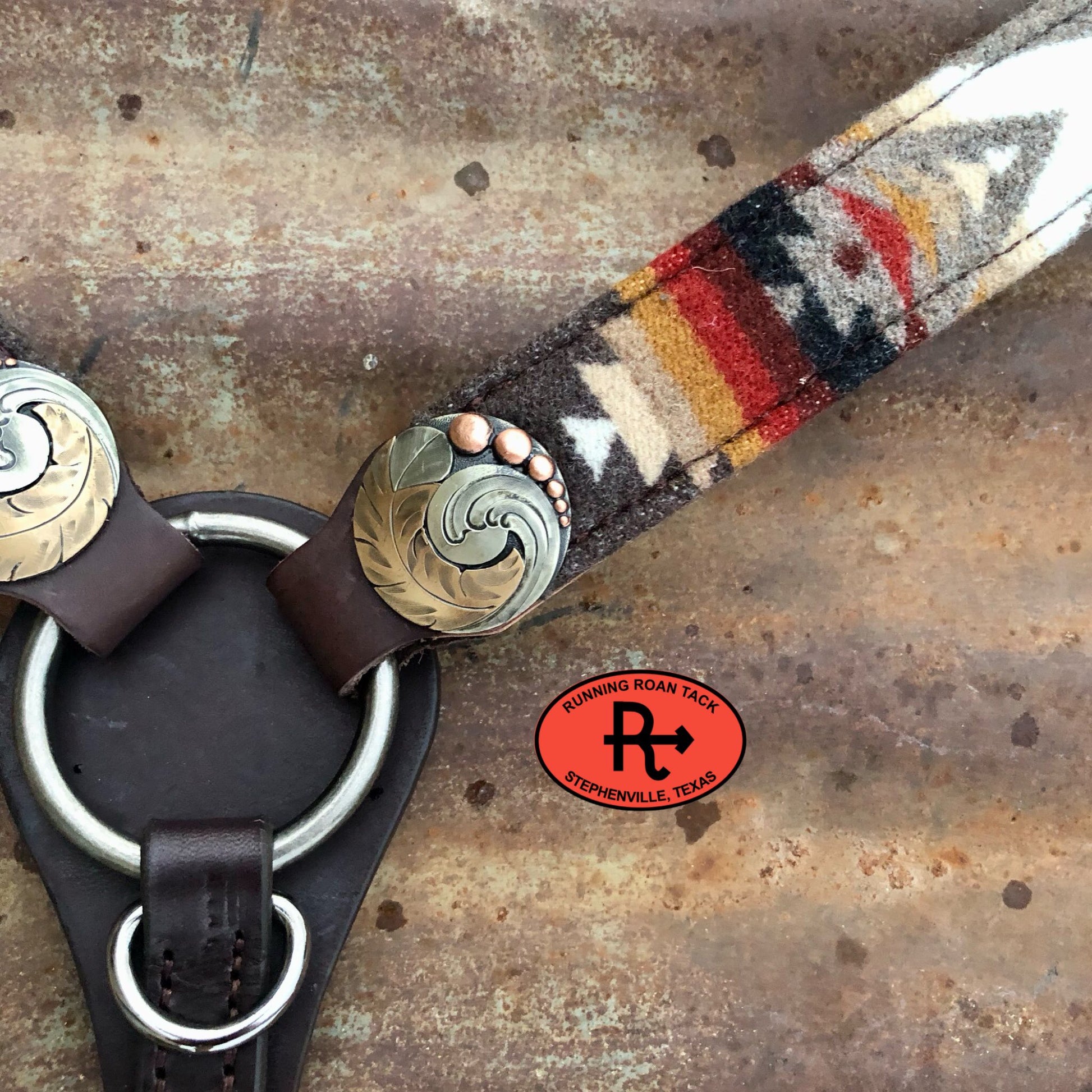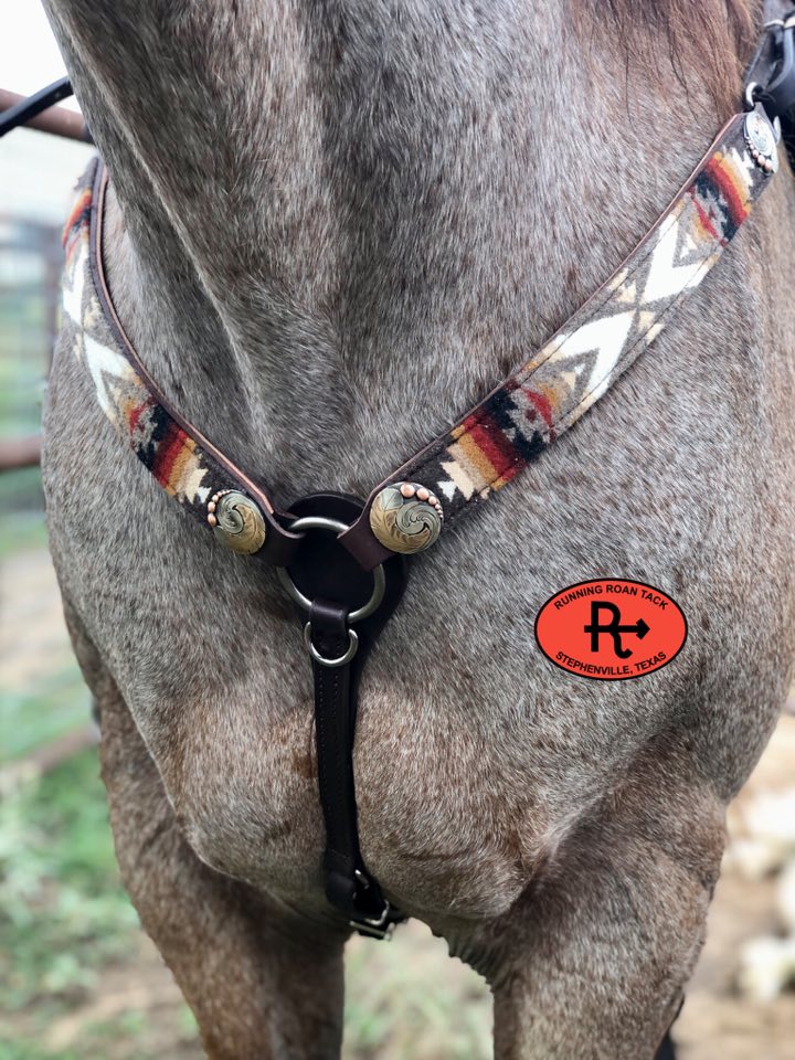 Beautiful breast collar with genuine Pacific Crest Pendleton® Wool. Features matching, upgraded german silver conchos and buckles. The edges of the overlaid Pendleton® wool is finished neatly, so it will not fray. The buckles are riveted to the tugs for safety. Adjustable cinch tug. This breast collar is made with our signature dark chocolate bridle leather and is lined with durable, sweat resistant burgundy latigo leather. Handmade from scratch in our workshop in rural Stephenville, TX.