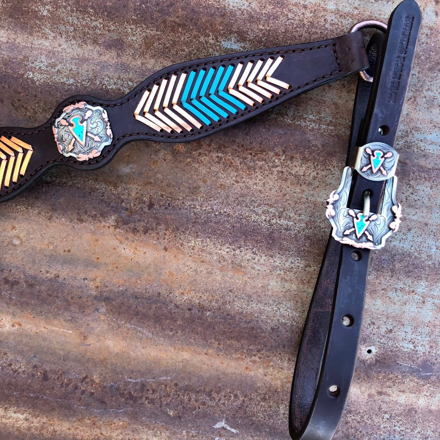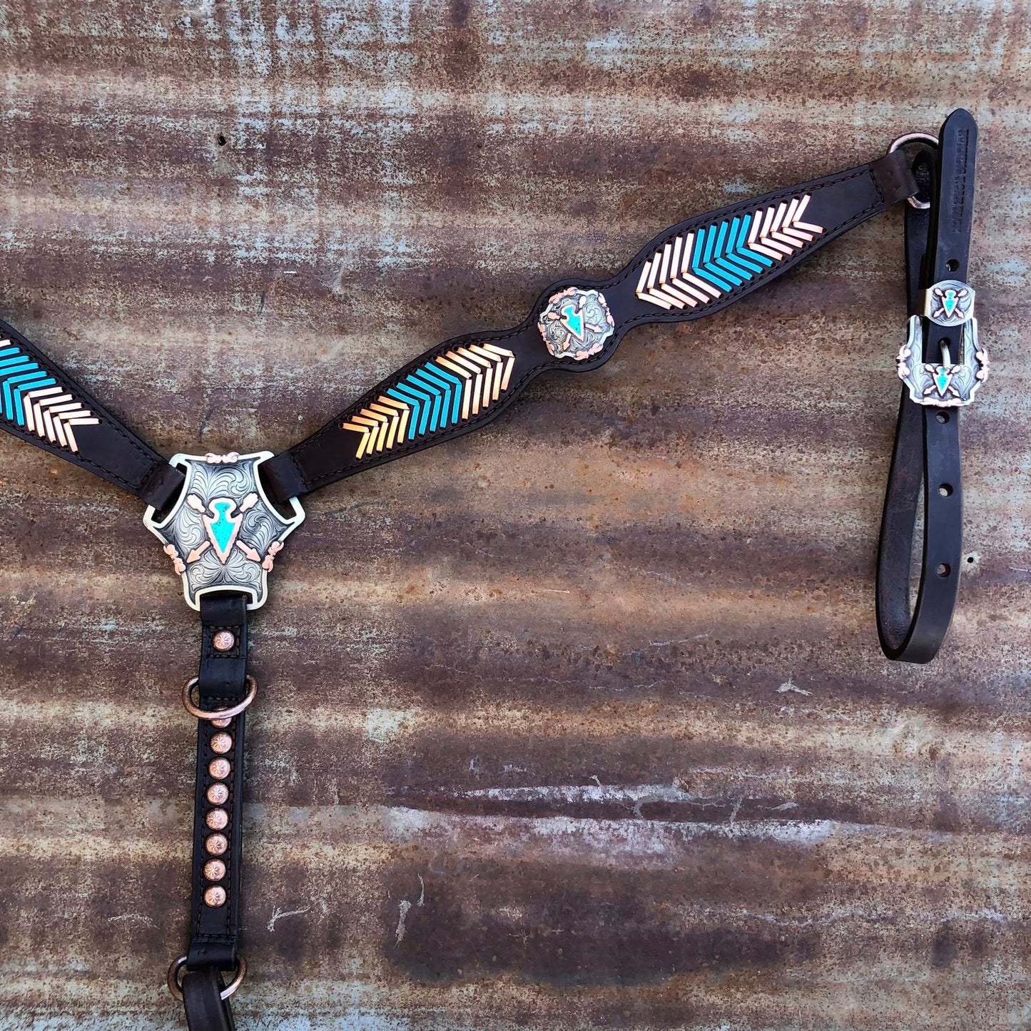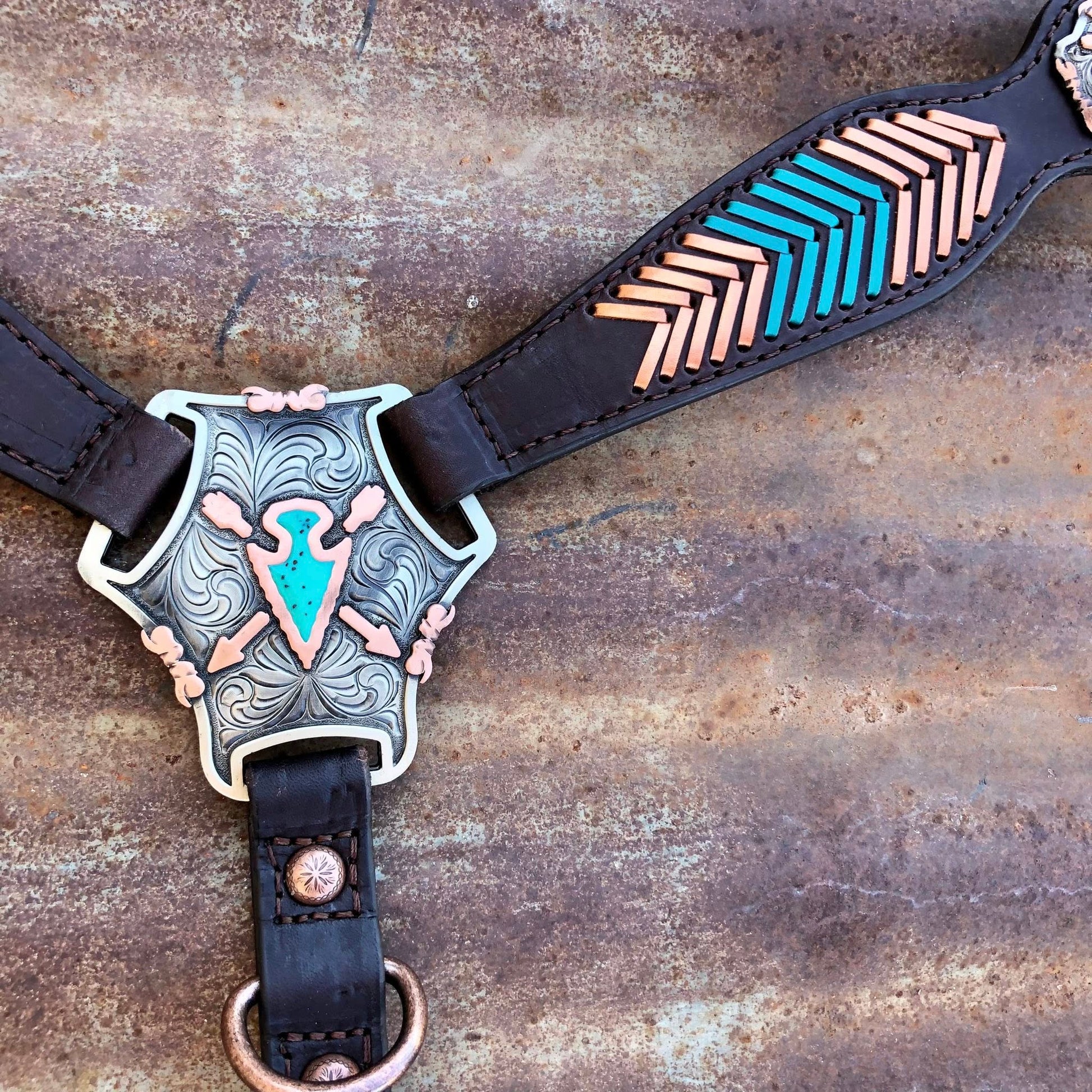 Breast Collar with Turquoise and Metallic Copper Lacing and German Silver Arrowheads