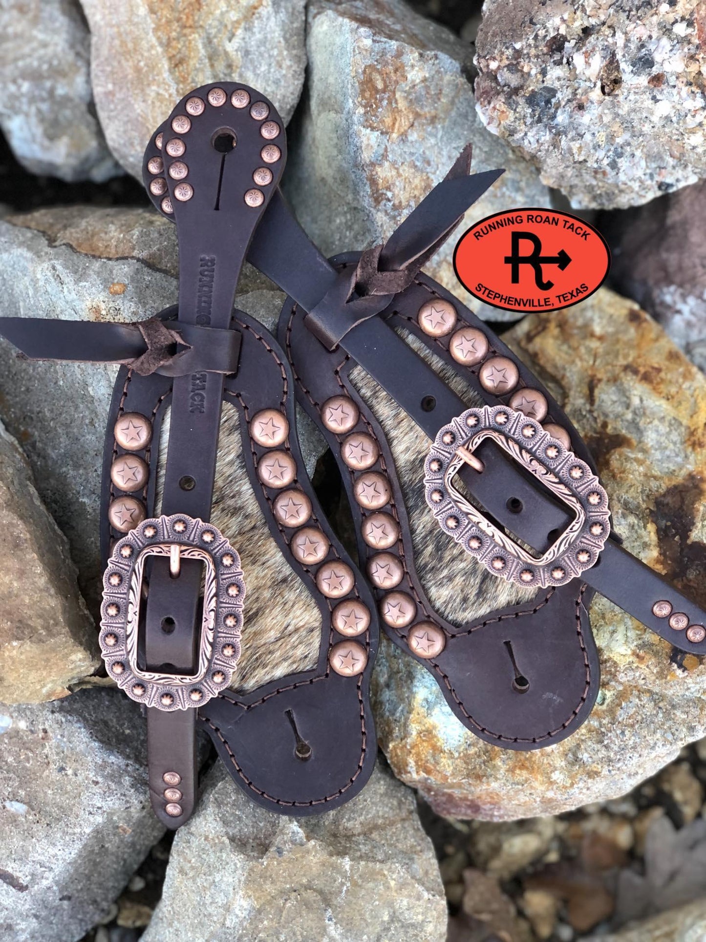 This is our modern take on a classic style! Punchy pull-through buckaroo style spur straps. Made from our signature chocolate bridle leather and inlaid with naturally colored hair on cowhide. Matching adjusting straps and blood knots. Copper star embossed dots and berry cart buckles. Handmade from scratch in our workshop in rural Stephenville, TX.