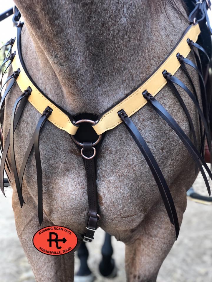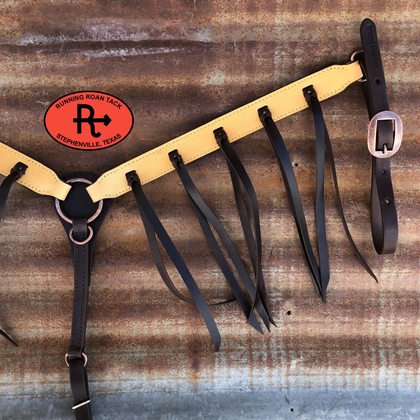 Two tone breast collar in buckskin and chocolate! Simple straight lines and a width of 1-1/2" makes this breast collar versatile and complimentary to any horse. The buckles are riveted to the tugs for safety. Adjustable cinch tug. The super long hand tied fringe is made from our signature chocolate bridle leather so it can be cleaned and conditioned easily. Handmade from scratch in our workshop in rural Stephenville, TX.
