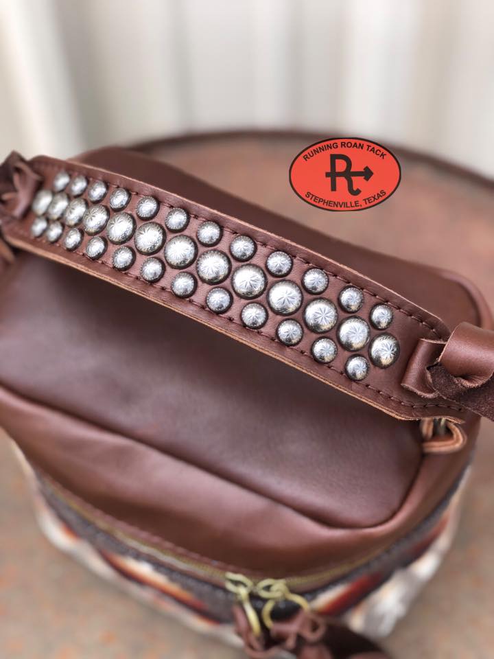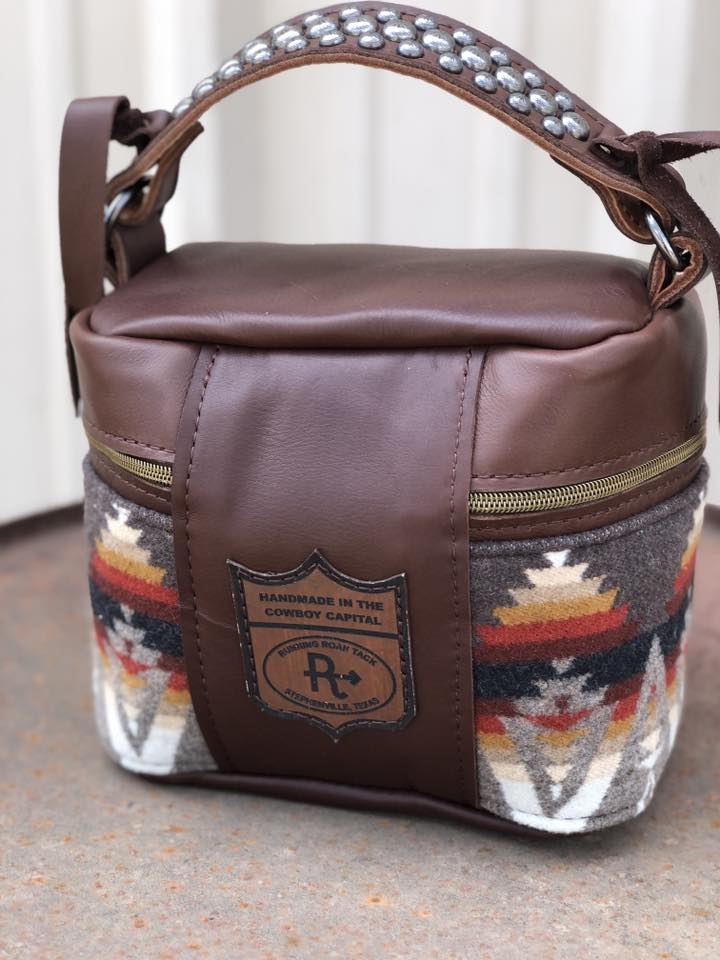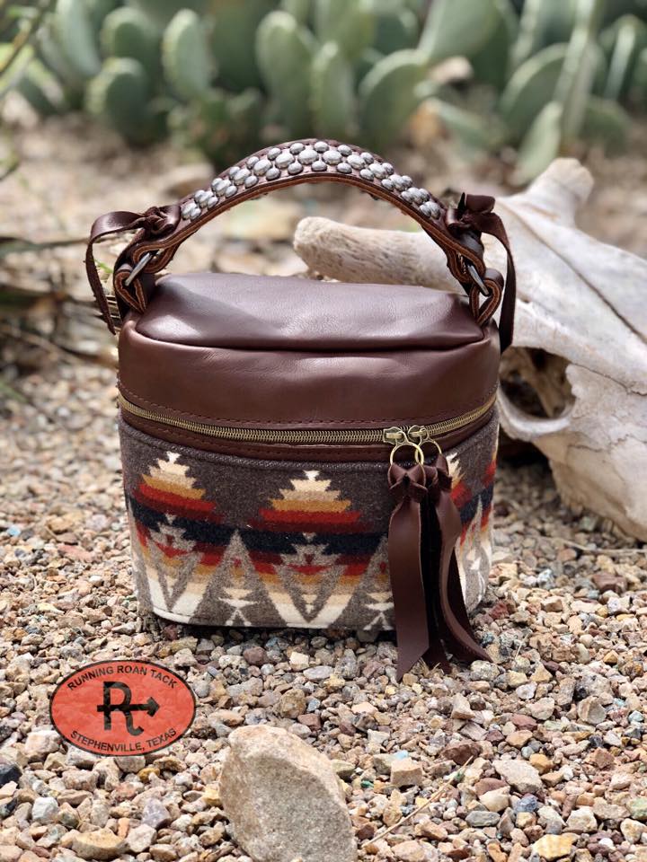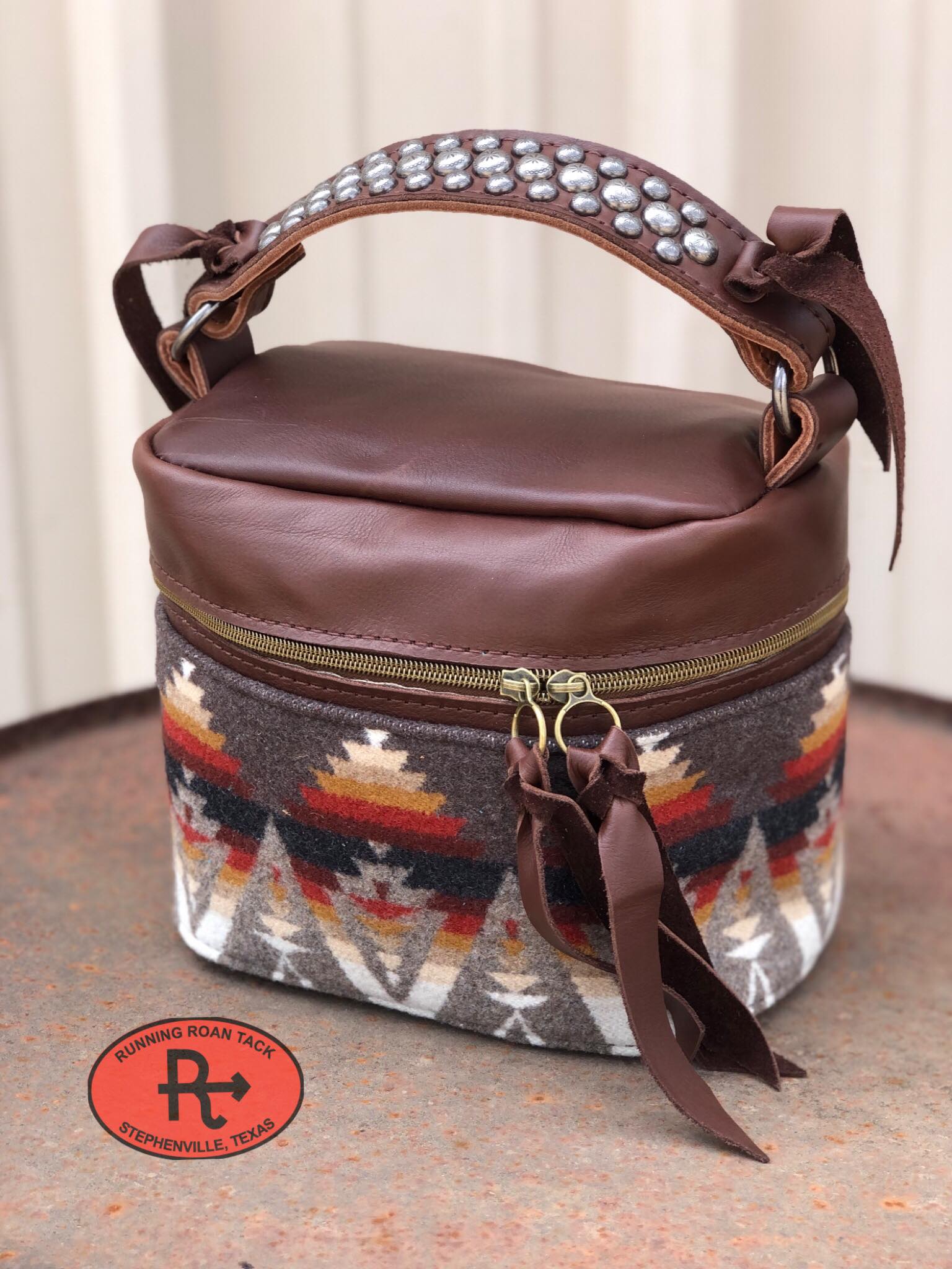 Vintage inspired train case for makeup, toiletries, anything you need to take with you in style. Made from beautiful leather and genuine Pendleton® wool. Handle is decorated with metal dots. This handy case measures 8" tall, 8" long and 6" wide. Double pull zipper for easy access. Leather zipper pulls. Lined with waterproof canvas for easy clean up.