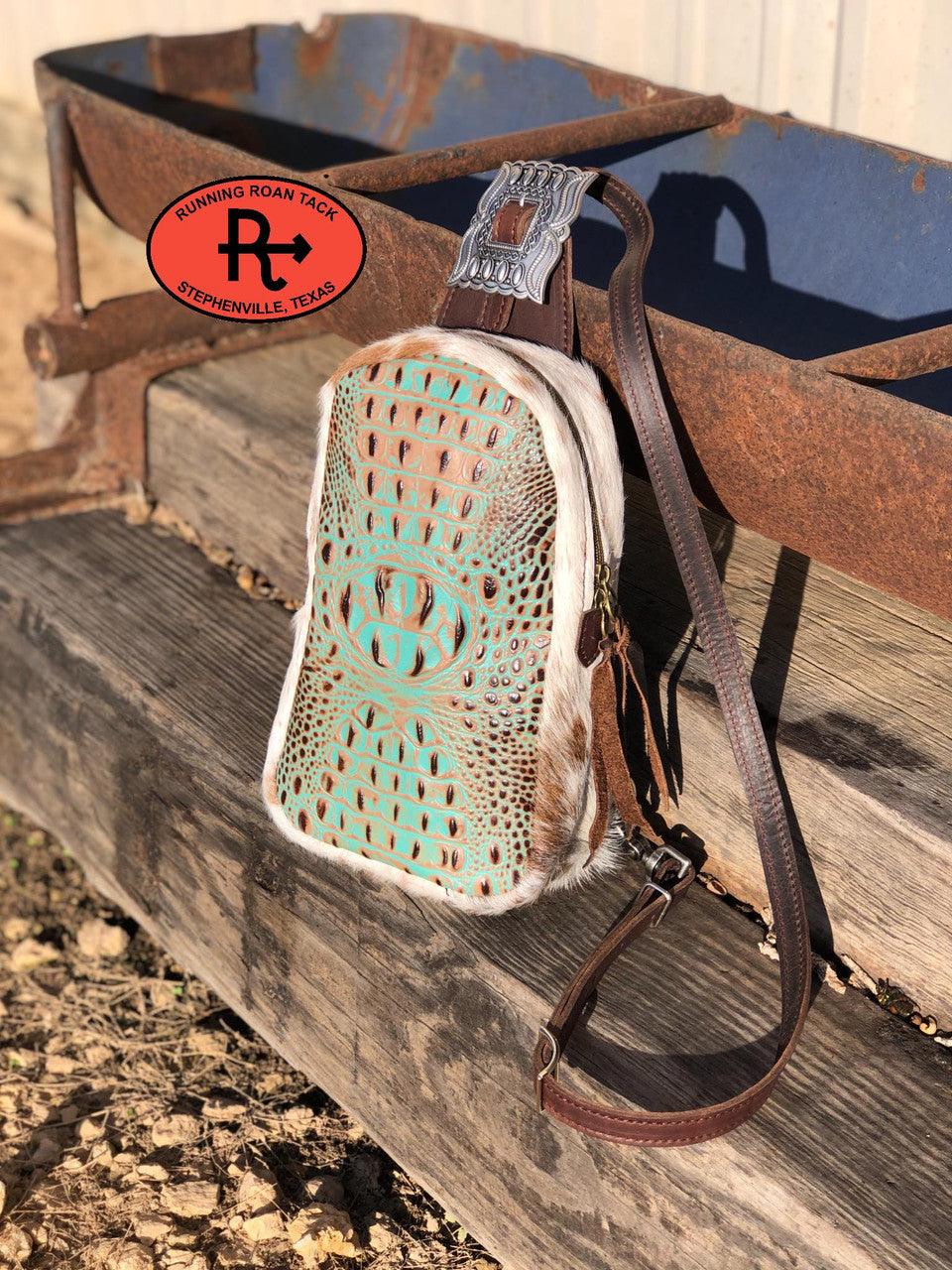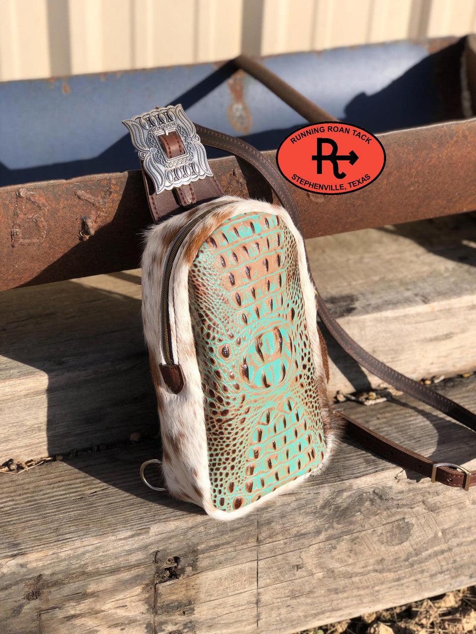 Designed and handmade by Running Roan Tack in Stephenville, Texas. Made with mint croc embossed leather with a speckled hair on cowhide gusset! A handy slingbag that is versatile and easy to wear! Wear it across your front or across your back. Zipper top closure to keep your contents secure. Attachment ring on each side, so you can wear this over either shoulder comfortably. The length of the strap is adjustable. The interior of this bag is neatly lined with durable, easy to clean waterproof canvas and features two credit card slots. Back of bag features a large open pocket, the perfect place for your phone so you can access is easily! Reinforced in all the right places! This bag measures approximately 12" x 7" x 3" wide. This bag was designed and handcrafted to be functional, durable AND gorgeous!