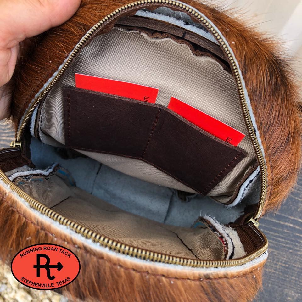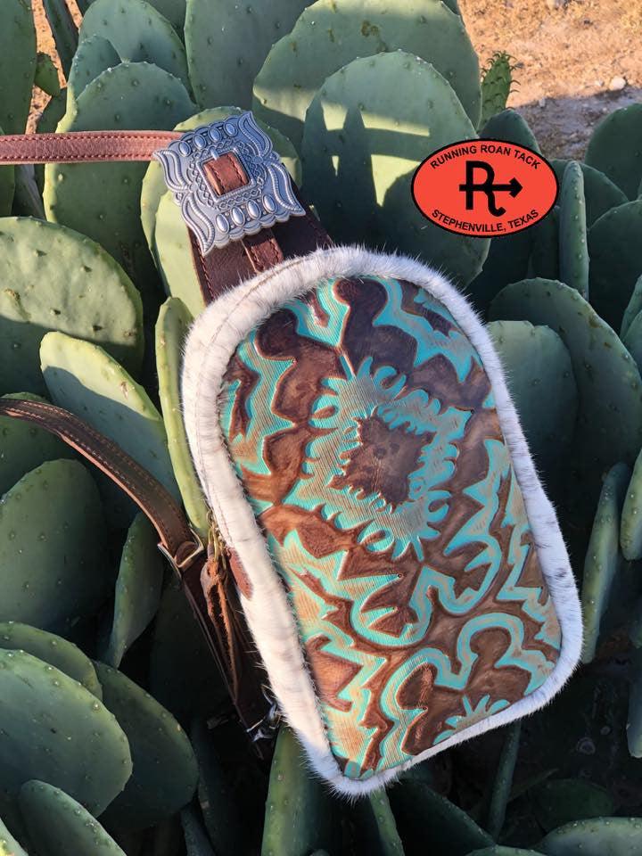 Designed and handmade by Running Roan Tack in Stephenville, Texas. Made with turquoise Boot Top embossed leather! A handy slingbag that is versatile and easy to wear! Wear it across your front or across your back. Zipper top closure to keep your contents secure. Attachment ring on each side, so you can wear this over either shoulder comfortably. The length of the strap is adjustable. The interior of this bag is neatly lined with durable, easy to clean waterproof canvas and features two credit card slots. Back of bag features a large open pocket, the perfect place for your phone so you can access is easily! Reinforced in all the right places! This bag measures approximately 12" x 7" x 3" wide. This bag was designed and handcrafted to be functional, durable AND gorgeous!