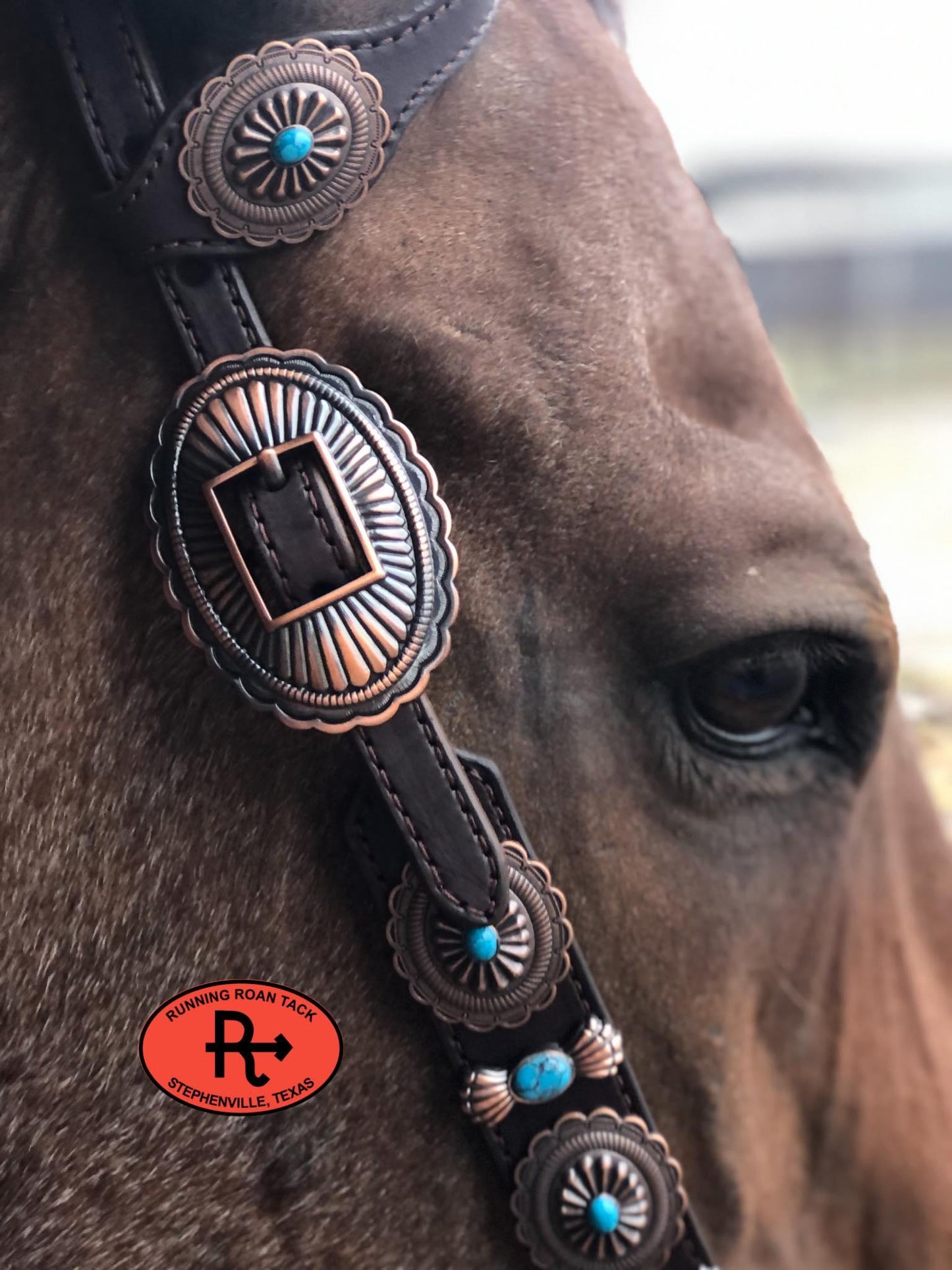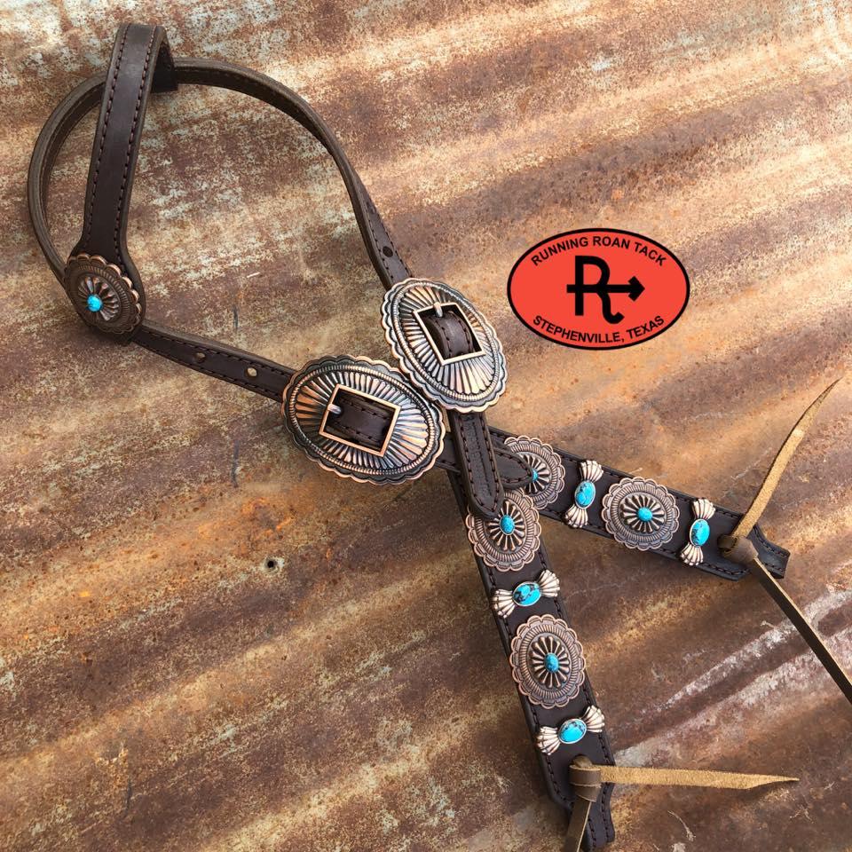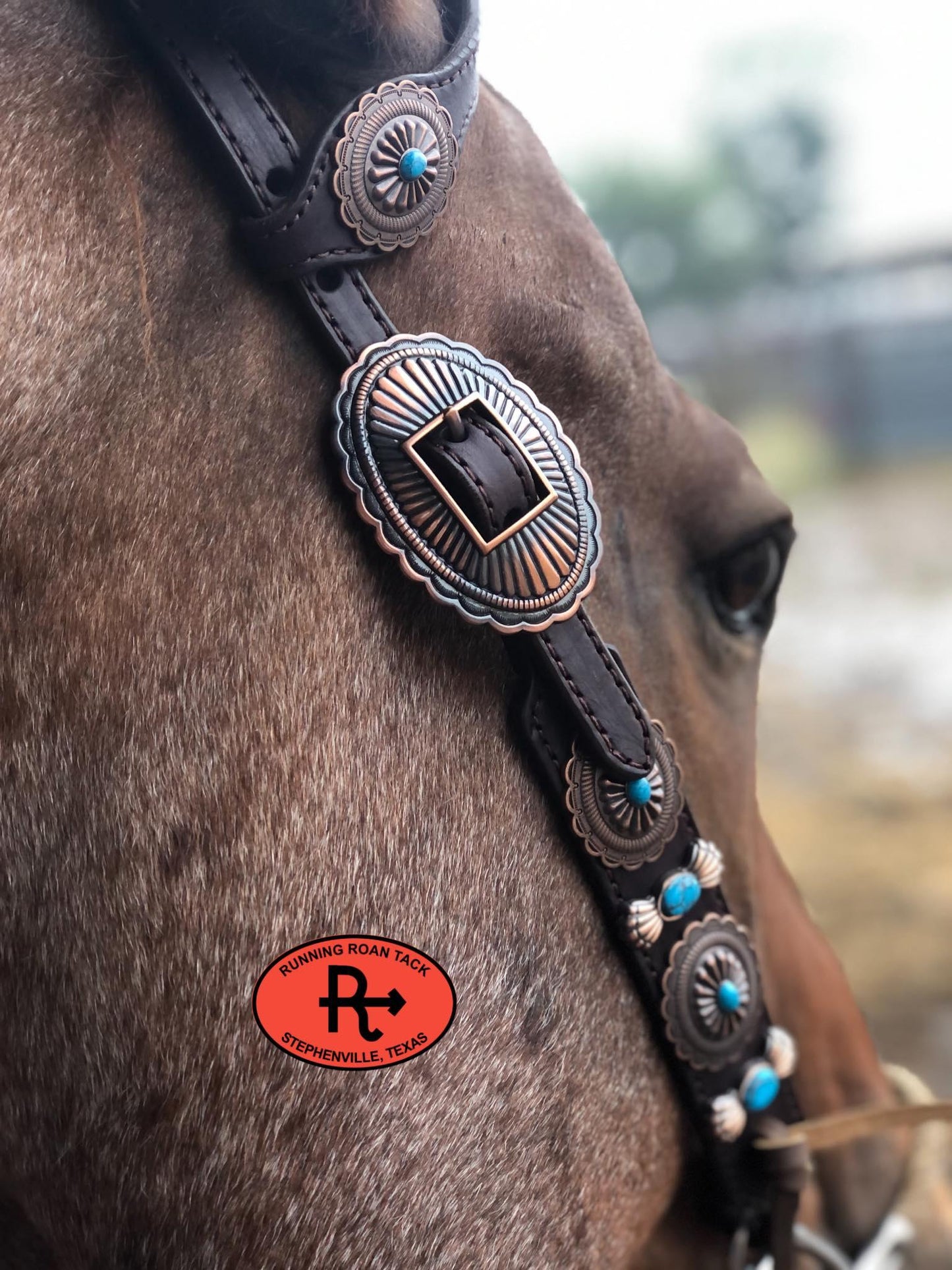 Chocolate headstall with southwest conchos! Headstall has a single ear and is standard size. These conchos are nickel reproductions, not authentic. Simple straight lines to be complimentary to any horse's head. The buckles are riveted on for safety. Oil tan ties at bit ends. Handmade from scratch in our workshop in rural Stephenville, TX.