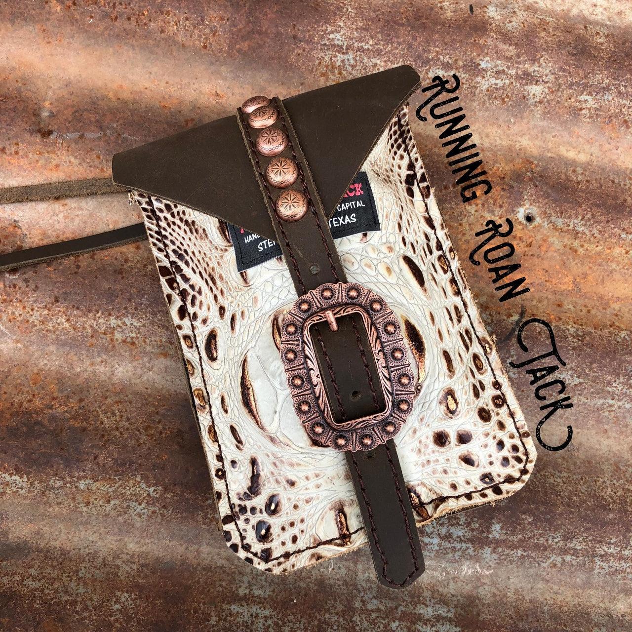 Copper Tipped Croc Mini Saddle Bag with Your Choice of Buckle and Fringe for Phone, Keys, Roping Powder, etc