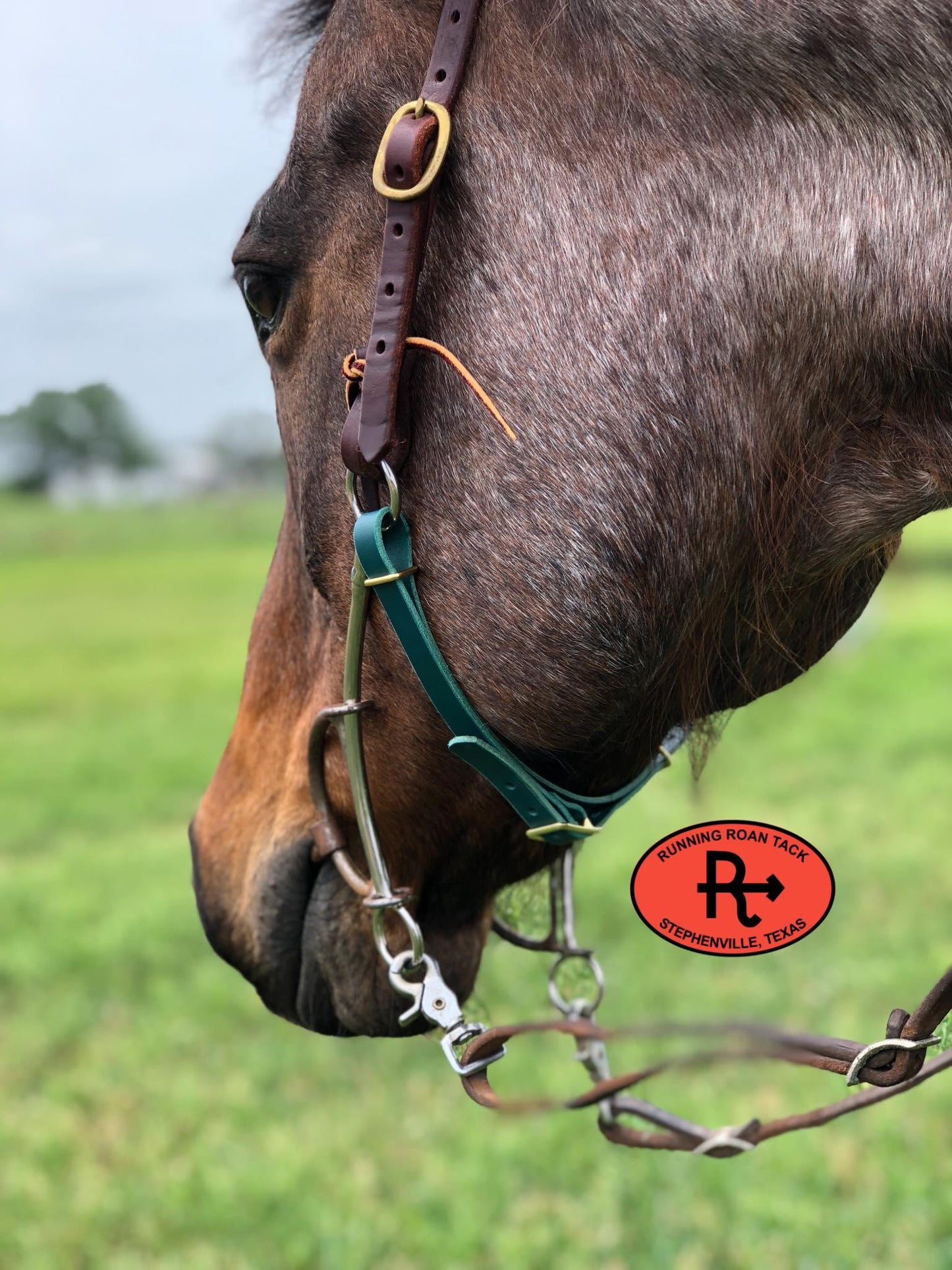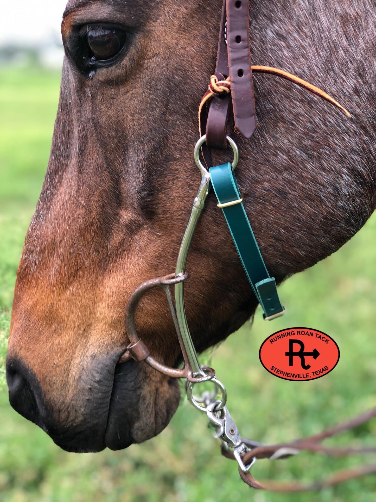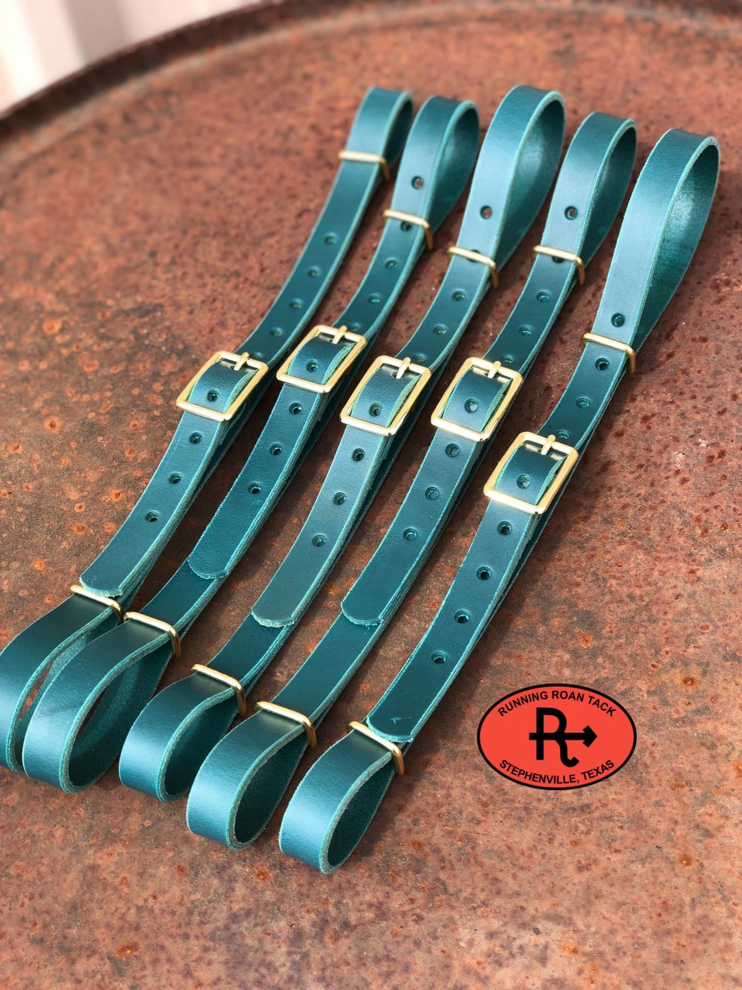Extra long leather curb strap engineered for barrel racing gag bits or similar bits with long purchases. 5/8" wide, brass hardware for durability. Curb strap adjusts from 12"-15" with existing holes. Made with rich turquoise bridle leather for a fun pop of color. Lots of holes spaced closely, so you can get just the right adjustment. Leather curbs are mild, easy to adjust and can add stability to very long shanked bits. Long leather curbs like these are hard to find!