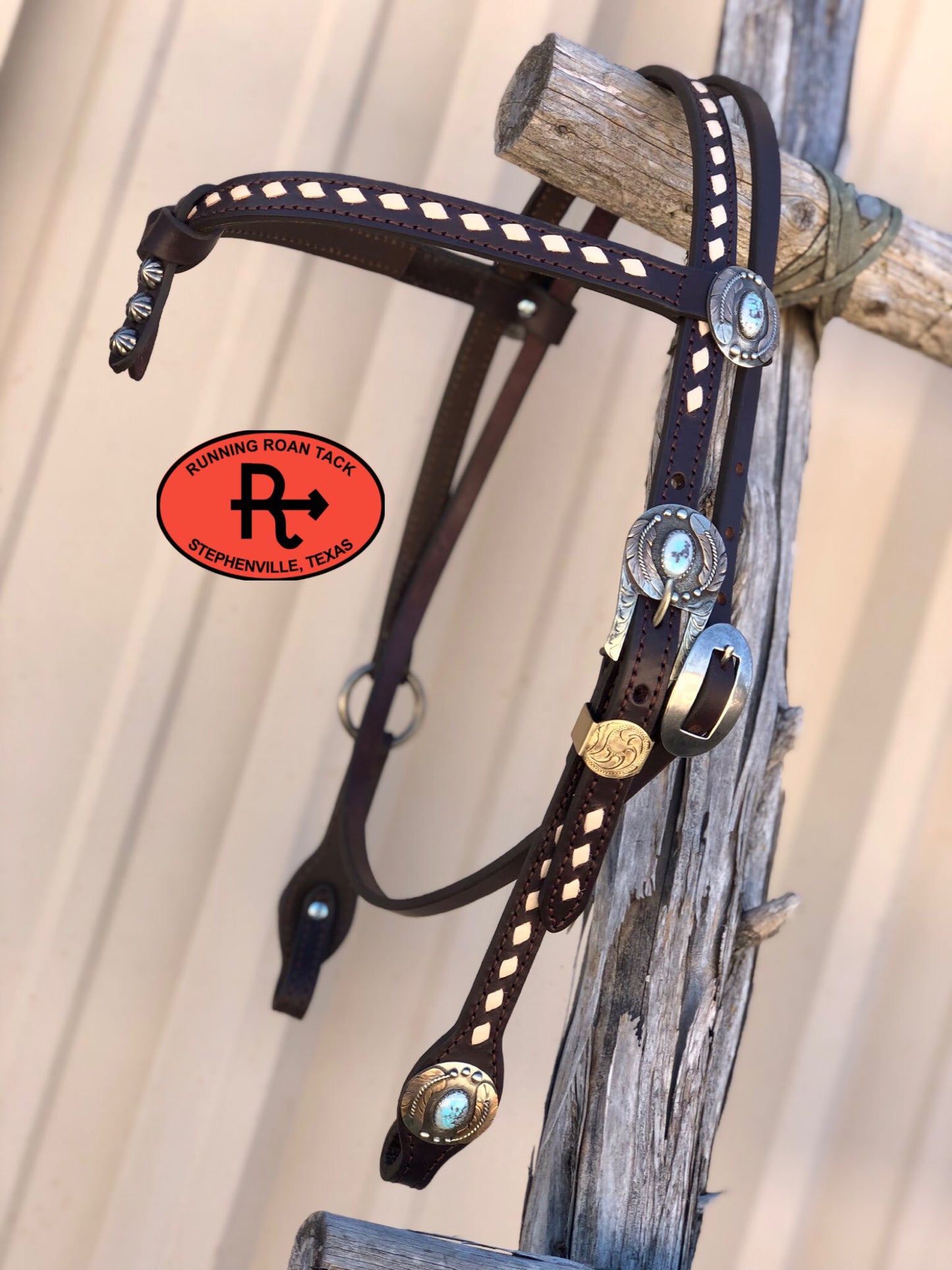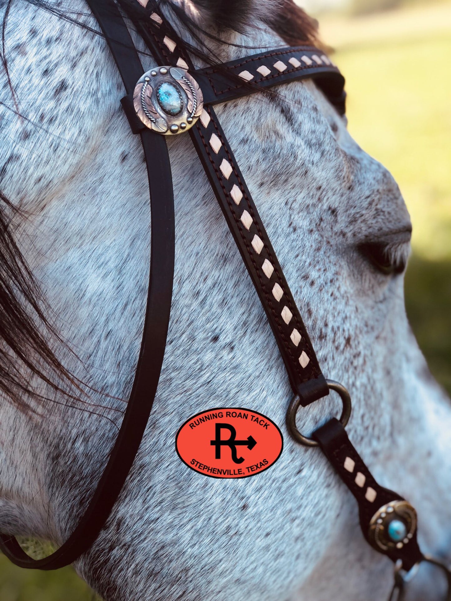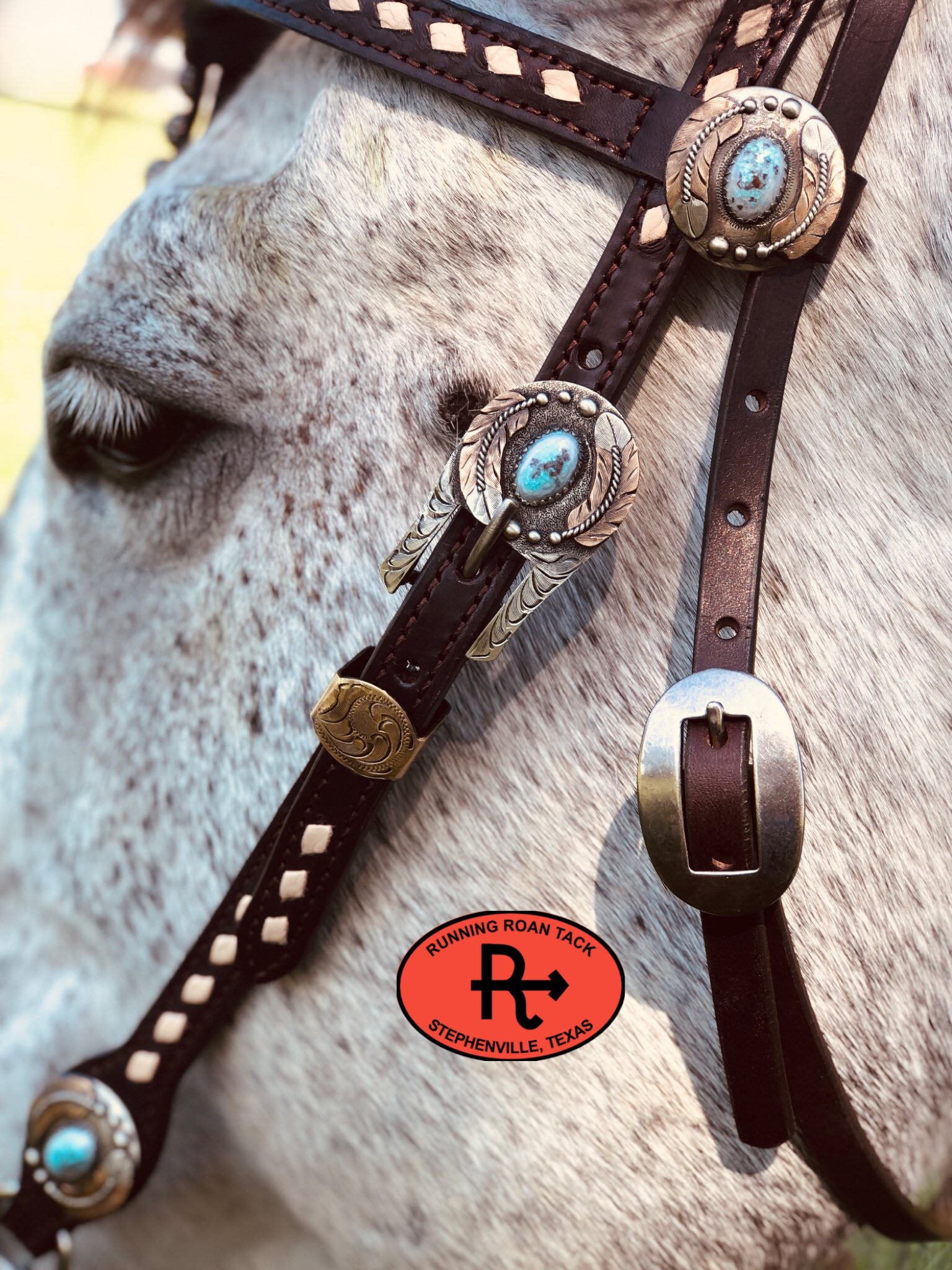 A beautiful headstall handcrafted by Running Roan Tack. Chocolate leather with German silver hardware with feathers and faux turquoise. One ring on the off side of this headstall makes it interesting and punchy. This headstall adjusts from 38"-42" overall length.