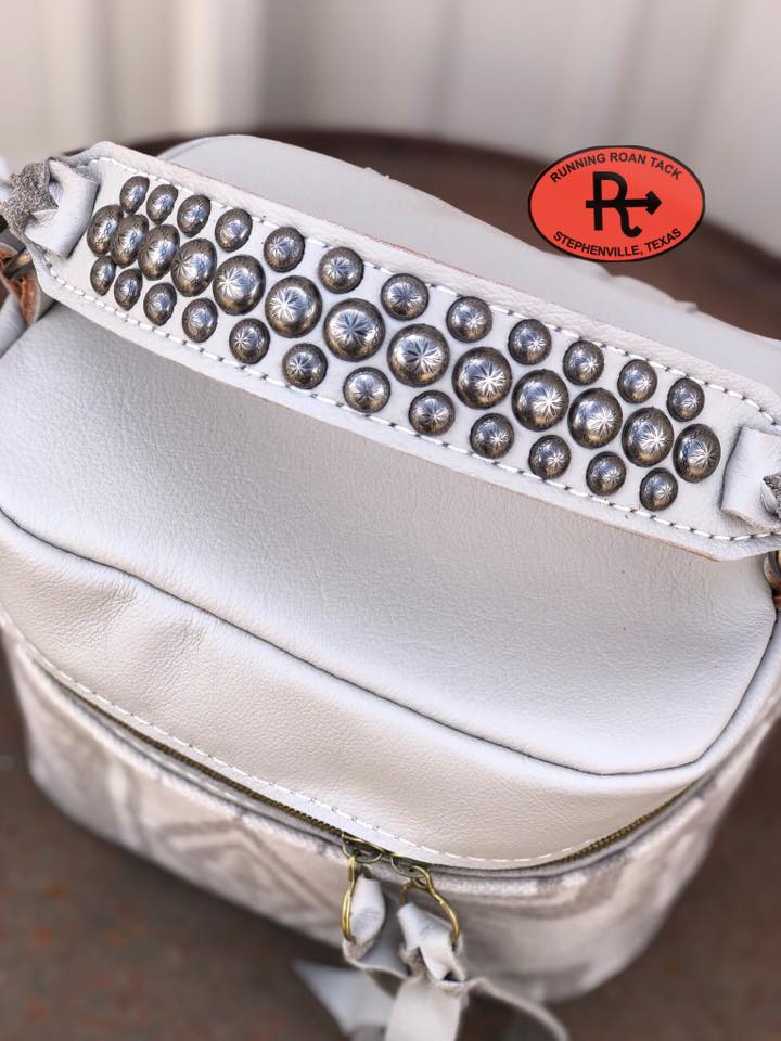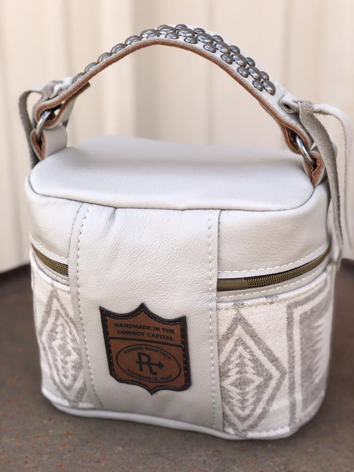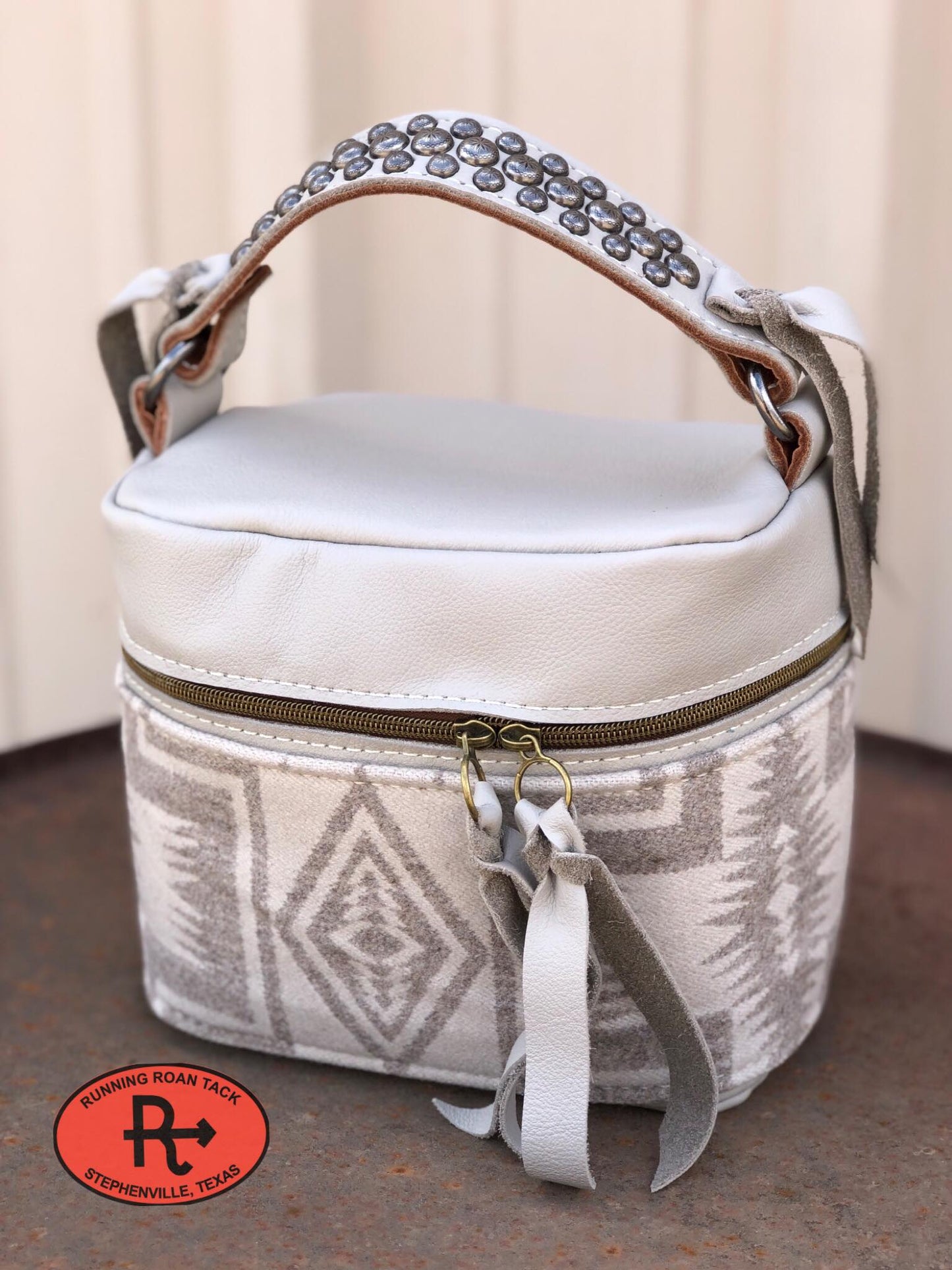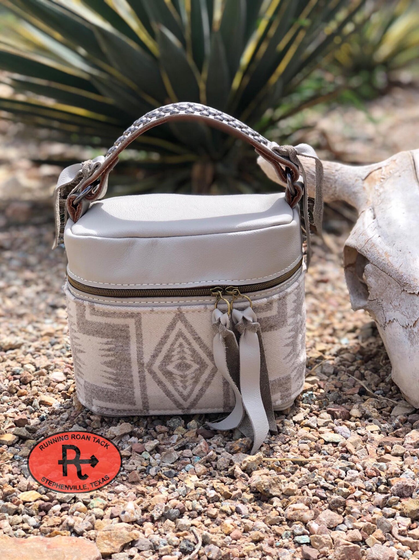 Vintage inspired train case for makeup, toiletries, anything you need to take with you in style. Made from beautiful leather and genuine Pendleton® wool. Handle is decorated with metal dots. This handy case measures 8" tall, 8" long and 6" wide. Double pull zipper for easy access. Leather zipper pulls. Lined with waterproof canvas for easy clean up.