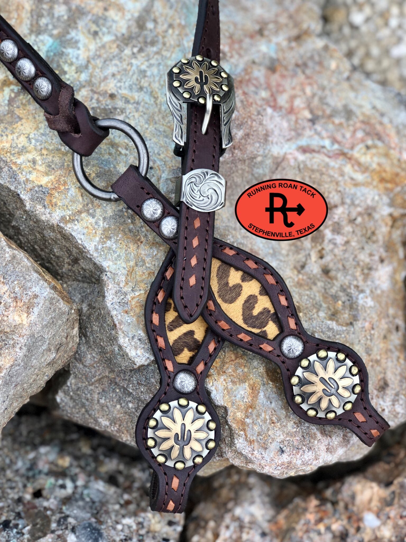 A beautiful headstall handcrafted by Running Roan Tack. Chocolate bridle leather with inlaid mustard leopard print hair on cowhide, dainty brown buckstitch and German silver hardware. Single ear. Twisted leather detail on the ring. This headstall adjusts from 38"-42" overall length.