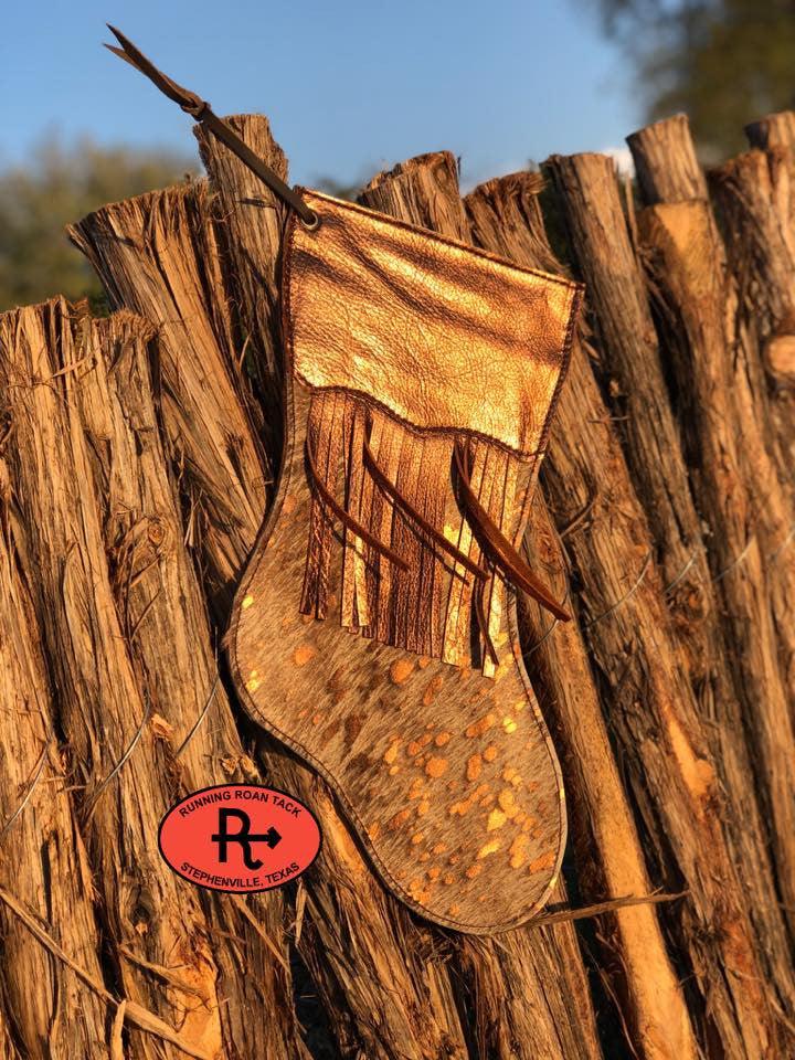 Metallic Acid Wash Cowhide Christmas Stocking with Metallic Trim and Fringe