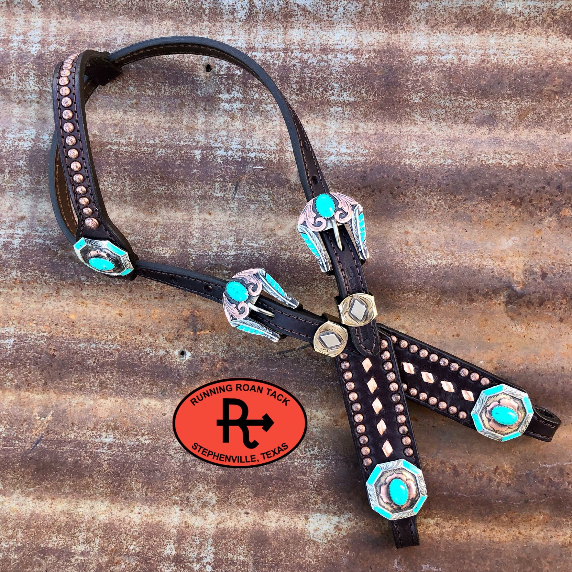 A beautiful headstall handcrafted by Running Roan Tack. This headstall adjusts from 29"-37" overall length.