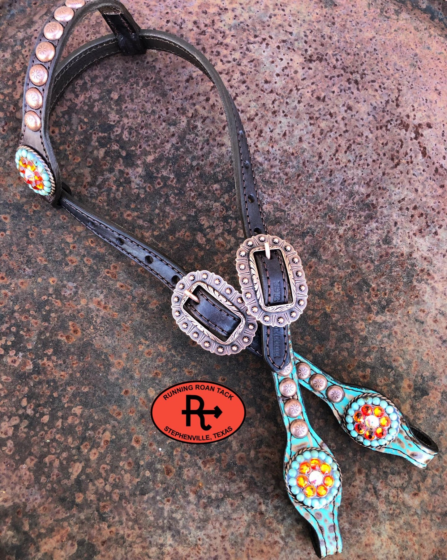 Designed and handmade by Running Roan Tack in Stephenville, Texas. Single ear headstall with short gag cheeks for barrel racing gag bits. Cheeks are overlaid with mint croc. Features conchos with small faux turquoise stones and Swarovski crystals in Fire Opal and AB. Conchos are coated in resin for durability and ease of cleaning.
