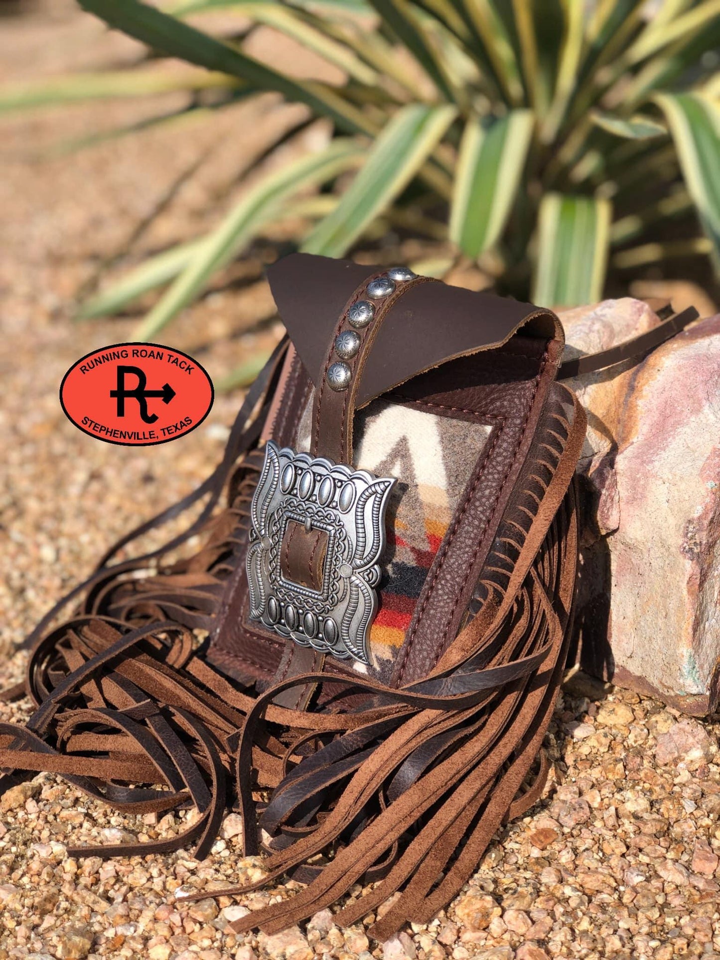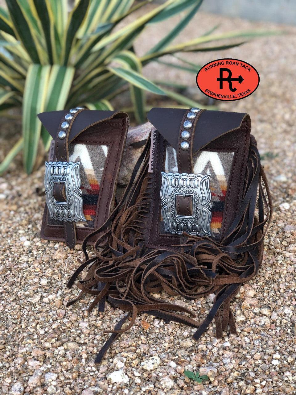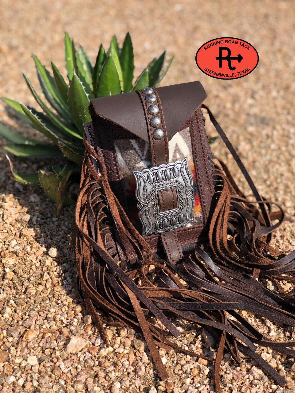 Mini saddle bag made with inlaid "Pacific Crest" Pendleton® Wool pattern. Features a statement-making, beautiful reproduction buckle (buckle is not authentic and is made from nickel). You can order this without fringe or with maximum fringe on all three sides.