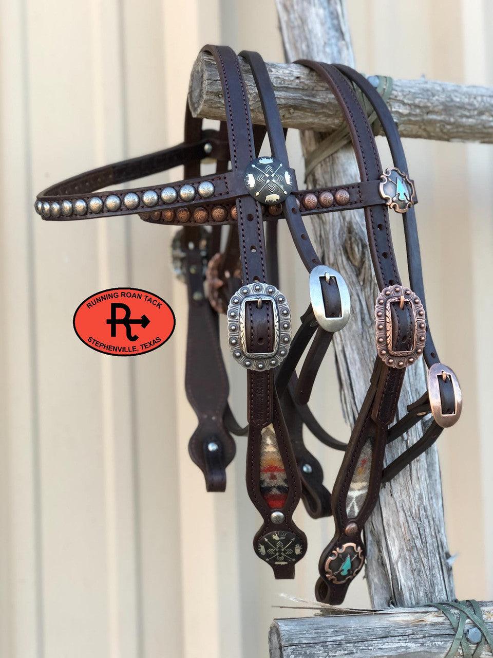 Our "Brazos" style headstall with a browband and throatlatch for added stability. The "Brazos" headstalls have elegant curves that will accentuate a horse's face nicely, with flared cheeks that give us space for decorations. This headstall features inlaid genuine "Pacific Crest" Pendleton® wool. The buckles are riveted on for safety. This headstall is made with our signature dark chocolate bridle leather and is lined with durable, sweat resistant oil tan leather. Handmade from scratch in our workshop in rural Stephenville, TX.