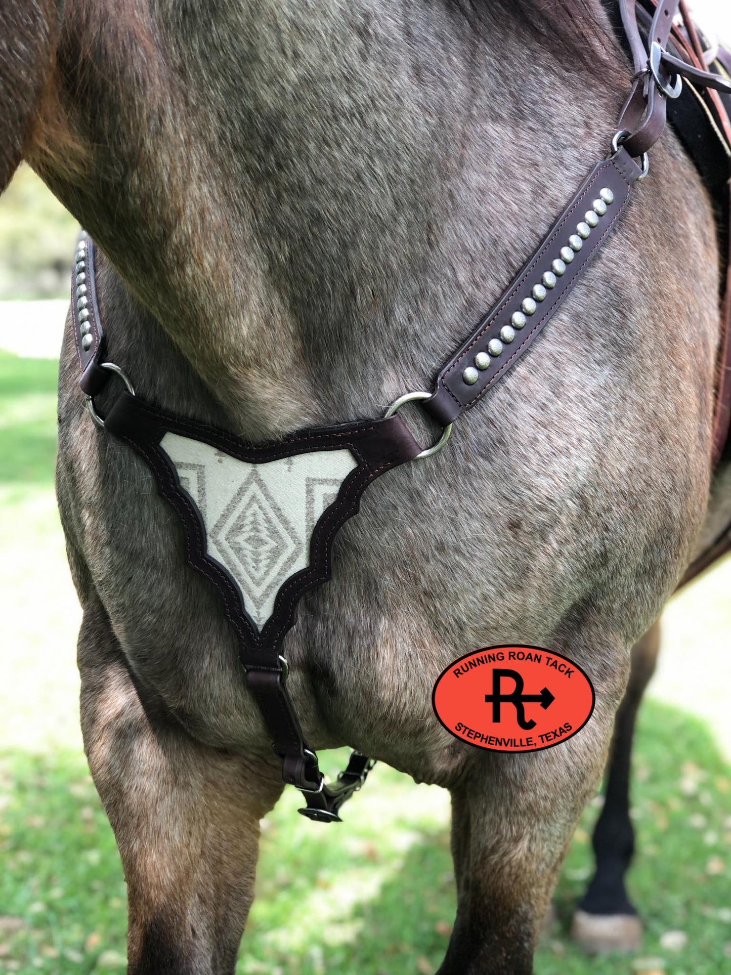 SIZING INFORMATION: This breast collar is standard horse size. This size works well with most performance horses. It measures approximately 35" from saddle tug dee to saddle tug dee. The saddle tug straps each adjust from 9" to 12' with existing holes. To determine if this breast collar will fit your horse, we highly recommend measuring your existing breast collar and comparing that measurement with the measurements provided. It does take some effort on your part to measure your horse, but that will ensure that you order the correct size. More detailed information about sizing is available at this link: https://runningroantack.com/pages/sizing (opens in new tab/window)
