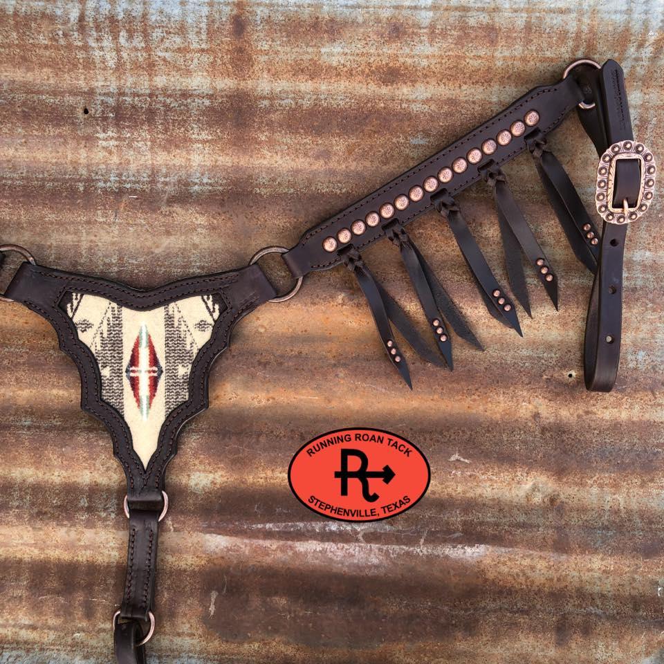 Our "Palomo" breast collars take baroque design elements and morphs them into something modern! This breast collar features a 3-piece design with lots of room for decorations. This one is inlaid with genuine Spirit of the People Pendleton® Wool. Hand tied, thin, chocolate bridle leather with small copper dots on the tips. The buckles are riveted to the tugs for safety. Adjustable cinch tug. This breast collar is made with our signature dark chocolate bridle leather and is lined with durable, sweat resistant burgundy latigo leather. Handmade from scratch in our workshop in rural Stephenville, TX.