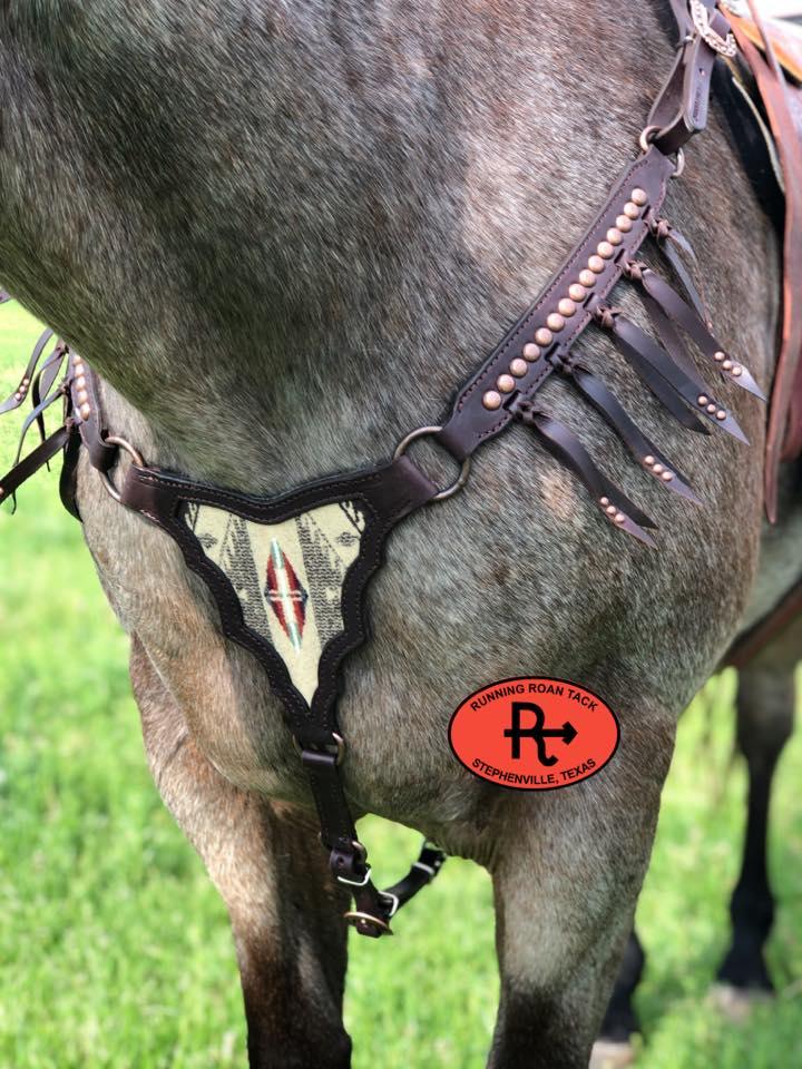 SIZING INFORMATION: This breast collar is standard horse size. This size works well with most performance horses. It measures approximately 35" from saddle tug dee to saddle tug dee. The saddle tug straps each adjust from 9" to 12' with existing holes. To determine if this breast collar will fit your horse, we highly recommend measuring your existing breast collar and comparing that measurement with the measurements provided. It does take some effort on your part to measure your horse, but that will ensure that you order the correct size. More detailed information about sizing is available at this link: https://runningroantack.com/pages/sizing (opens in new tab/window)
