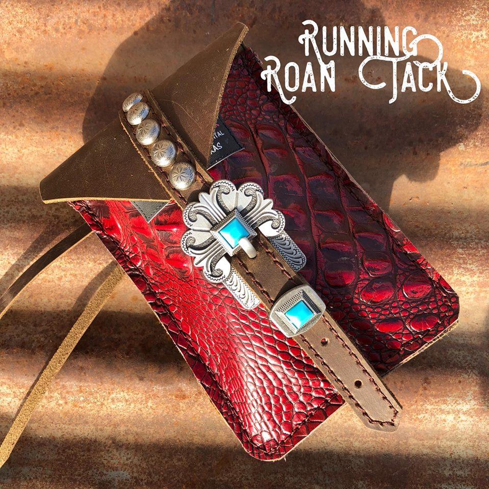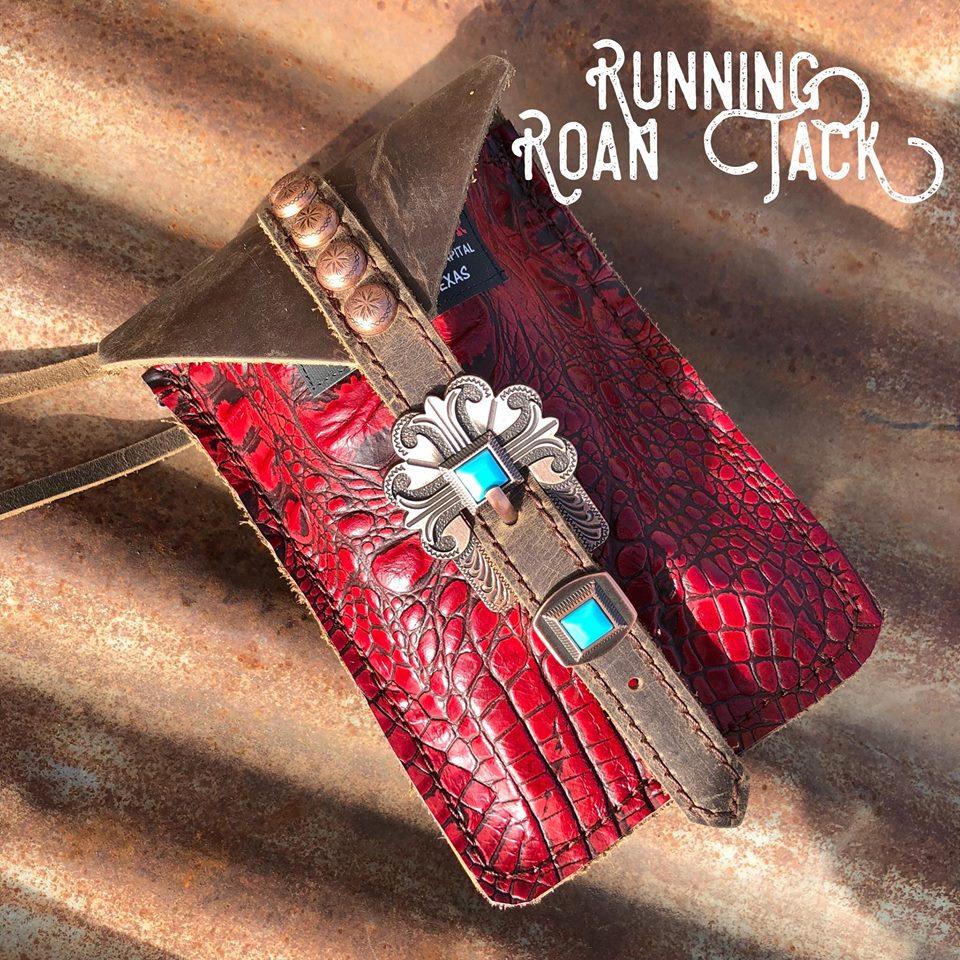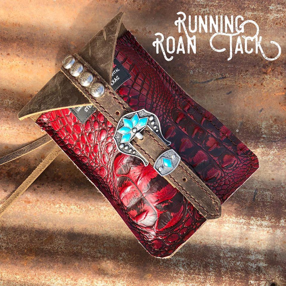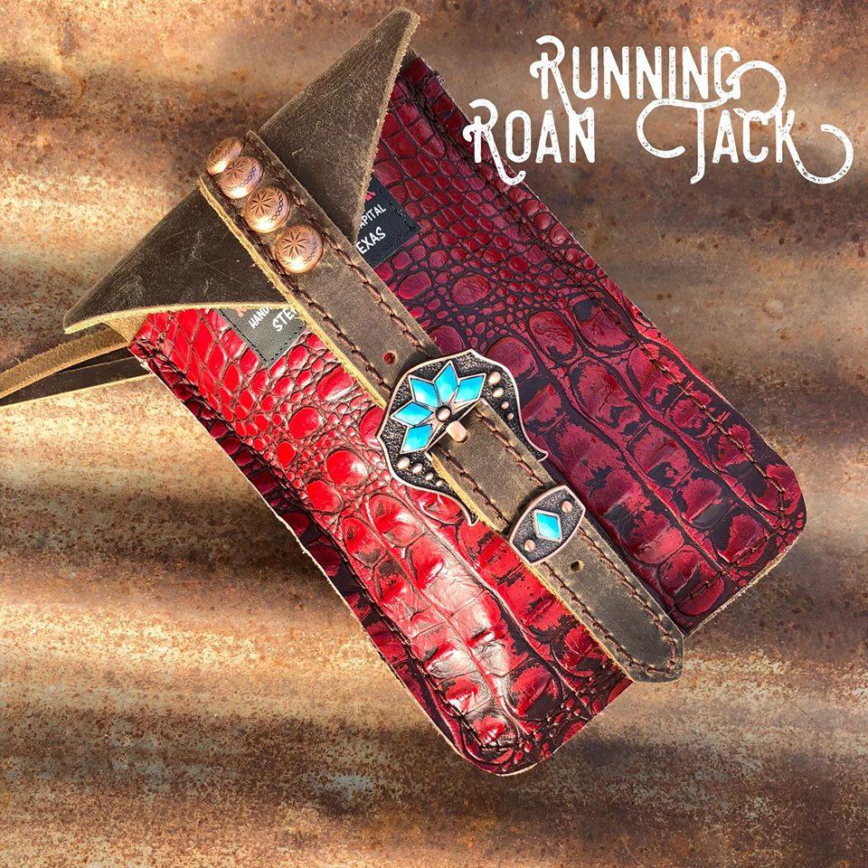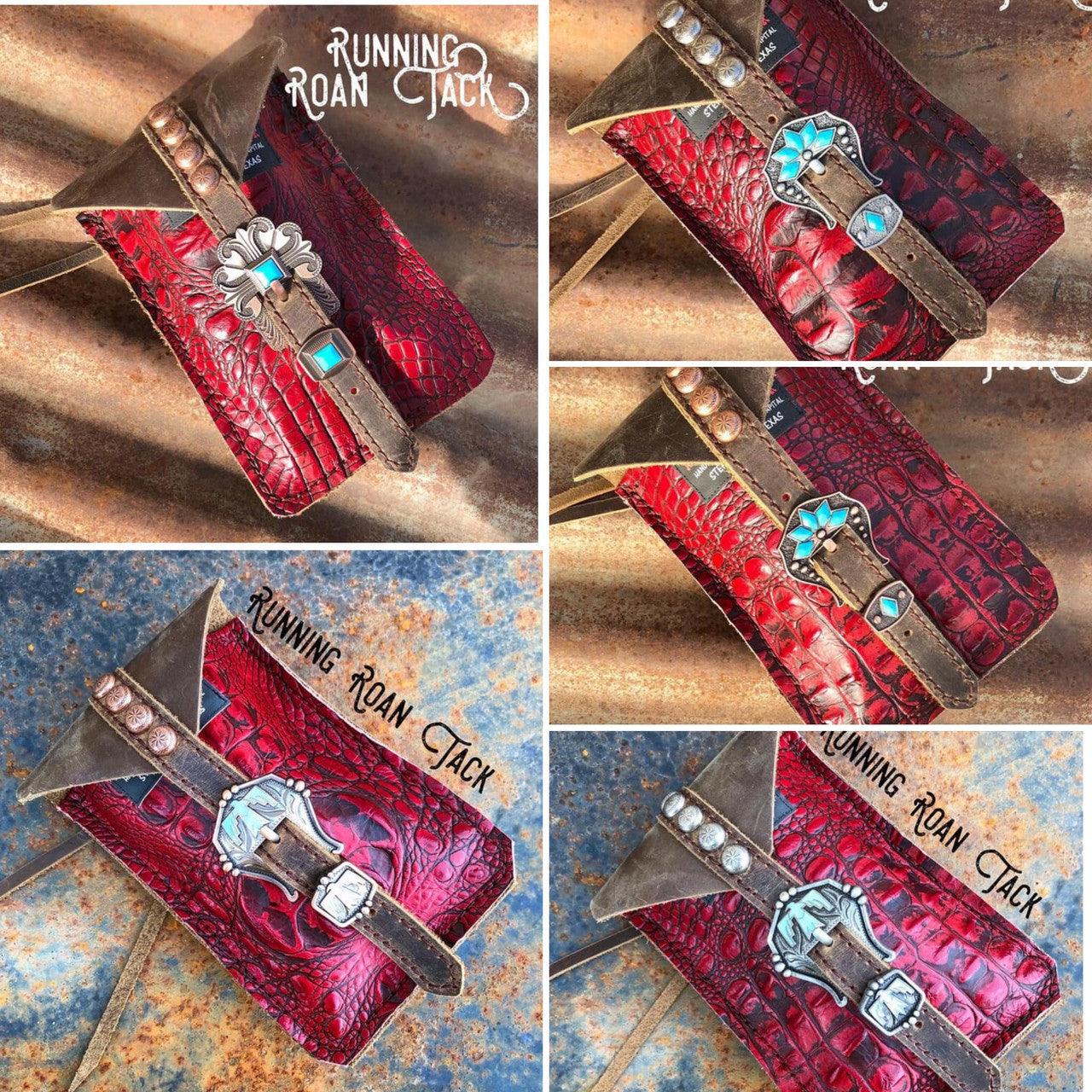You have chosen Red Croc as the hide you would like. Now choose the buckle you would like from the options list. You can see all the buckle options at one convenient page at this link: https://runningroantack.com/pages/buckles-conchos (opens in new tab/screen). Then indicate if you would like rustic brown fringe on the sides of the bag. We make these bags by hand, from scratch in our workshop in rural Stephenville, TX.