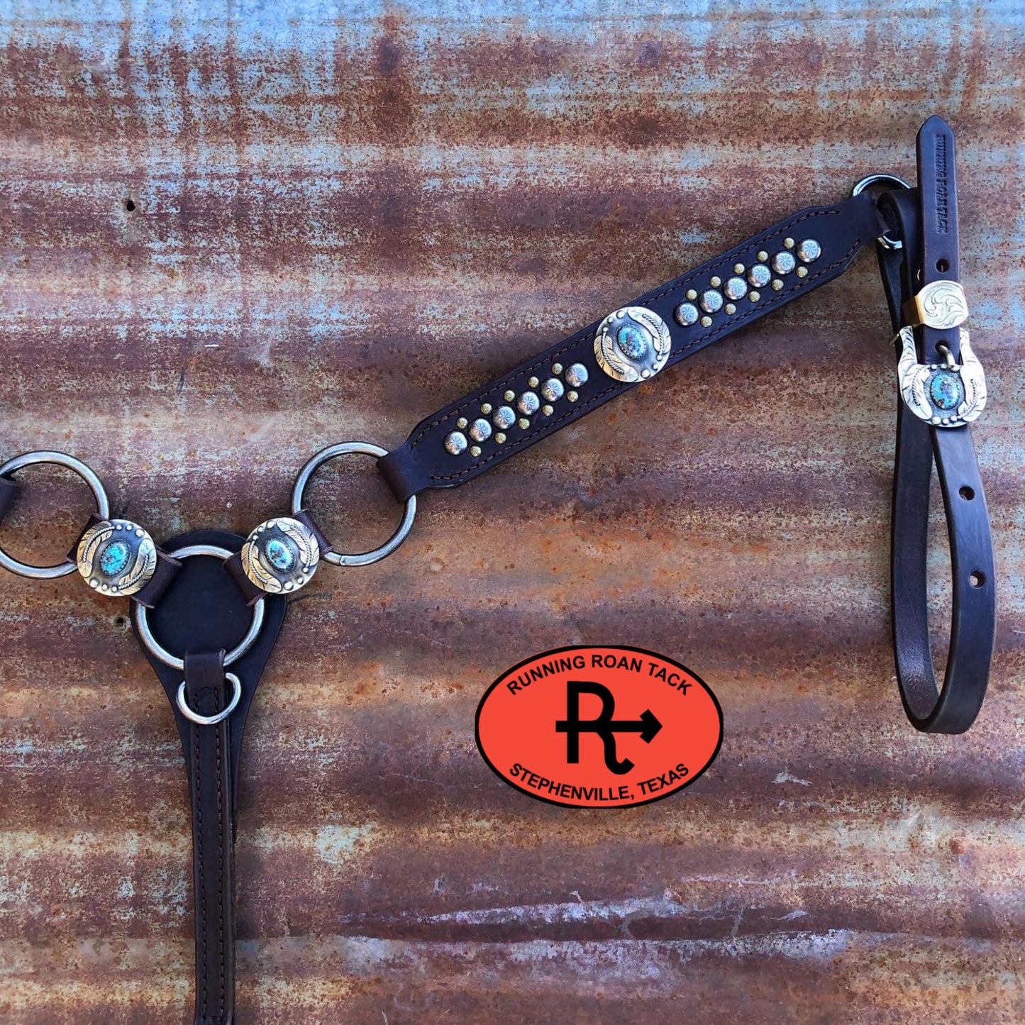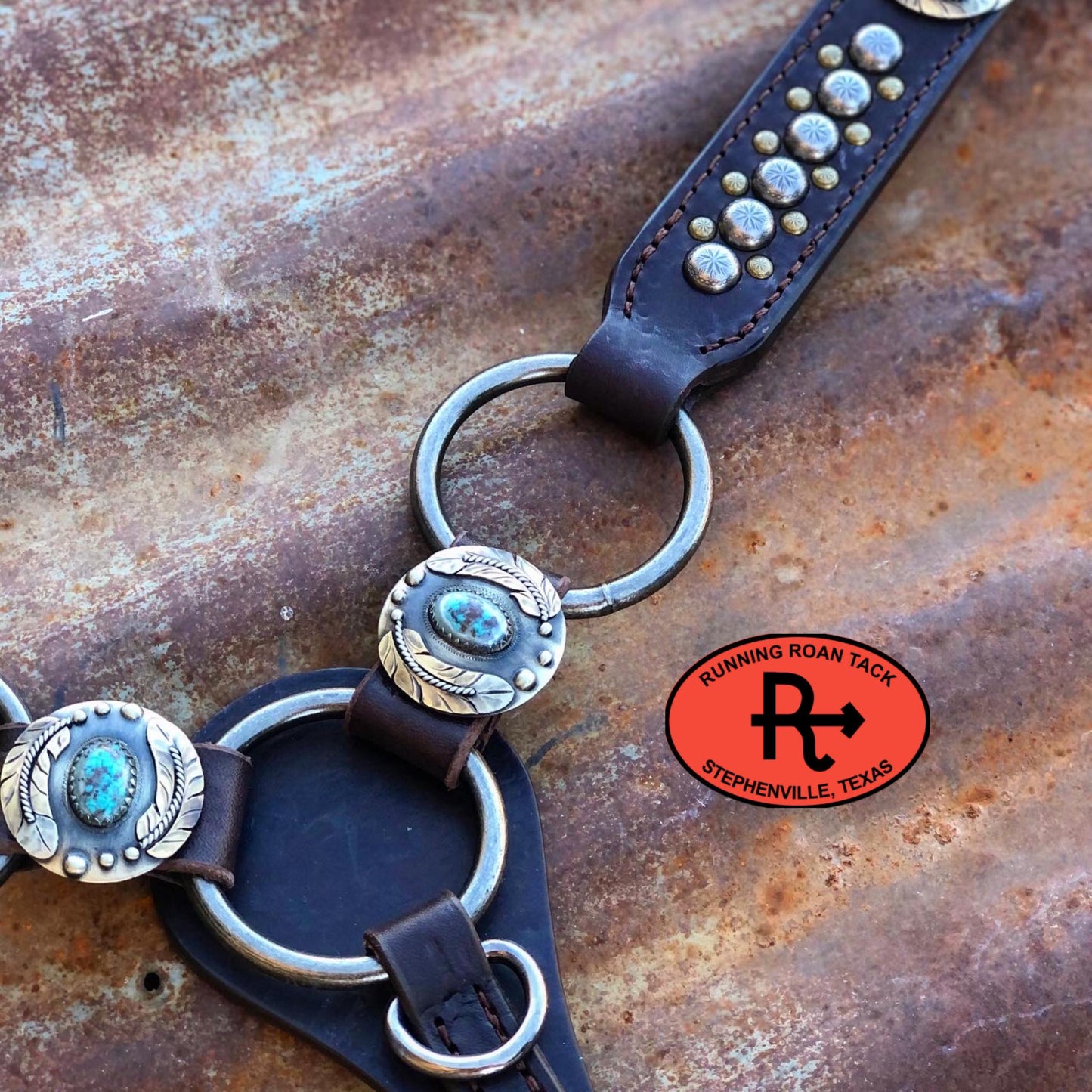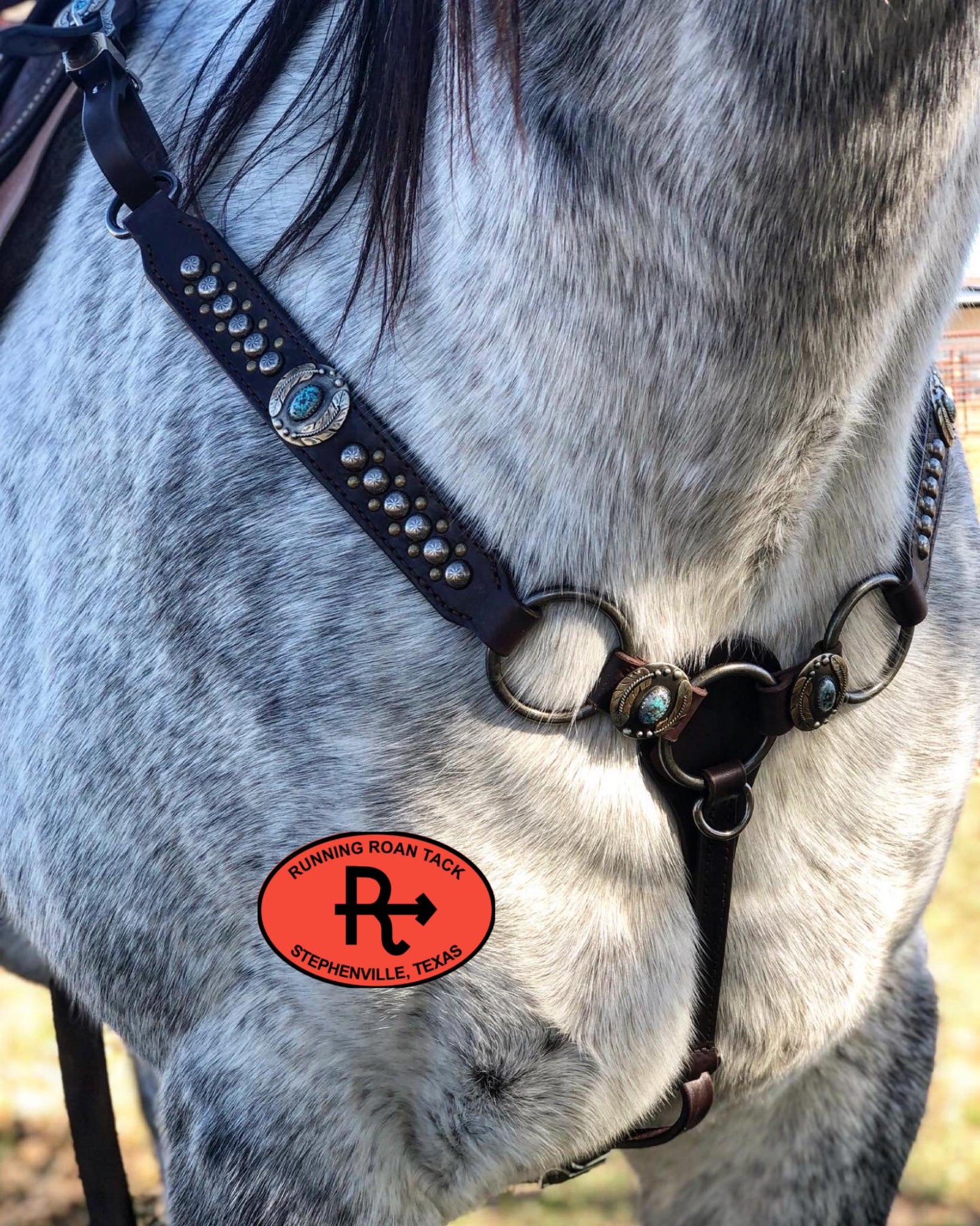Punchy breast collar with rings. Features upgraded Feather and Turquoise conchos and matching buckles. Conchos and buckles are electroplated German silver for durability. This breast collar is securely sewn, the conchos are decorative only. Simple straight lines and a width of 1-1/2" makes this breast collar versatile and complimentary to any horse. The buckles are riveted to the tugs for safety. Adjustable cinch tug. This breast collar is made with our signature dark chocolate bridle leather and is lined with durable, sweat resistant burgundy latigo leather. Handmade from scratch in our workshop in rural Stephenville, TX.