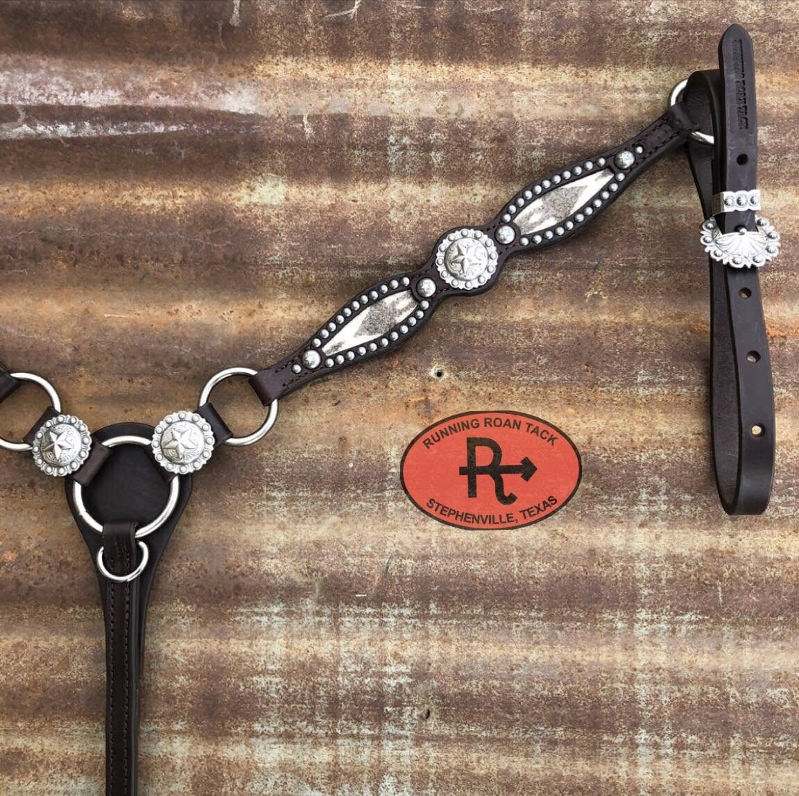 Punchy breast collar with rings. This breast collar is securely sewn, the conchos are decorative only. Simple straight lines and a maximum width of 1-1/2" makes this breast collar versatile and complimentary to any horse. The buckles are riveted to the tugs for safety. Adjustable cinch tug. This breast collar is made with our signature dark chocolate bridle leather and is lined with durable, sweat resistant burgundy latigo leather. Handmade from scratch in our workshop in rural Stephenville, TX.