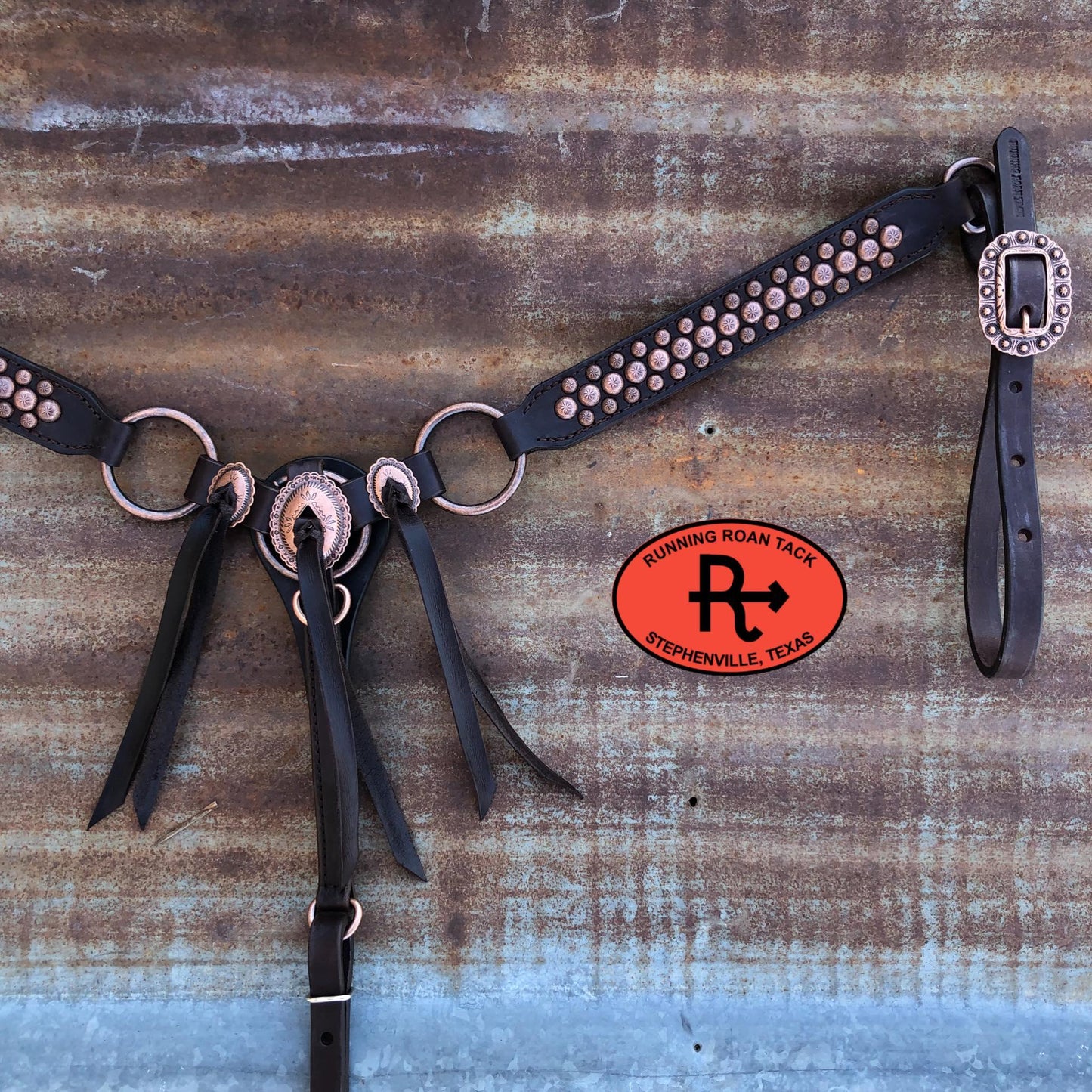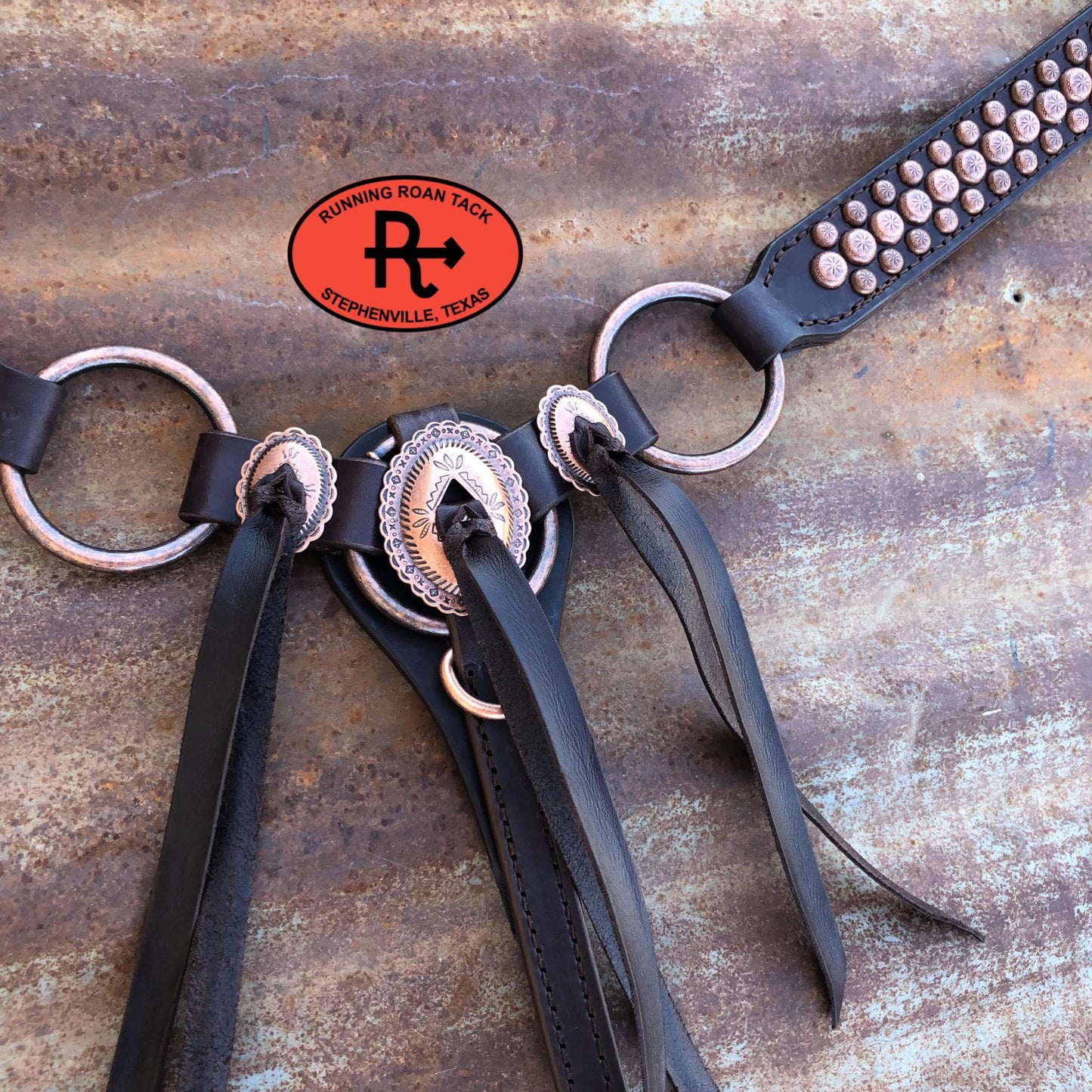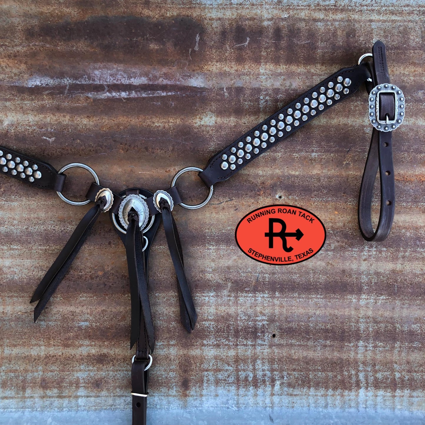 Punchy breast collar with rings. Features three slotted Mesa conchos with chocolate leather ties. Simple straight lines and a width of 1-1/2" makes this breast collar versatile and complimentary to any horse. The buckles are riveted to the tugs for safety. Adjustable cinch tug. This breast collar is made with our signature dark chocolate bridle leather and is lined with durable, sweat resistant burgundy latigo leather. Handmade from scratch in our workshop in rural Stephenville, TX.