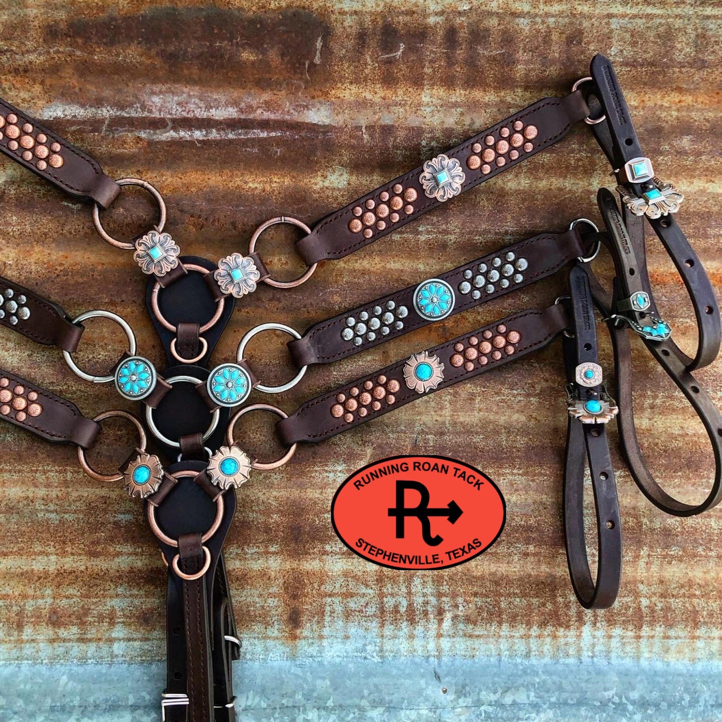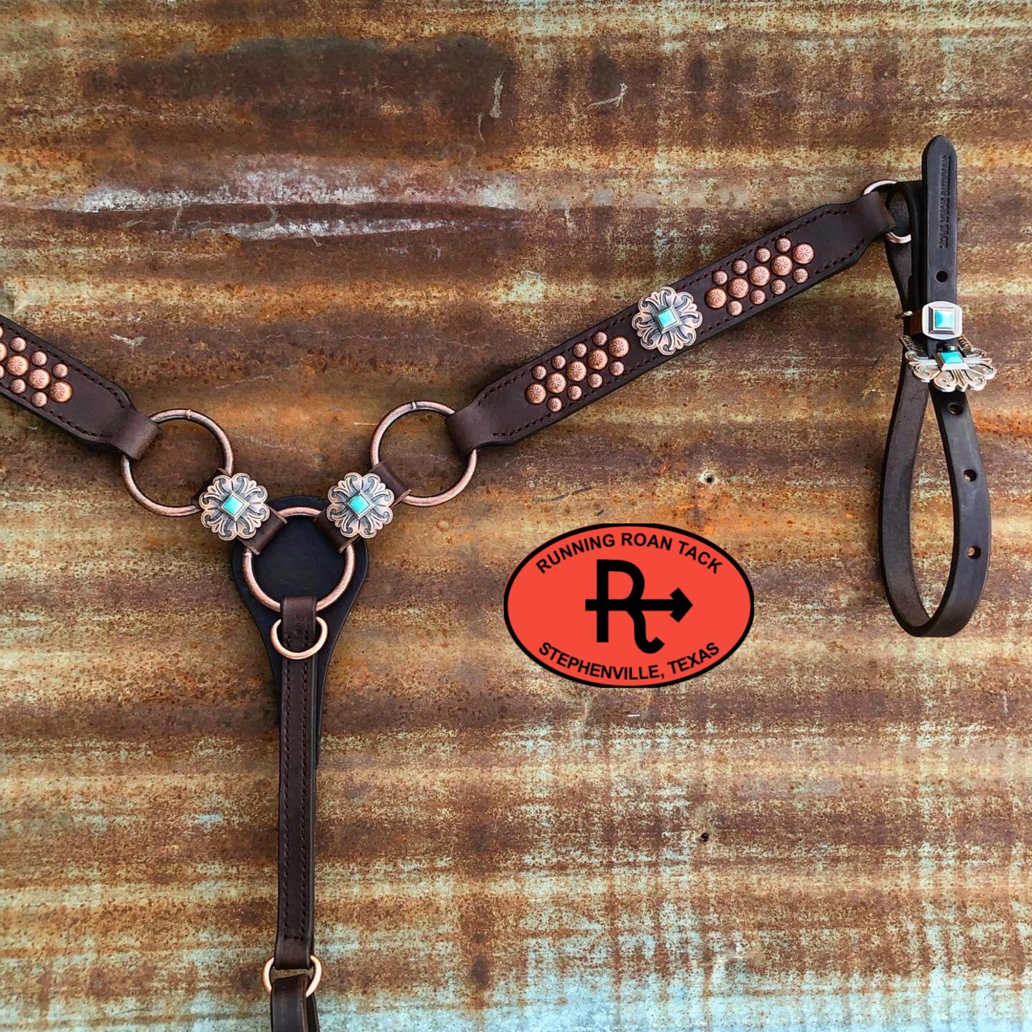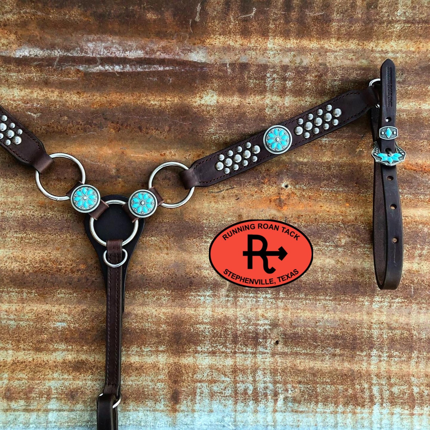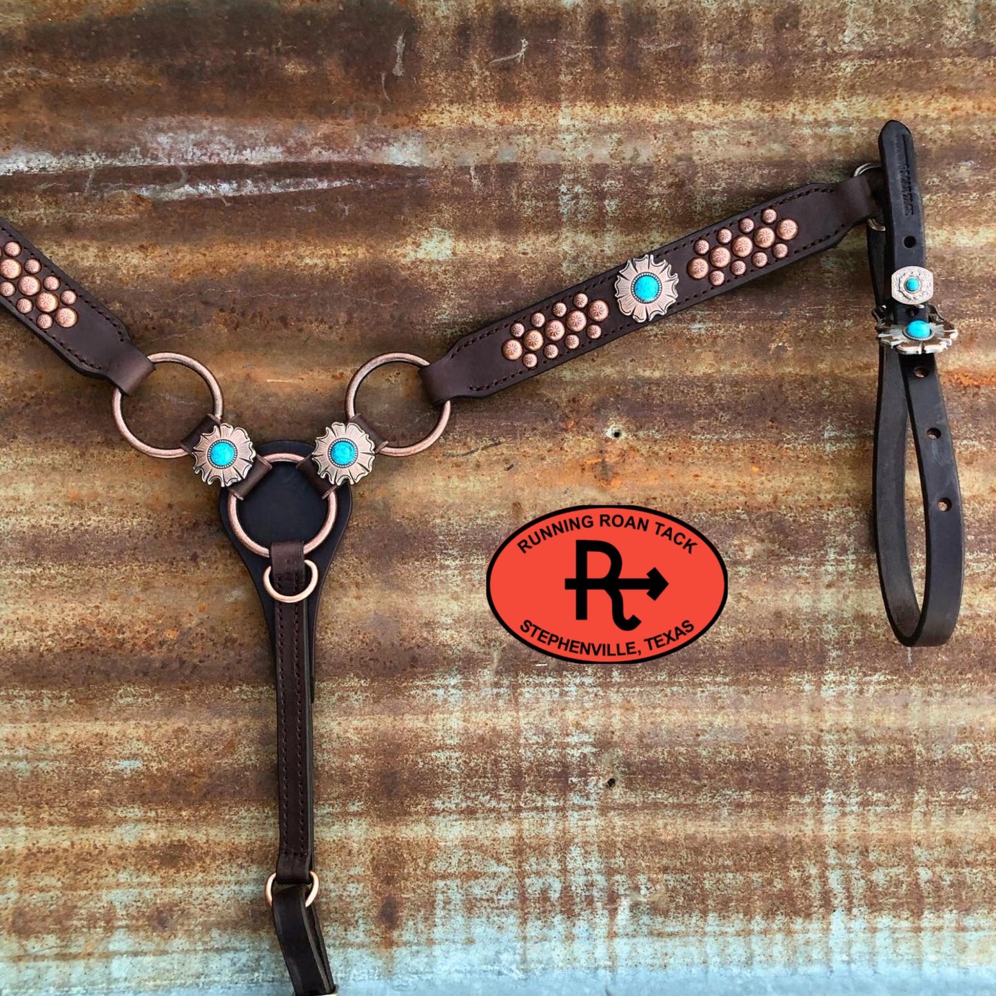 This performance-friendly ring breast collar is a Running Roan Tack original design! Punchy rings paired with simple straight lines and a width of 1-1/2" makes this breast collar versatile and complimentary to any horse.  This breast collar is securely sewn, the conchos are decorative only. The buckles are riveted to the tugs for safety. Adjustable cinch tug. This breast collar is made with our signature dark chocolate bridle leather and is lined with durable, sweat resistant burgundy latigo leather. Handmade from scratch in our workshop in rural Stephenville, TX.