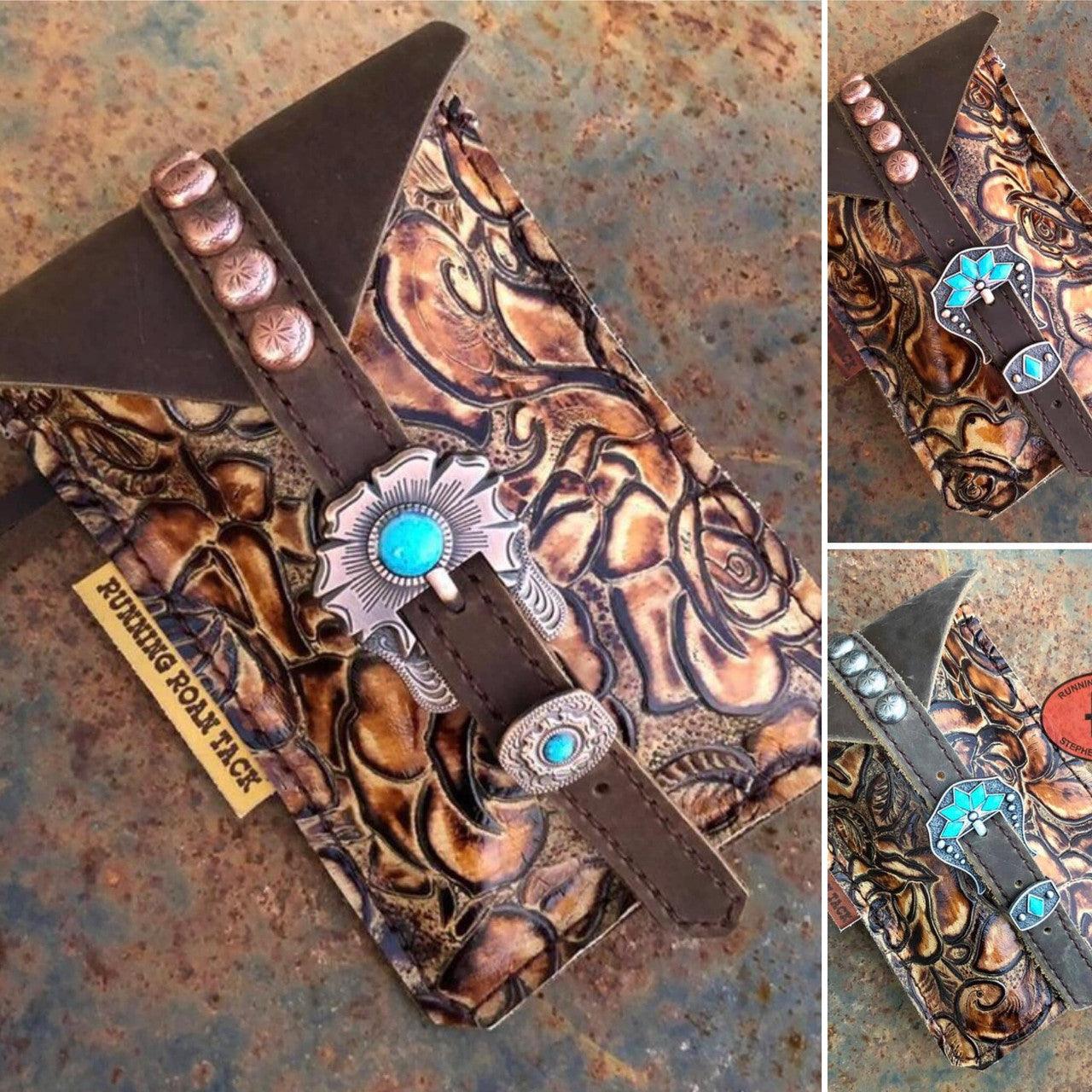 You have chosen Savannah Rose as the hide you would like. Now choose the buckle you would like from the options list. You can see all the buckle options at one convenient page at this link: https://runningroantack.com/pages/buckles-conchos (opens in new tab/screen). Then indicate if you would like rustic brown fringe on the sides of the bag. We make these bags by hand, from scratch in our workshop in rural Stephenville, TX.