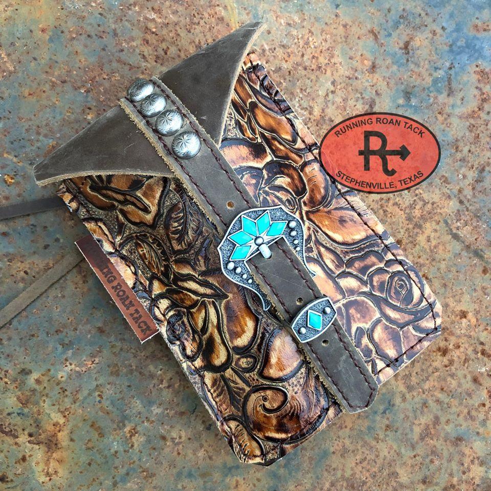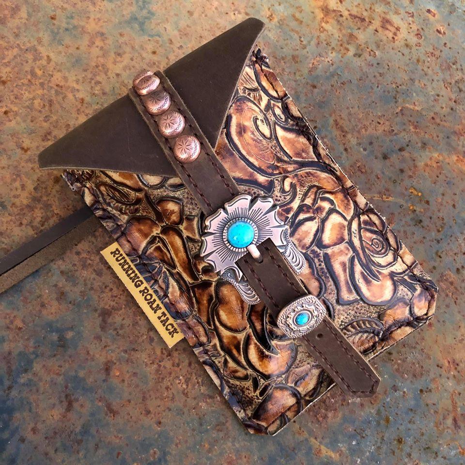 Our mini saddle bags are a pouch that attaches to your rear cinch billet so your phone, keys, etc can ride with you! Mini saddle bag has dual points of attachment (leather loop and leather tie), so it stays put and won't flap around. You can easily and quickly remove the mini saddle bag to switch saddles (no tools required). Buckle keeps top flap closed securely. Pouch measures 5" wide x 7" tall (not including flap) and expands to about 1-1/2" wide. It will easily fit all iPhone models (Plus and Max included) and similarly sized phones with room to spare so you can throw in your keys or other small item. Please note: your saddle must have a rear cinch billet to attach this bag. Refer to example photo showing one of these bags on a saddle.