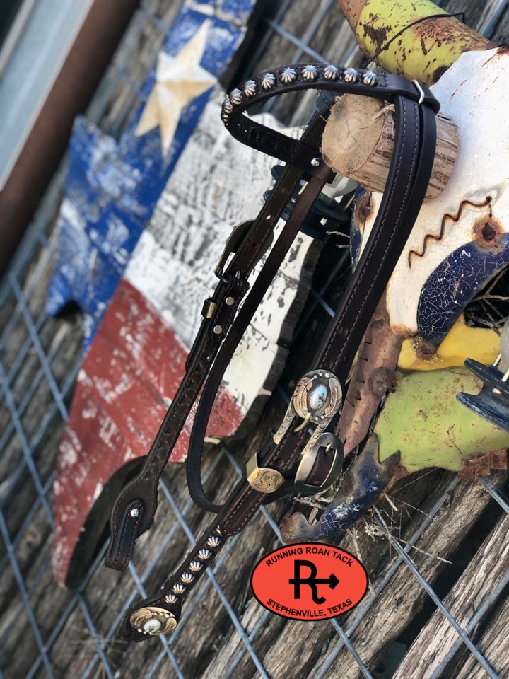 My signature dark chocolate bridle leather with fancy parachute dots and upgraded German silver buckles and conchos. Sliding single ear with throatlatch for stability. This headstall adjusts from 36"-43".