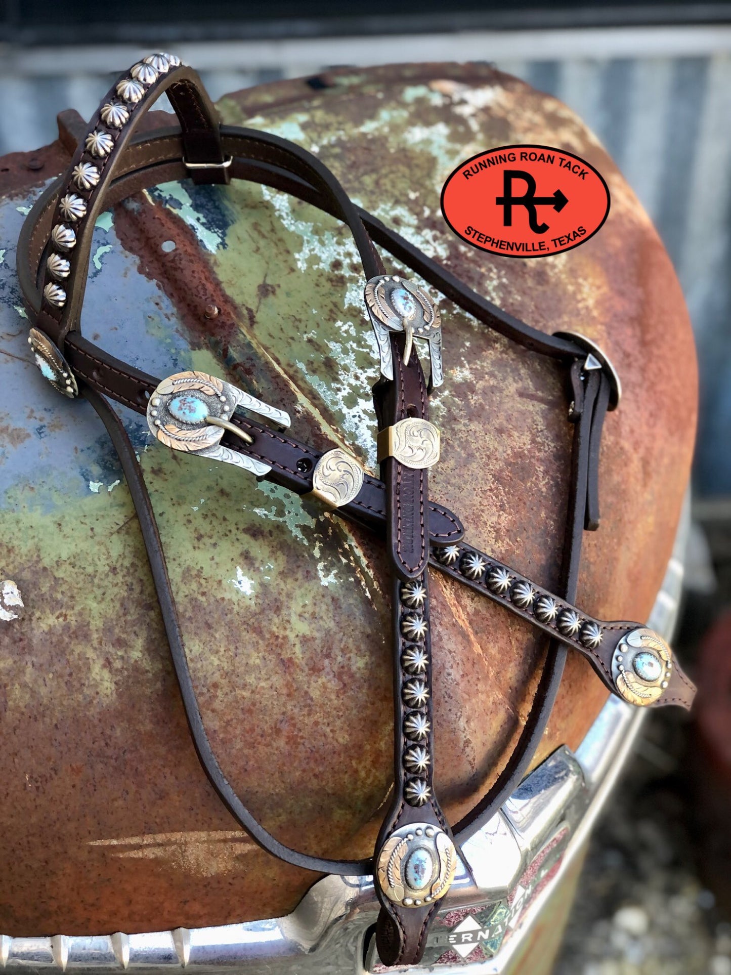 Single Ear Headstall with Throatlatch and German Silver Feathers and Turquoise Hardware 36"-43" (8)