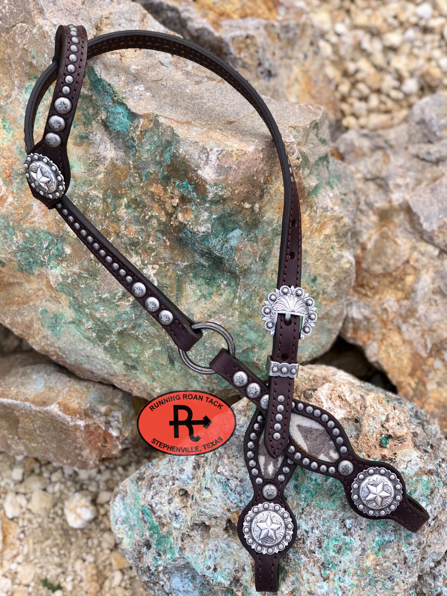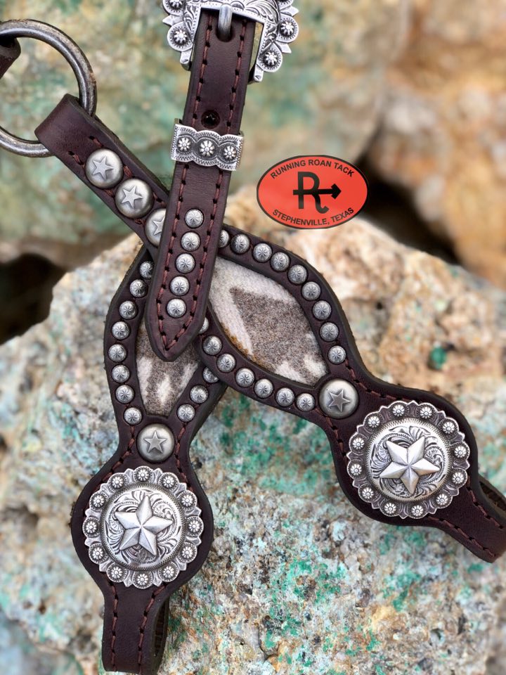 A beautiful headstall handcrafted by Running Roan Tack. Chocolate bridle leather with inlaid Mesilla Pendleton® wool and antique silver star conchos and dots. Single ear. This headstall adjusts from 39"-43" overall length.