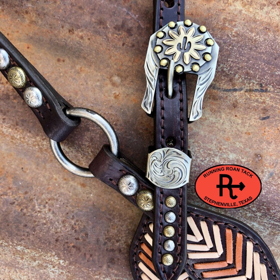 A beautiful headstall handcrafted by Running Roan Tack. Chocolate bridle leather with big, bold arrow lacing done with ochre and off white kangaroo leather. Headstall is loaded with round metal spots. This headstall adjusts from 38"-42" overall length.