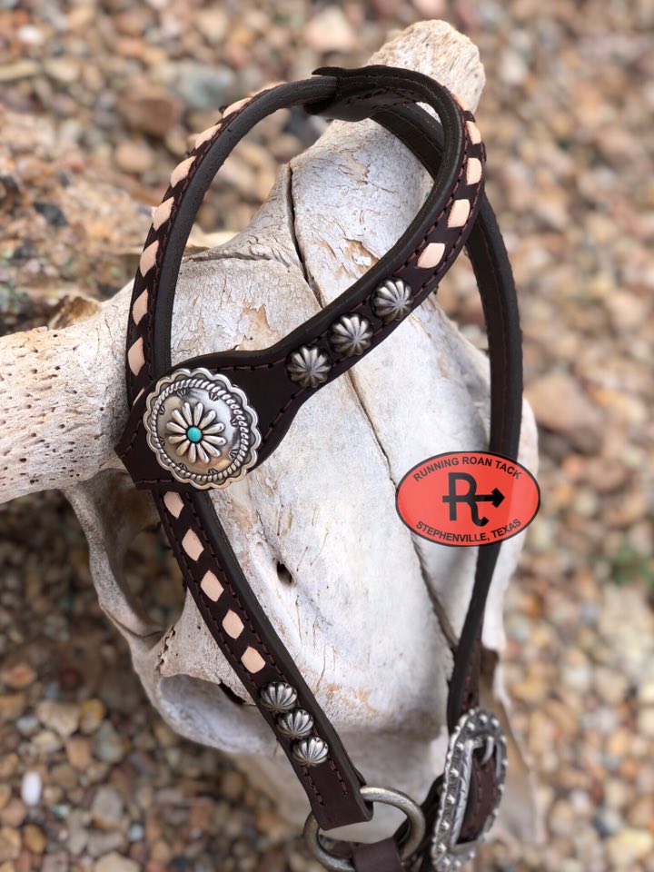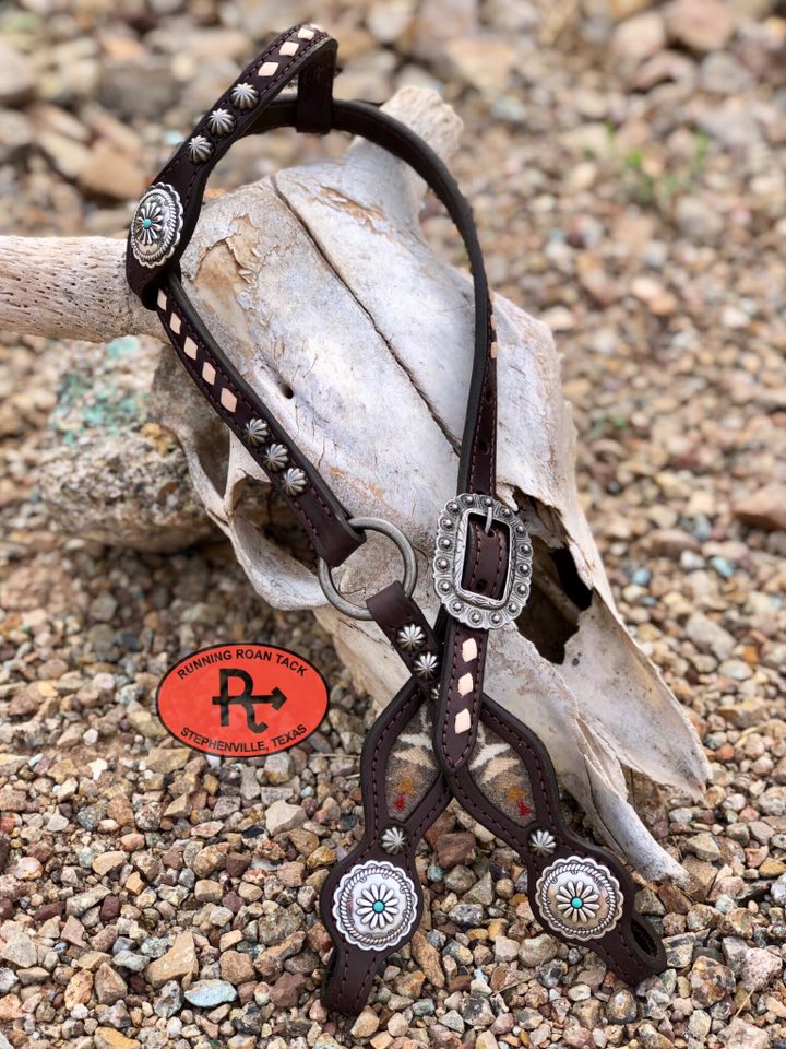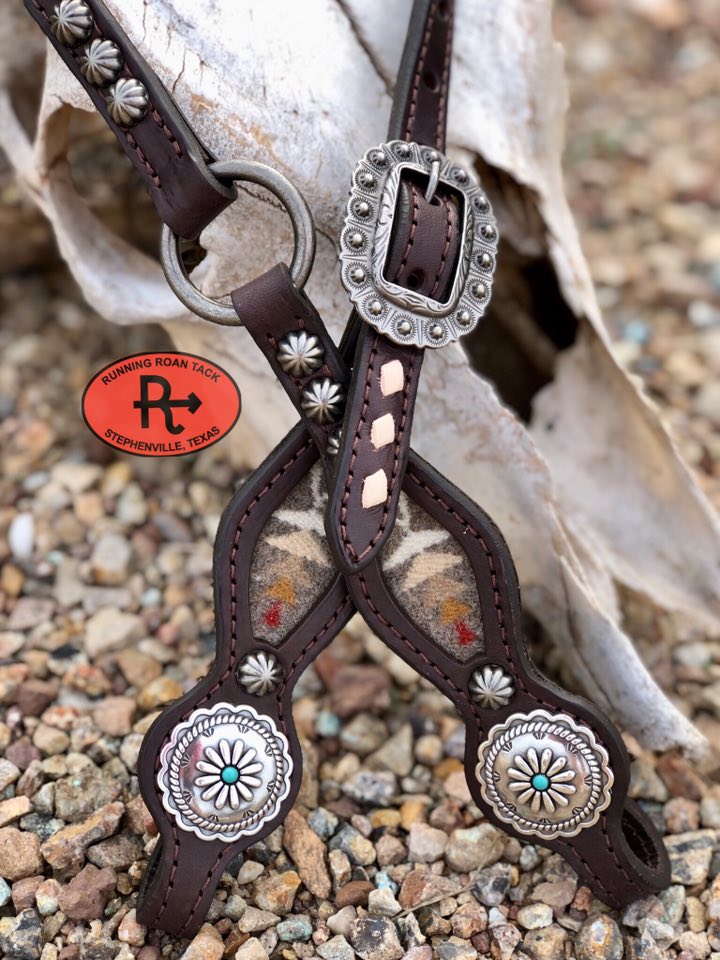 A beautiful headstall handcrafted by Running Roan Tack. Chocolate bridle leather with inlaid Pacific Crest Pendleton® wool and off-white buckstitch. Single ear. This headstall adjusts from 37"-41" overall length.