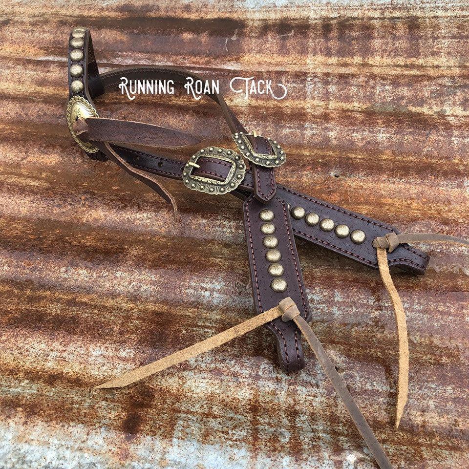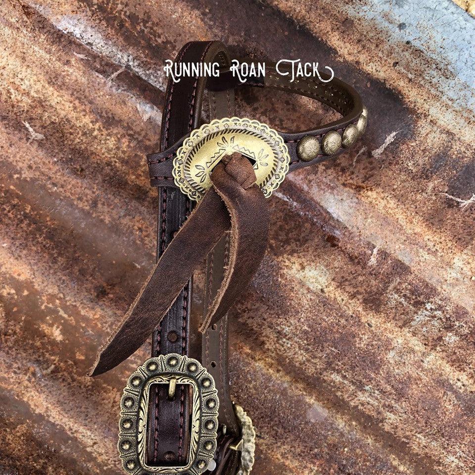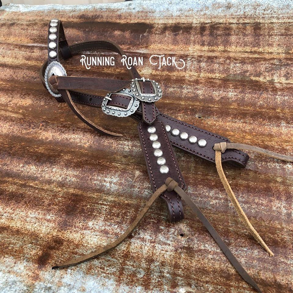 Our popular "Haywire" headstall with a sliding single ear. The cheeks on this headstall are decorated with a centered line of large metal dots. Slotted Mesa concho and leather tie at ear. The buckles are riveted on for safety. This headstall is made with our signature dark chocolate bridle leather and is lined with durable, sweat resistant oil tan leather. Handmade from scratch in our workshop in rural Stephenville, TX.