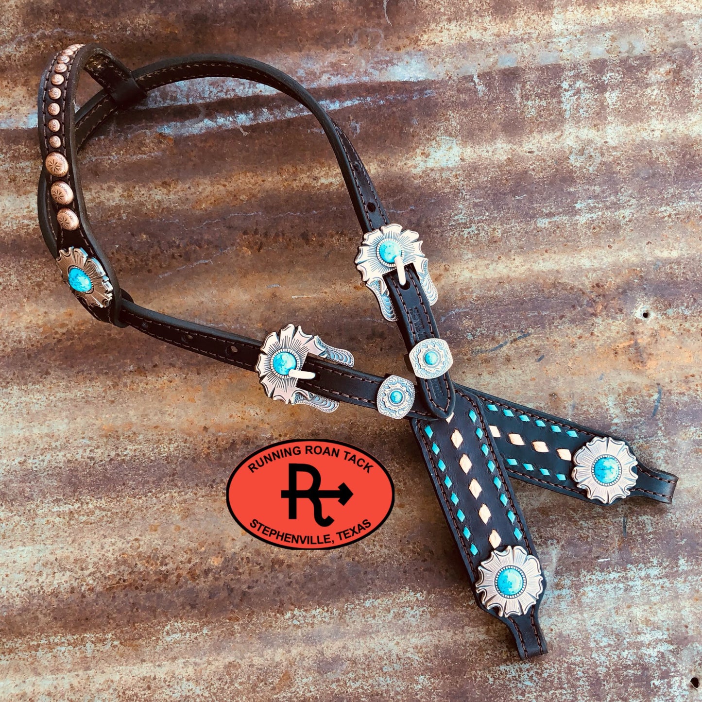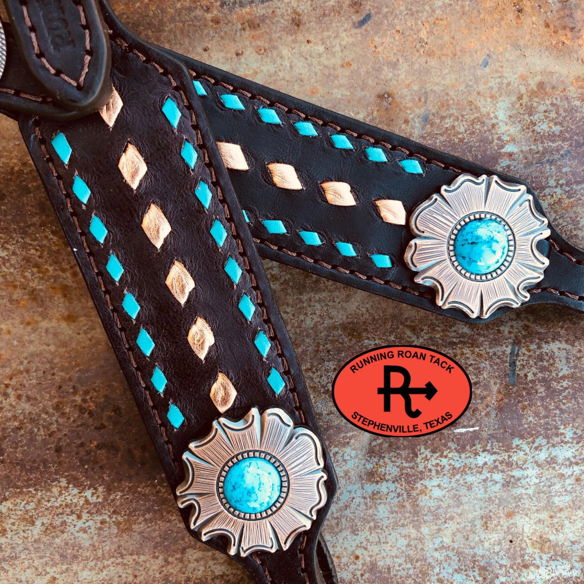 Single Ear Short Cheek Headstall with Turquoise and Copper Buckstitch and Flower Hardware 29"-37" (Copy)