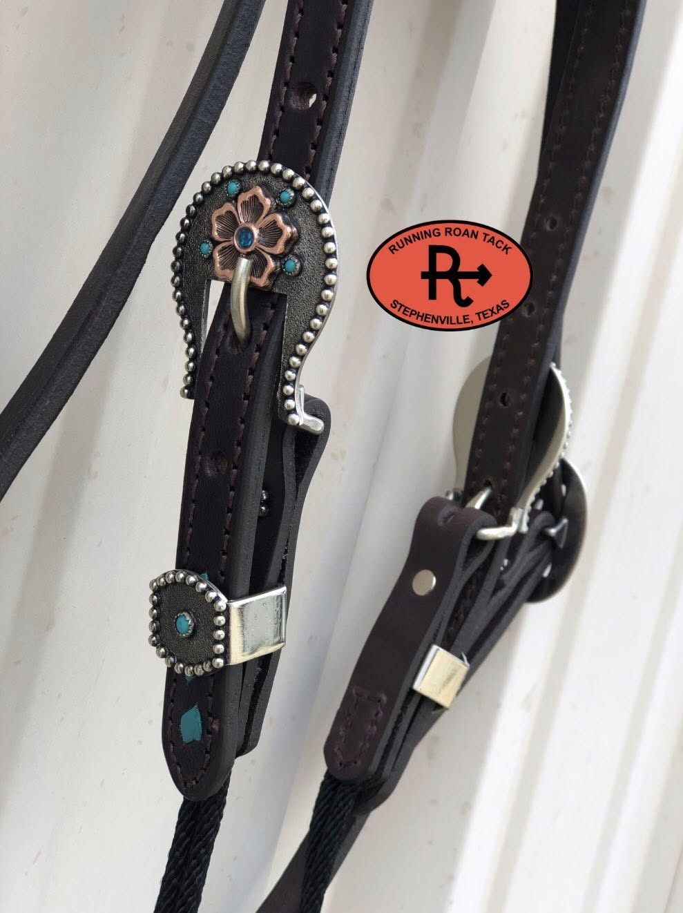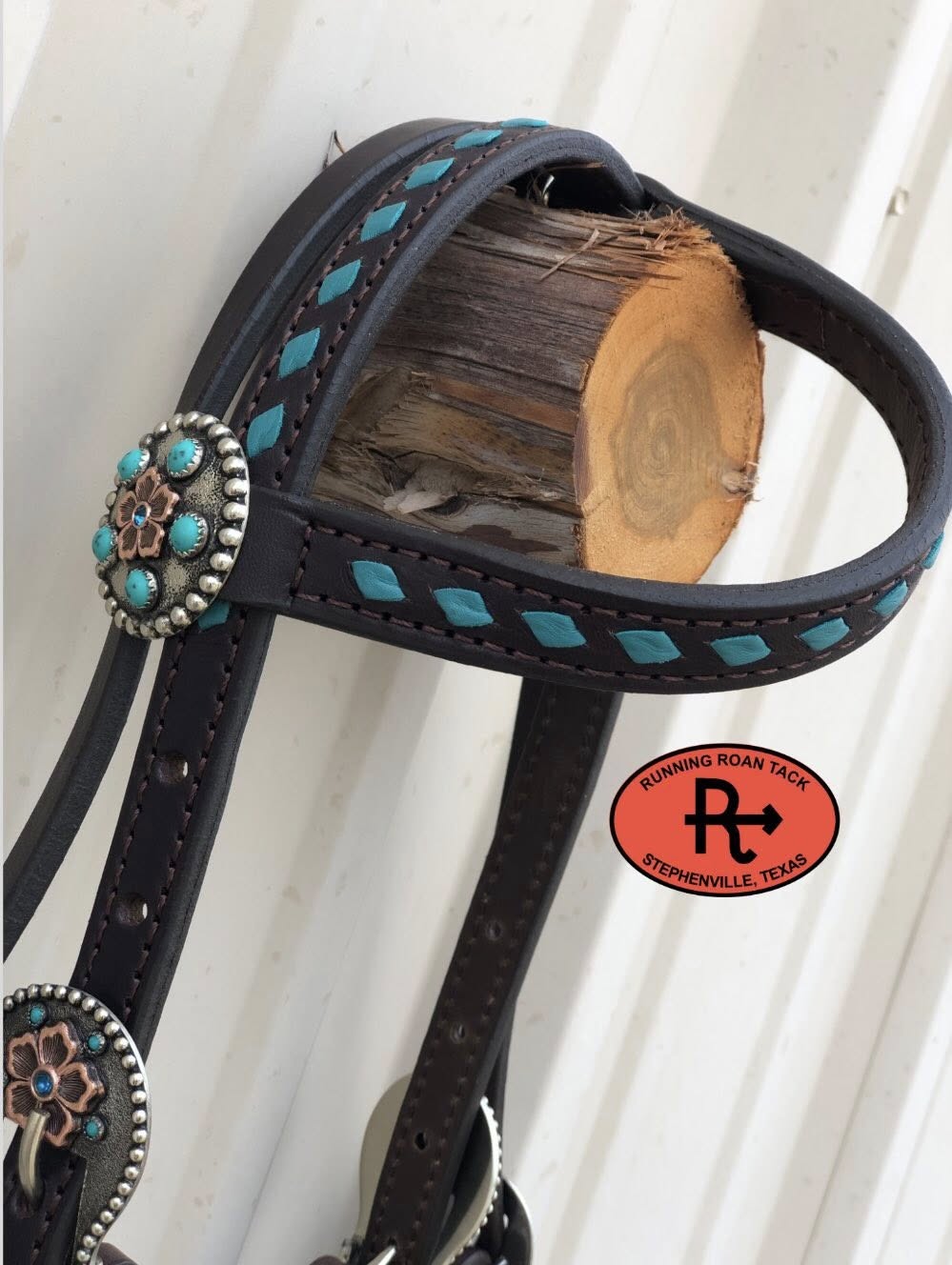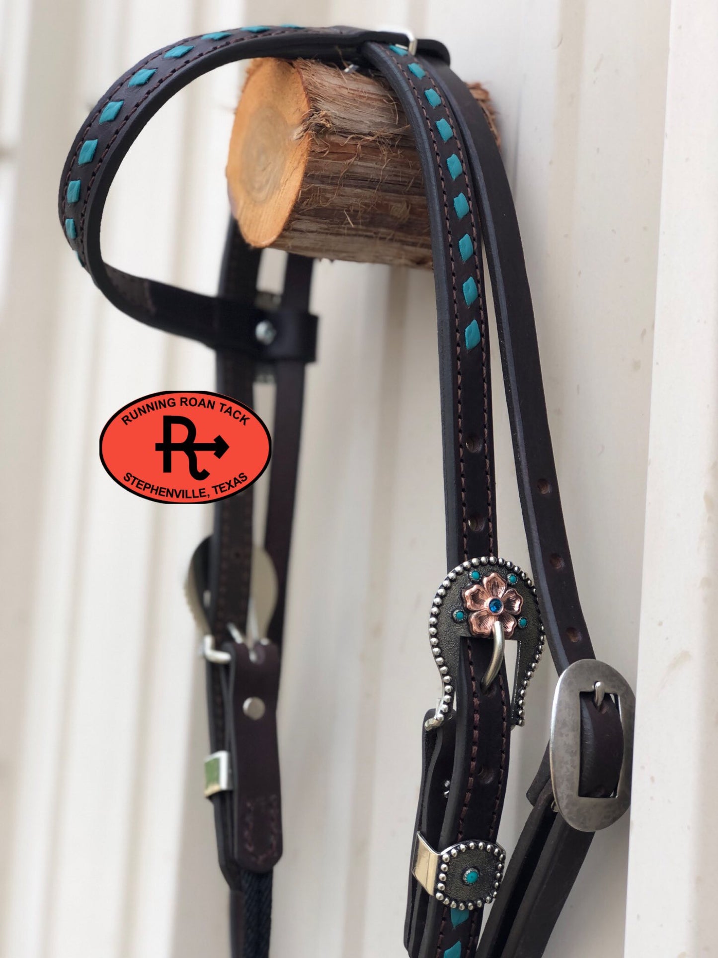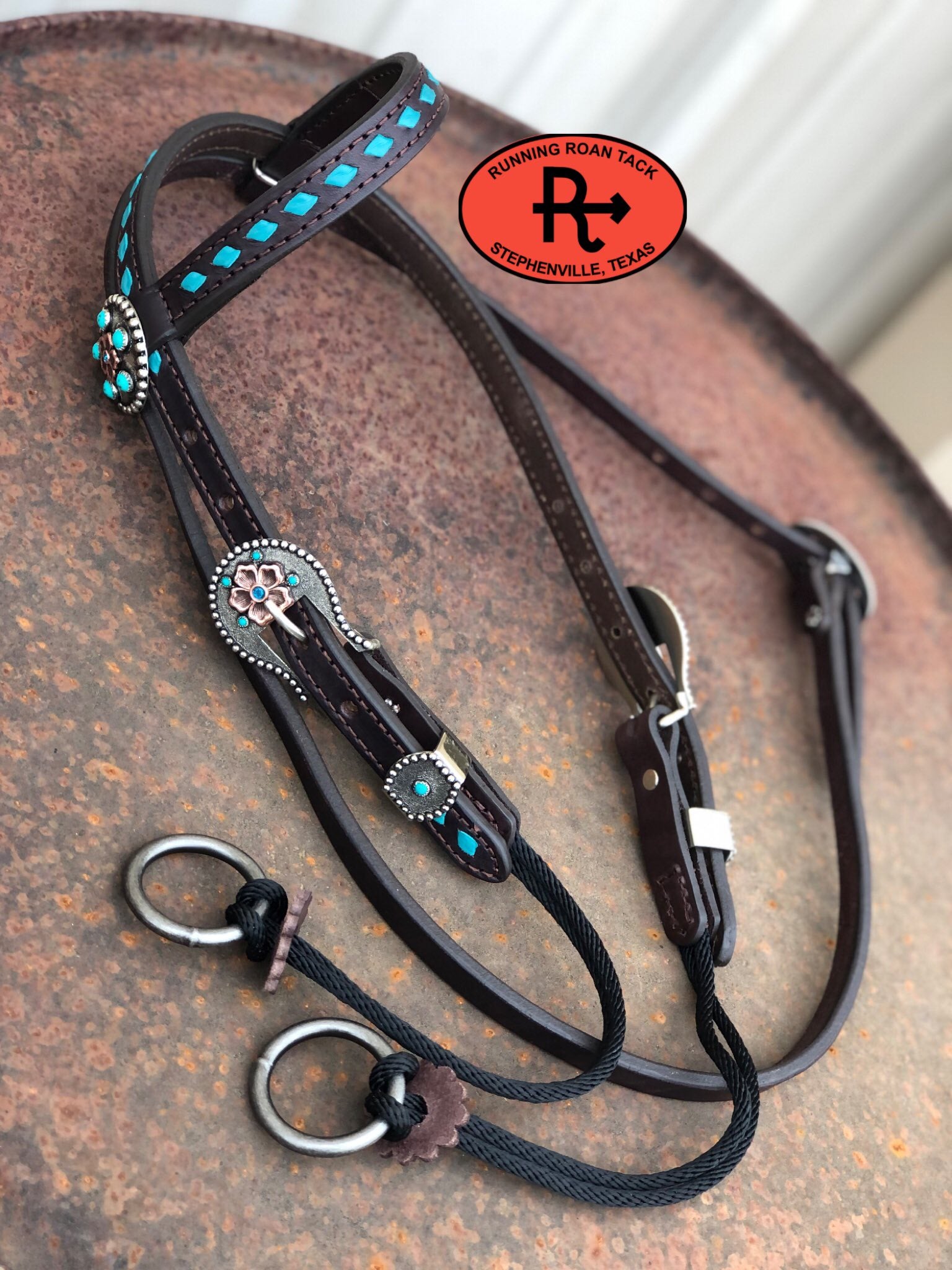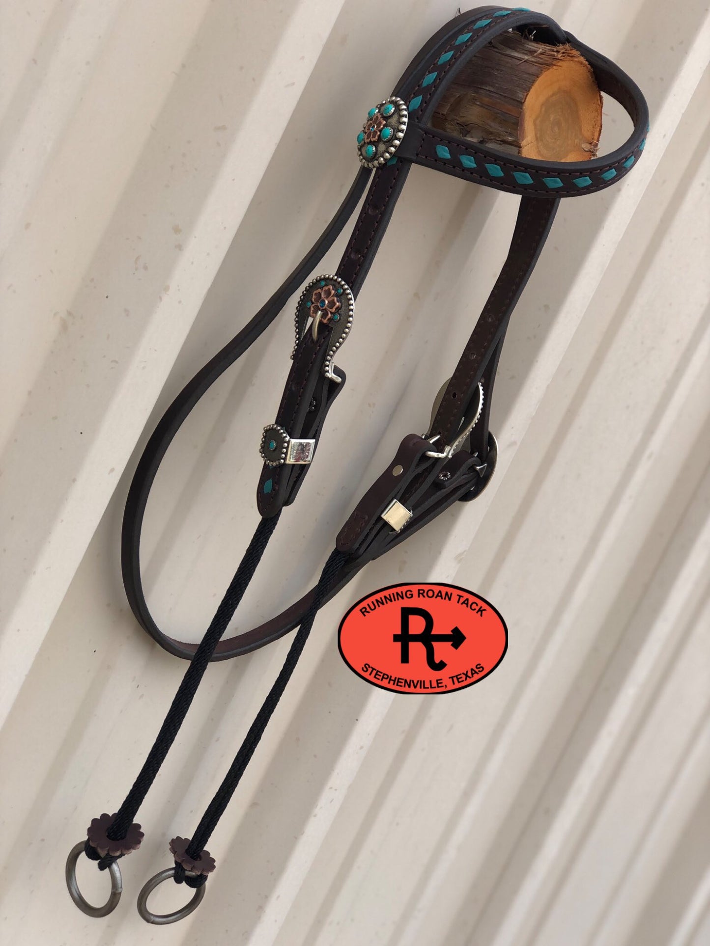 Single Ear with Throatlatch Draw Gag Bit Headstall with Turquoise Buckstitch and German Silver Hardware