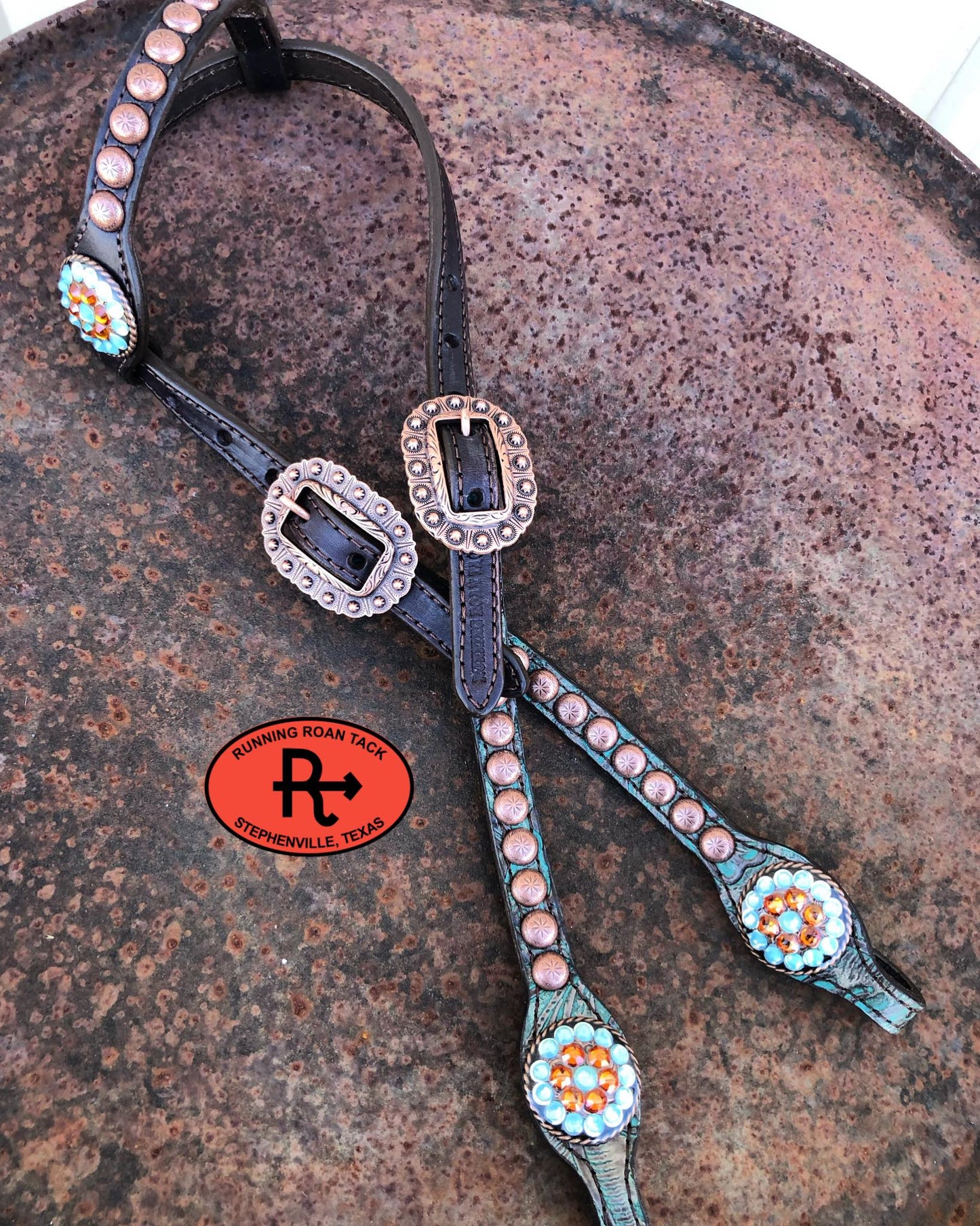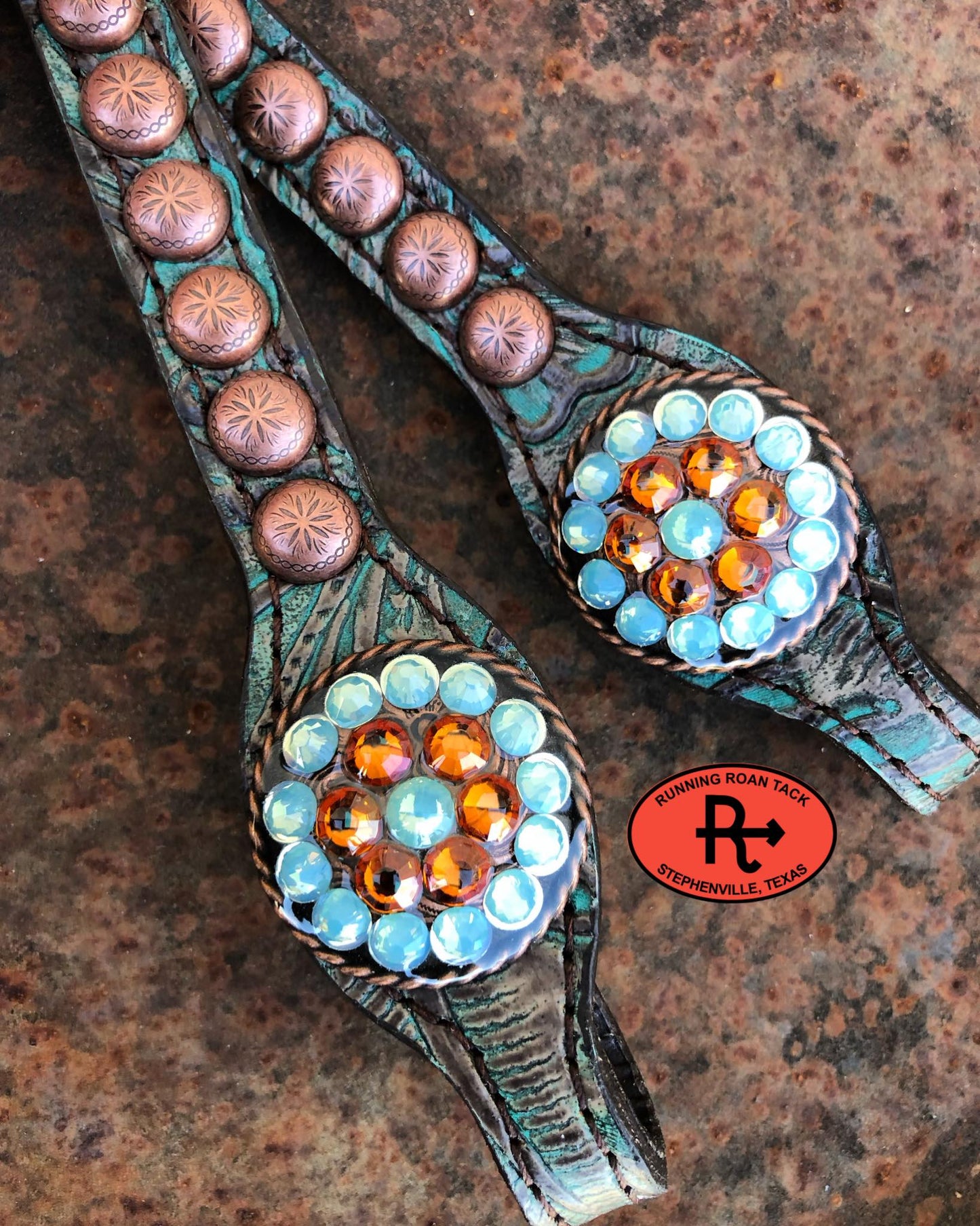 Designed and handmade by Running Roan Tack in Stephenville, Texas. Single ear headstall in our standard size. Cheeks are overlaid with teal green floral embossed leather! Features conchos with Swarovski bling. Conchos are coated in resin for durability and ease of cleaning.