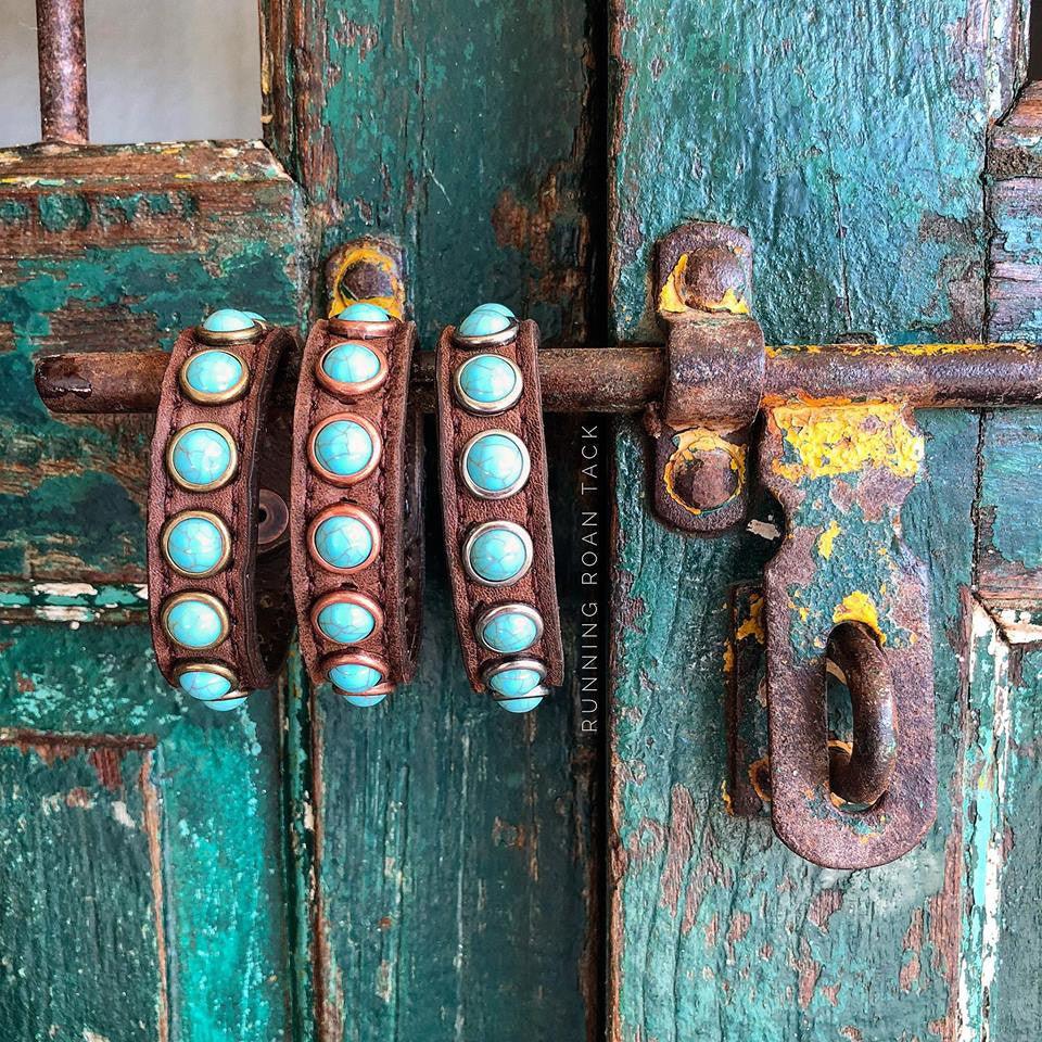 Set of three individual bracelets. Bracelets are 3/4" wide. One has 1/2" veined turquoise stones set in copper rims, another has 1/2" veined turquoise stones set in brass rims and another has 1/2" veined turquoise stones in antique silver rims. Leather lined, finished edges, snap closure. Wear them all together more mix and stack them with other bracelets. Fun and very versatile!