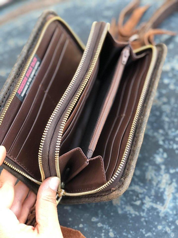 Our most popular wallet is now a crossbody! "The Pecos" functional double zipper wallet organizer by Running Roan Tack! Beautiful genuine Pendleton® wool fabric! Features TWO COMPARTMENTS that both close with heavy duty brass zippers with knotted leather pulls. Interior has tons of card slots, cash/receipt slots, zippered inner pouch for coins. Hand braided leather cross body strap is soft and comfortable to wear. Strap is removeable via heavy duty trigger snaps and measures about 58" long overall. Wallet measures 8.25" x 4.25" x 1.5" when zipped closed. Large smartphones will fit inside this wallet.