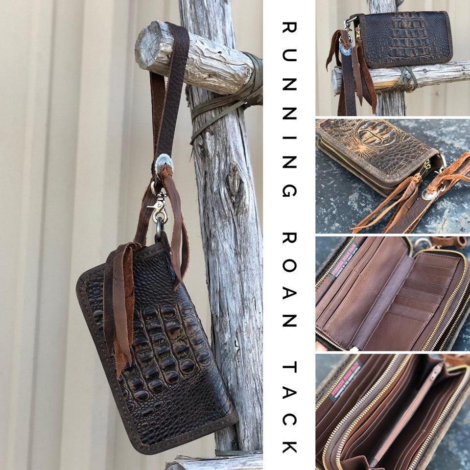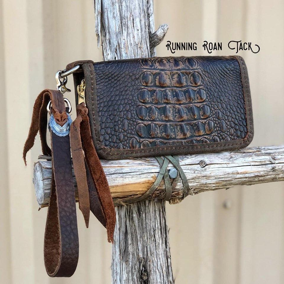 "The Pecos" Double Zip Wallet Wristlet Organizer Clutch in Dark Brown Croc with Antique Silver Conchos