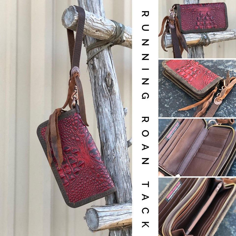 "The Pecos" Double Zip Wallet Wristlet Organizer Clutch in Red Croc with Copper Conchos by Running Roan Tack