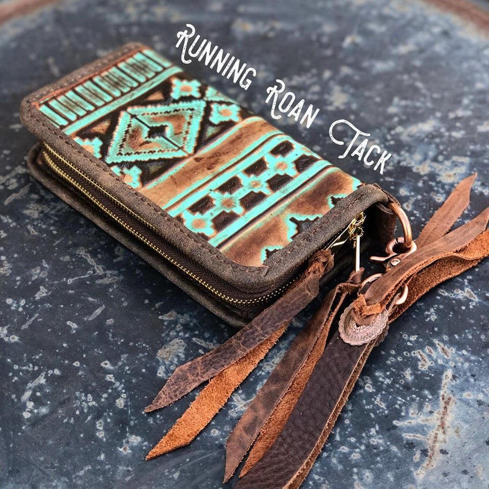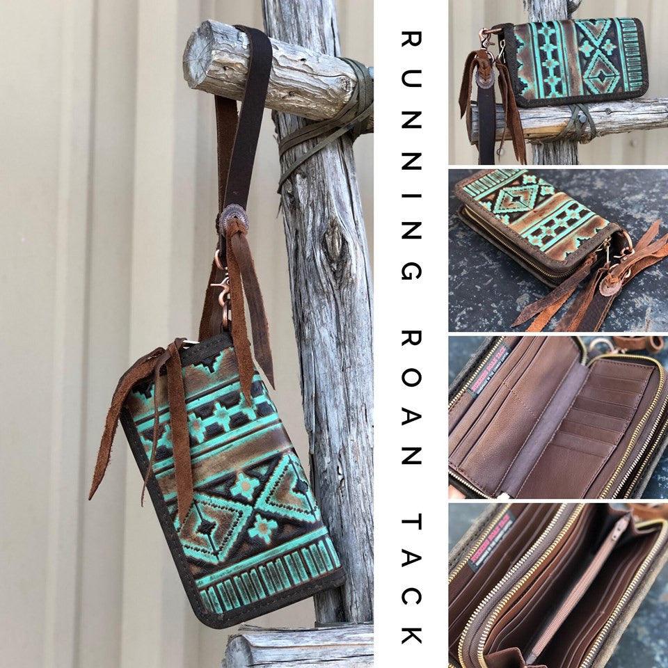 "The Pecos" functional double zipper clutch wallet wristlet organizer by Running Roan Tack! Features TWO COMPARTMENTS that both close with heavy duty brass zippers with knotted leather pulls. Interior has tons of card slots, cash/receipt slots, zippered inner pouch for coins. Removable (via trigger snap) wristlet strap with two slotted conchos (one on each side of the strap) and blood knots. Measures 8.25" x 4.25" x 1.5" when zipped closed. Large smartphones will fit inside this wallet.