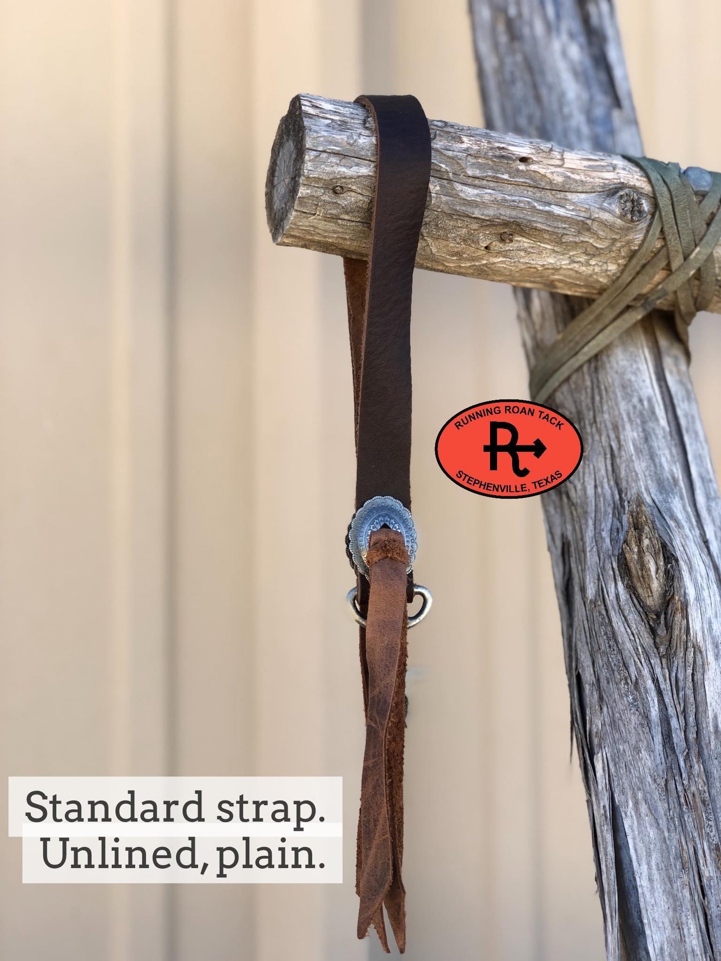 "The Pecos" comes with your choices of wristlet strap styles: standard or upgraded. The standard strap is durable, single ply bull hide with a trigger snap, two slotted conchos (one on each side) and leather ties. The upgraded strap is doubled and stitched bull hide with large dots, trigger snap, two slotted conchos (one on each side) and leather ties.