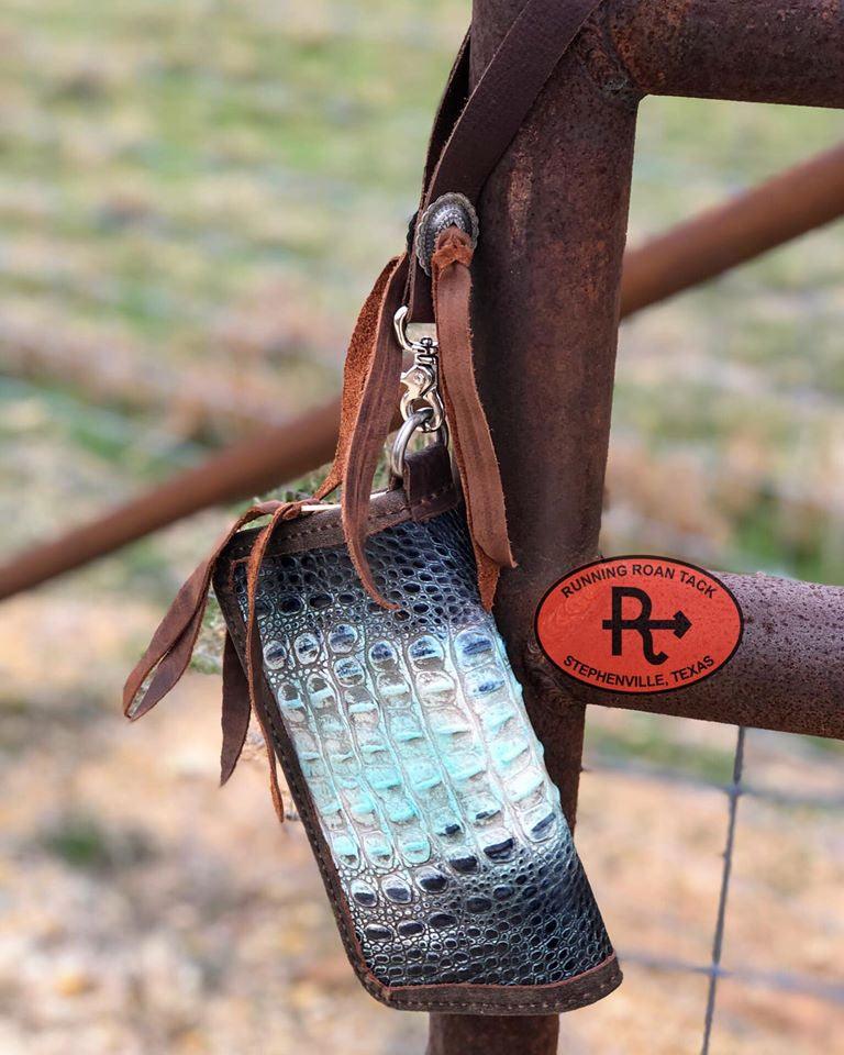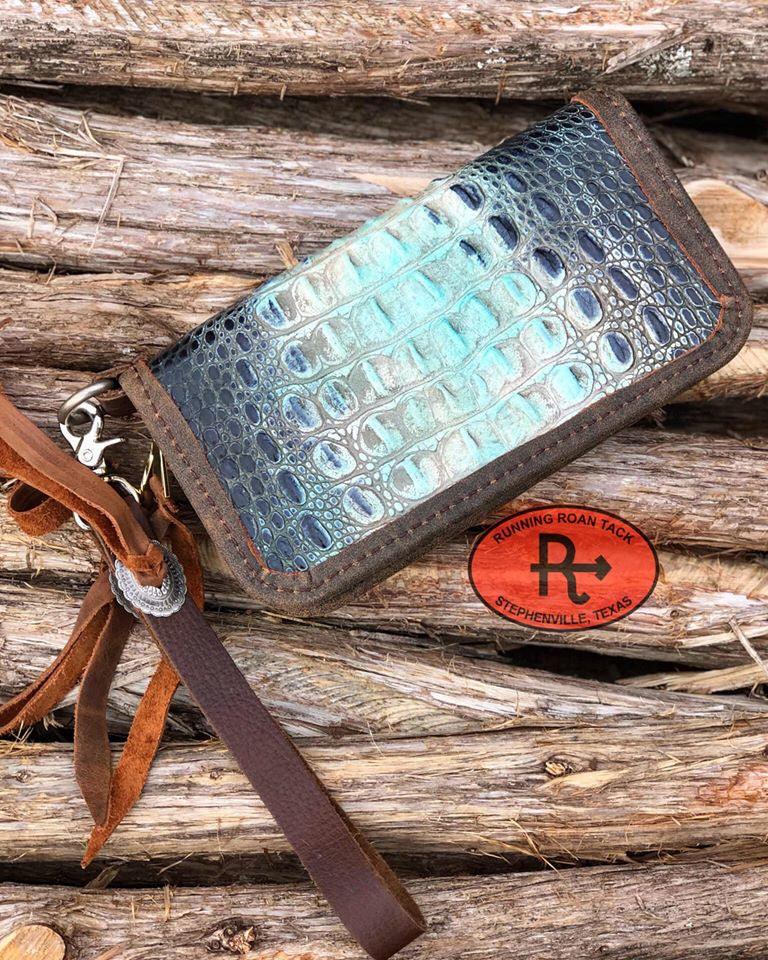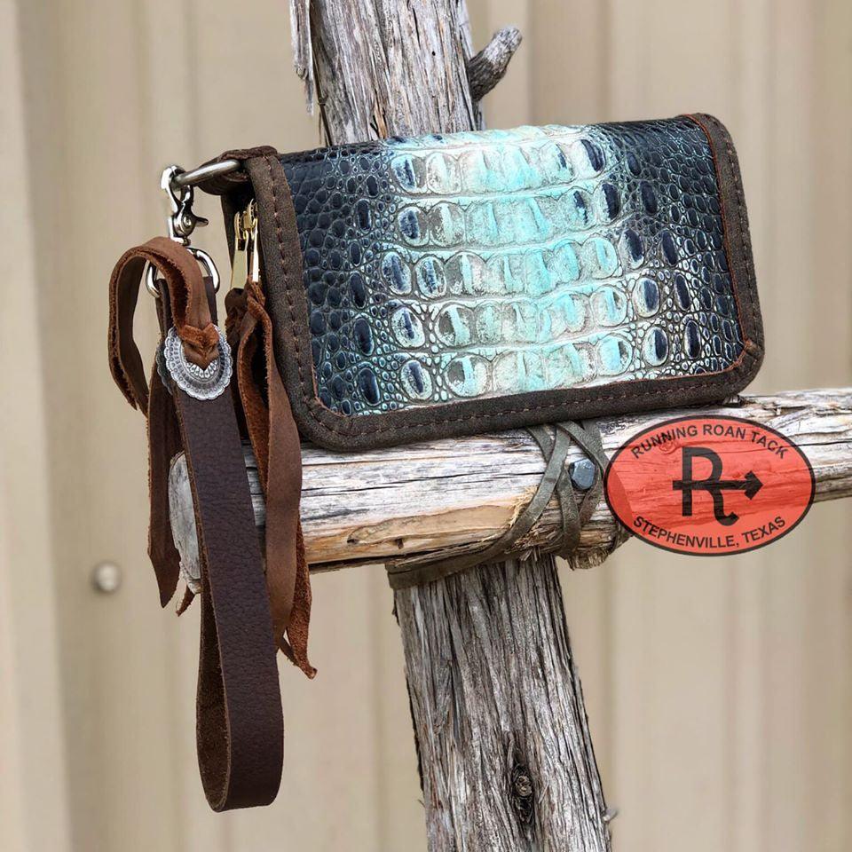 "The Pecos" functional double zipper clutch wallet organizer wristlet by Running Roan Tack! Features TWO COMPARTMENTS that both close with heavy duty brass zippers with knotted leather pulls. Interior has tons of card slots, cash/receipt slots, zippered inner pouch for coins. Removable (via trigger snap) wristlet strap with two slotted conchos (one on each side of the strap) and blood knots. Measures 8.25" x 4.25" x 1.5" when zipped closed. Large smartphones will fit inside this wallet.