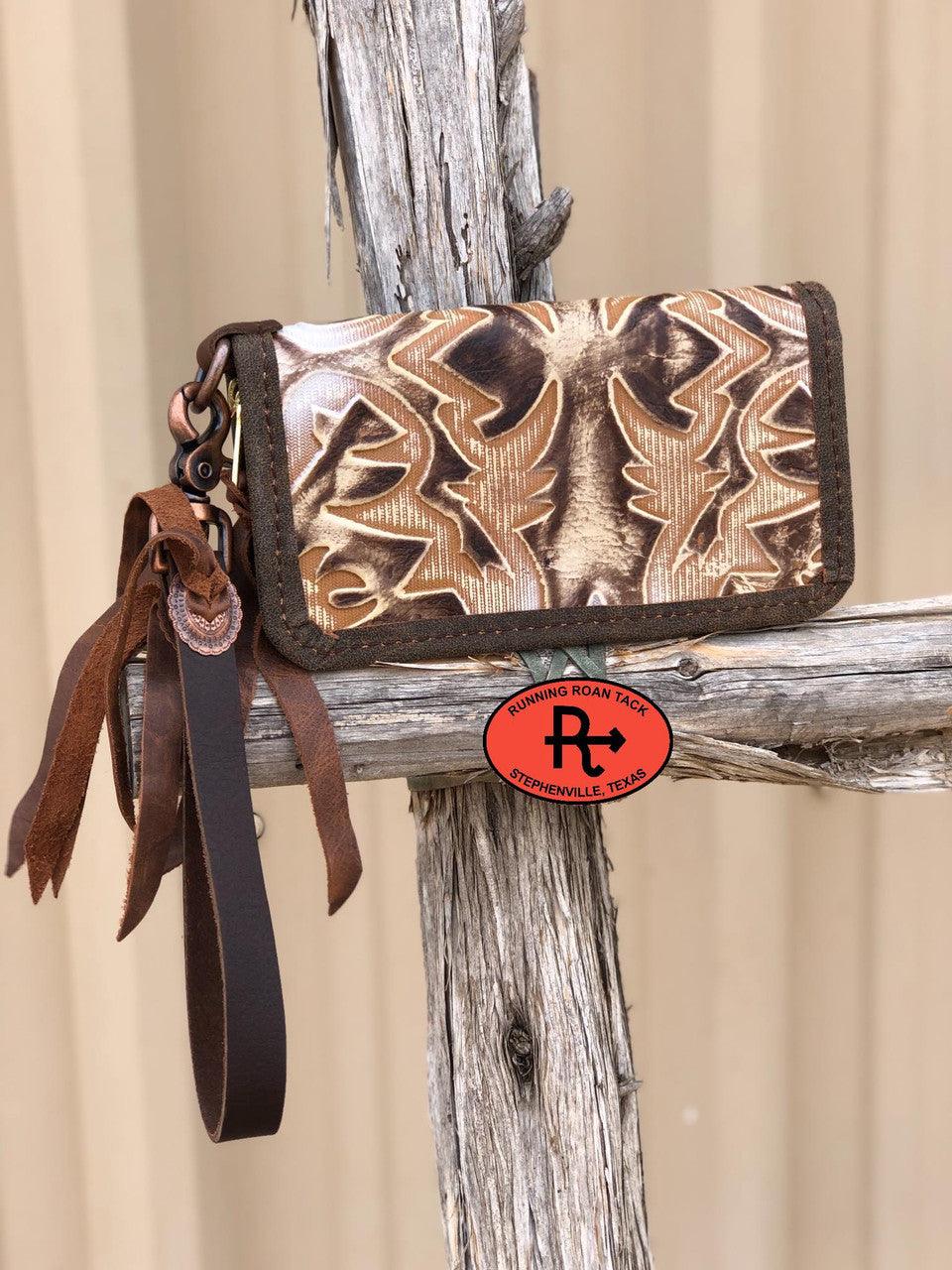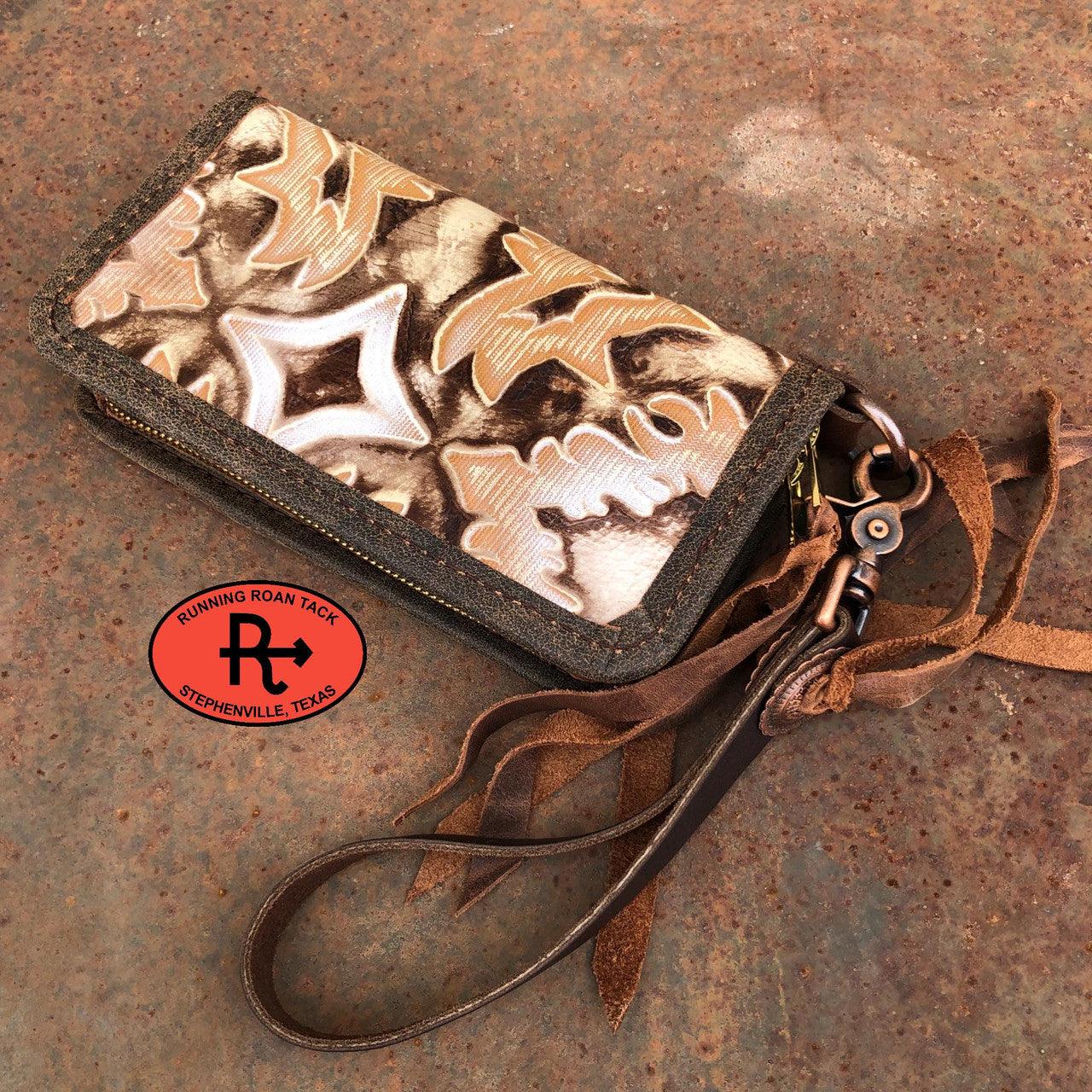 "The Pecos" functional double zipper clutch wallet organizer wristlet by Running Roan Tack! Features TWO COMPARTMENTS that both close with heavy duty brass zippers with knotted leather pulls. Interior has tons of card slots, cash/receipt slots, zippered inner pouch for coins. Removable (via trigger snap) wristlet strap with two slotted conchos (one on each side of the strap) and blood knots. Measures 8.25" x 4.25" x 1.5" when zipped closed. Large smartphones will fit inside this wallet.